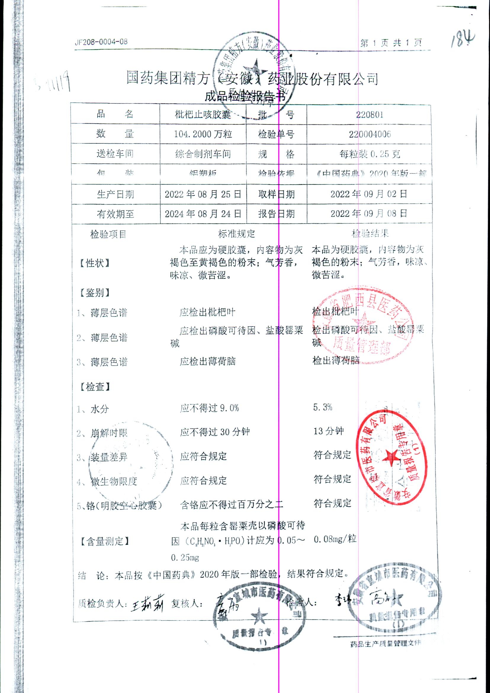 | 枇杷止咳膠囊 | 0.25g | 220801 | 查看詳情 |