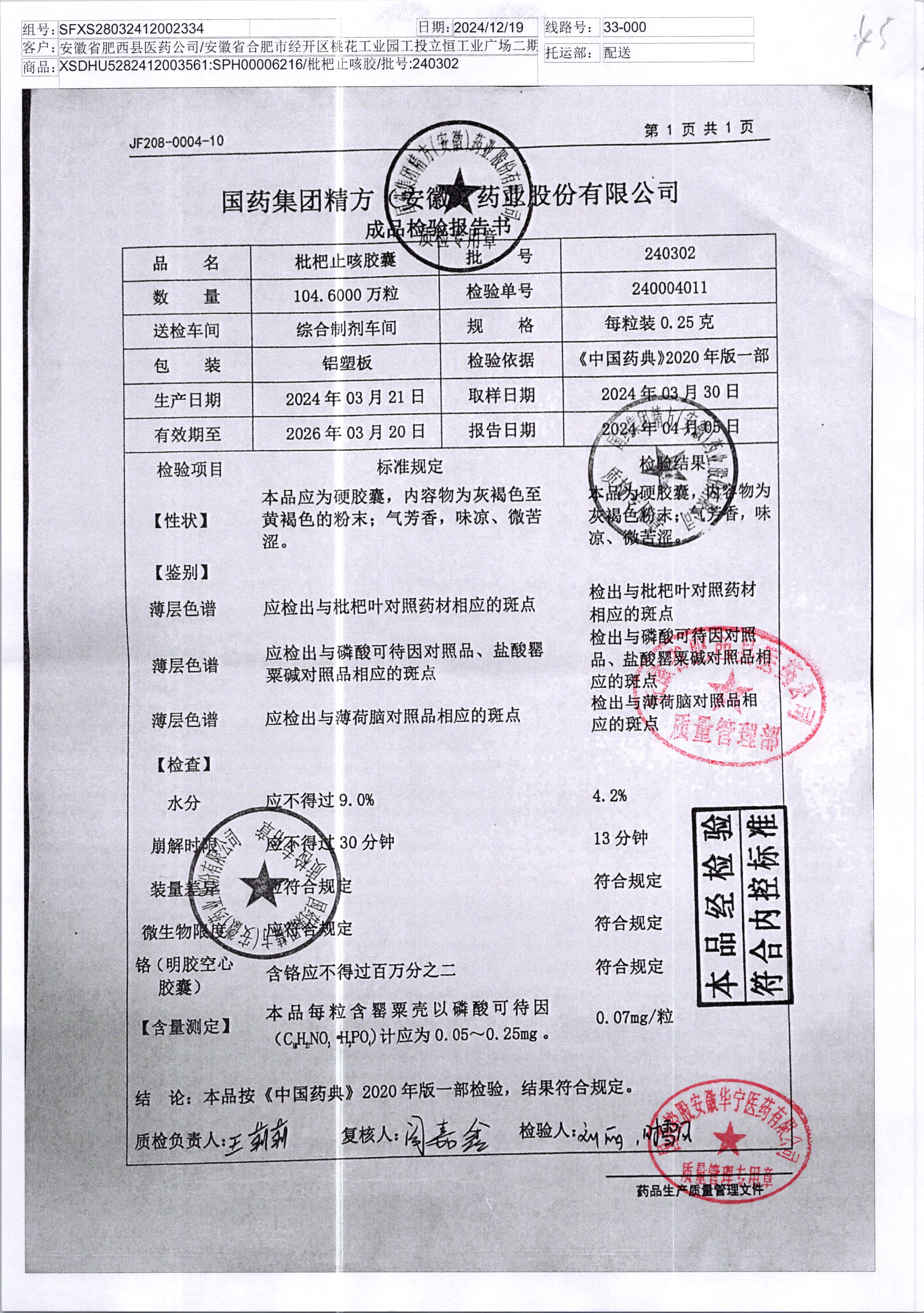 | 枇杷止咳膠囊 | 0.25g | 240302 | 查看詳情 |