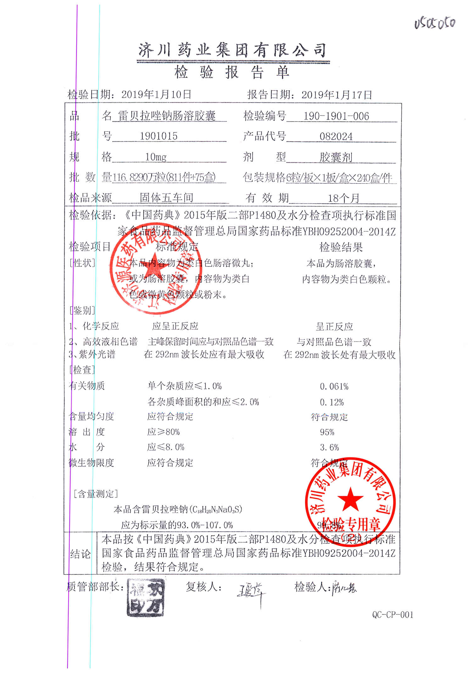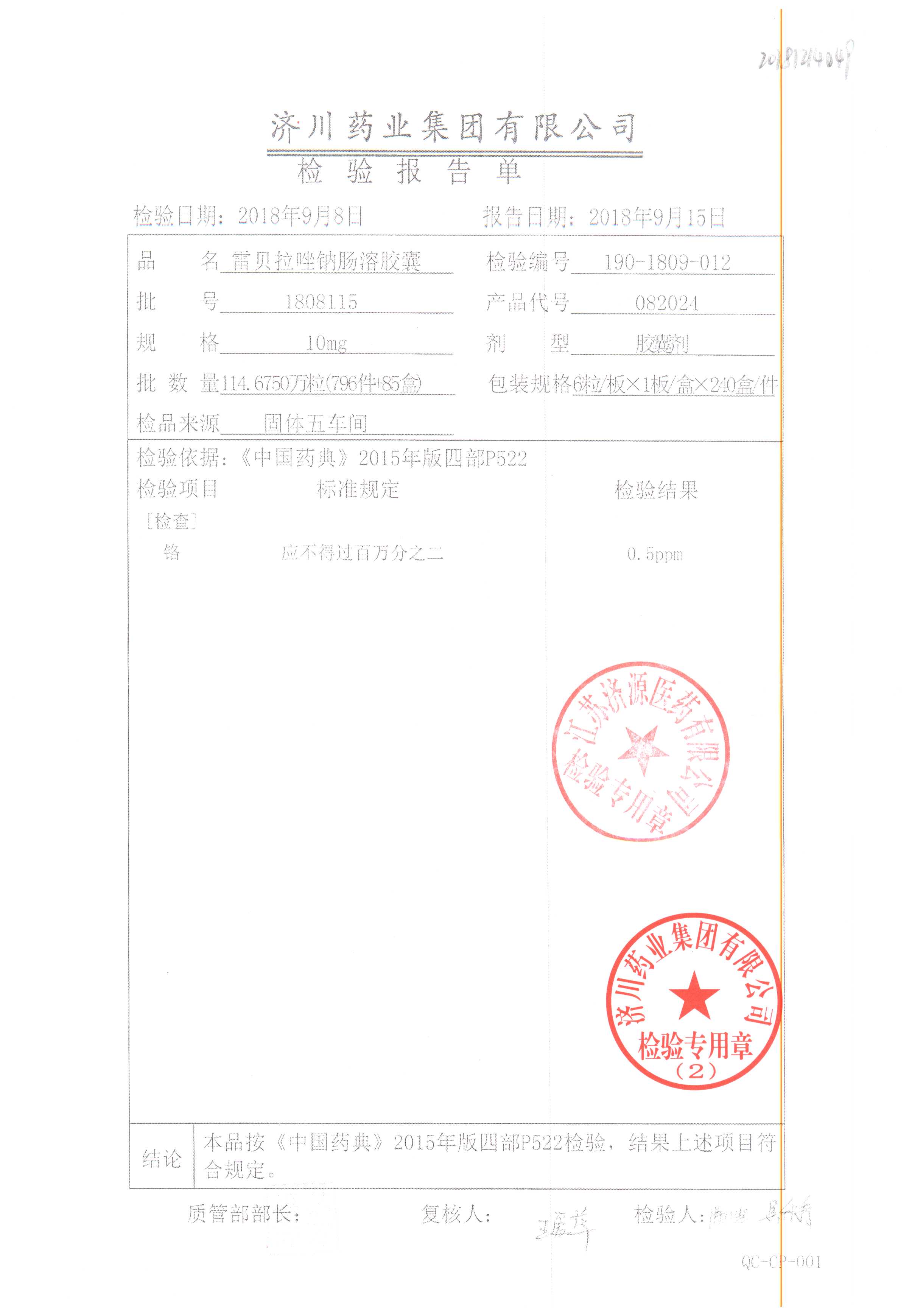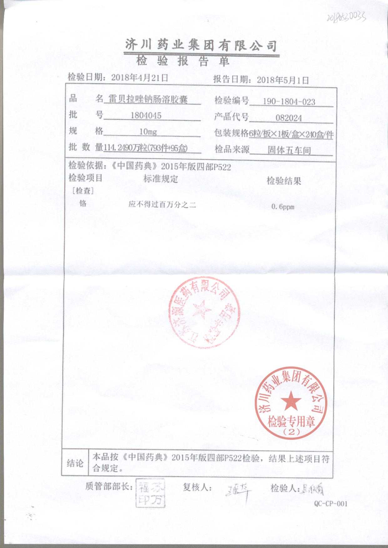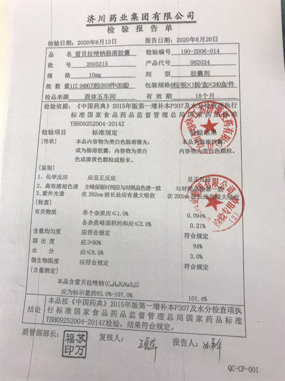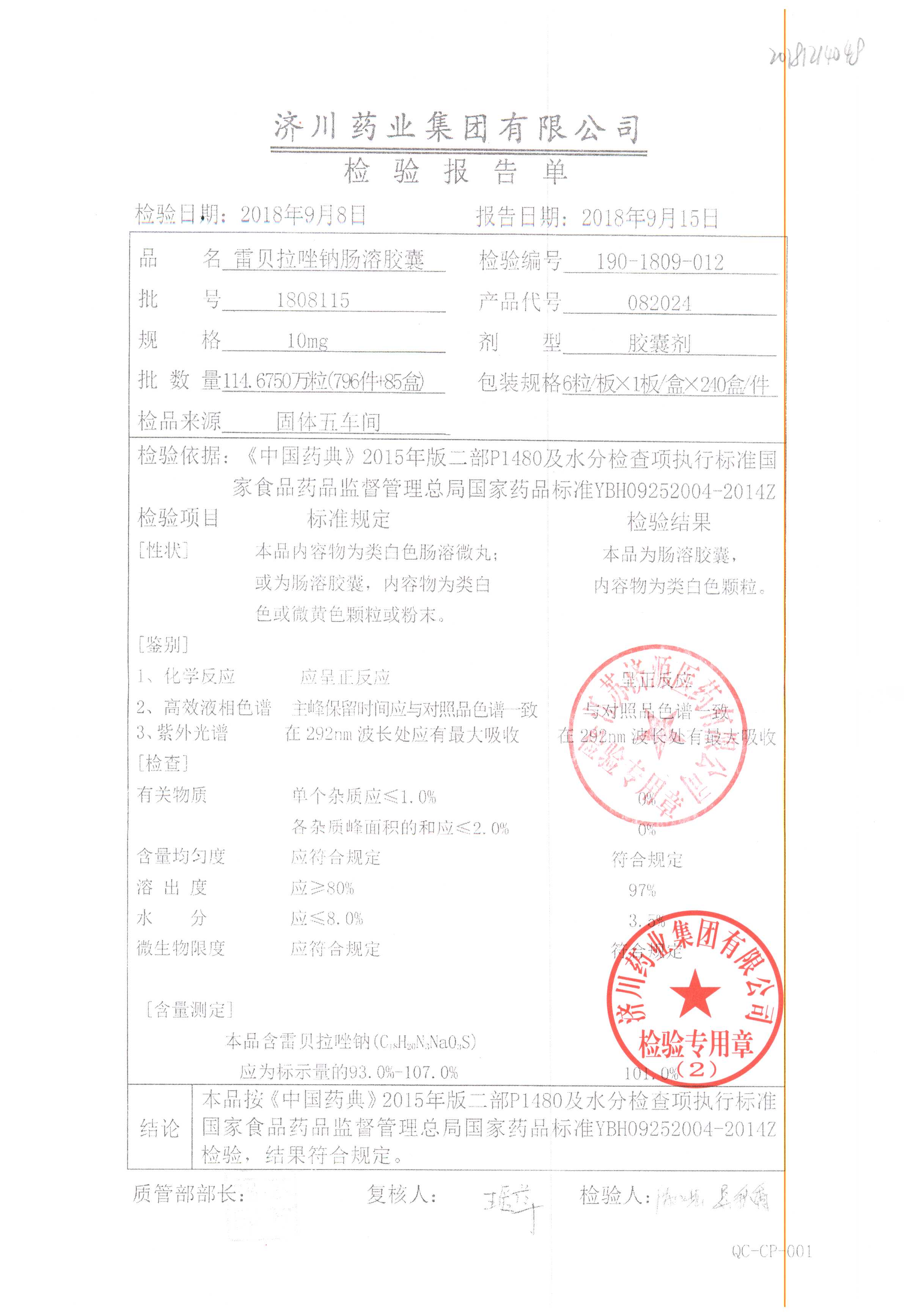 | 雷貝拉唑鈉腸溶膠囊 | 10mg*6粒 | 1903105(2/2) | 查看詳情 |