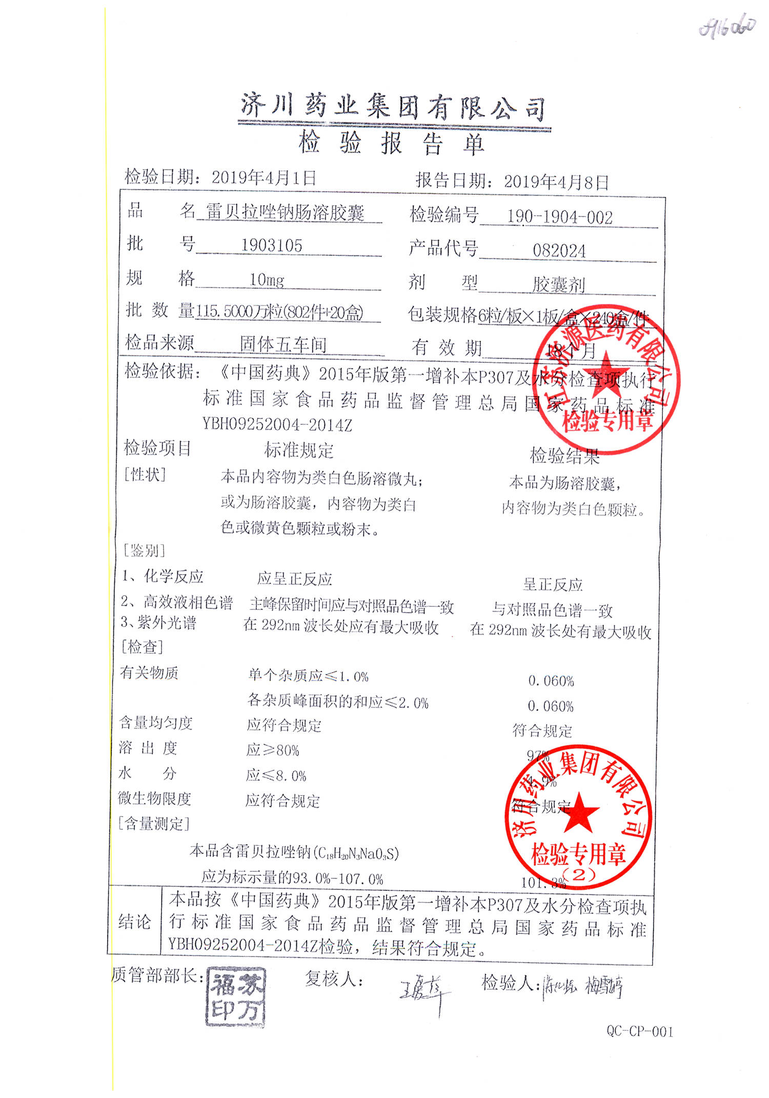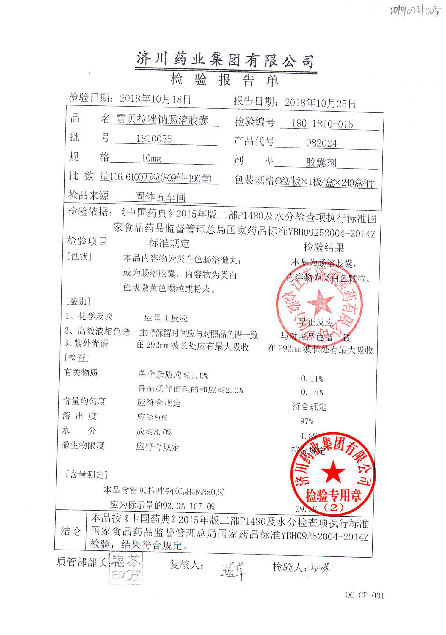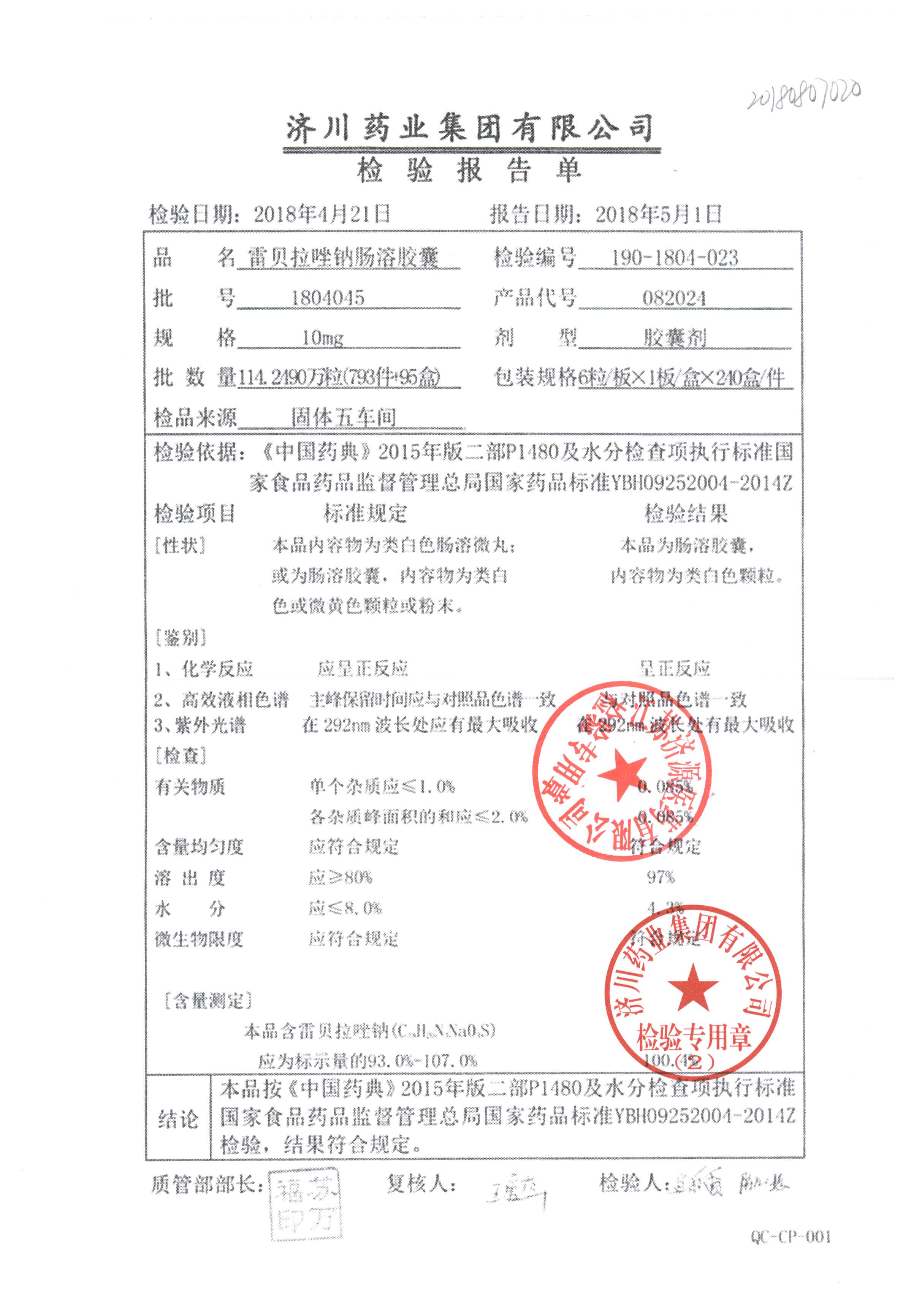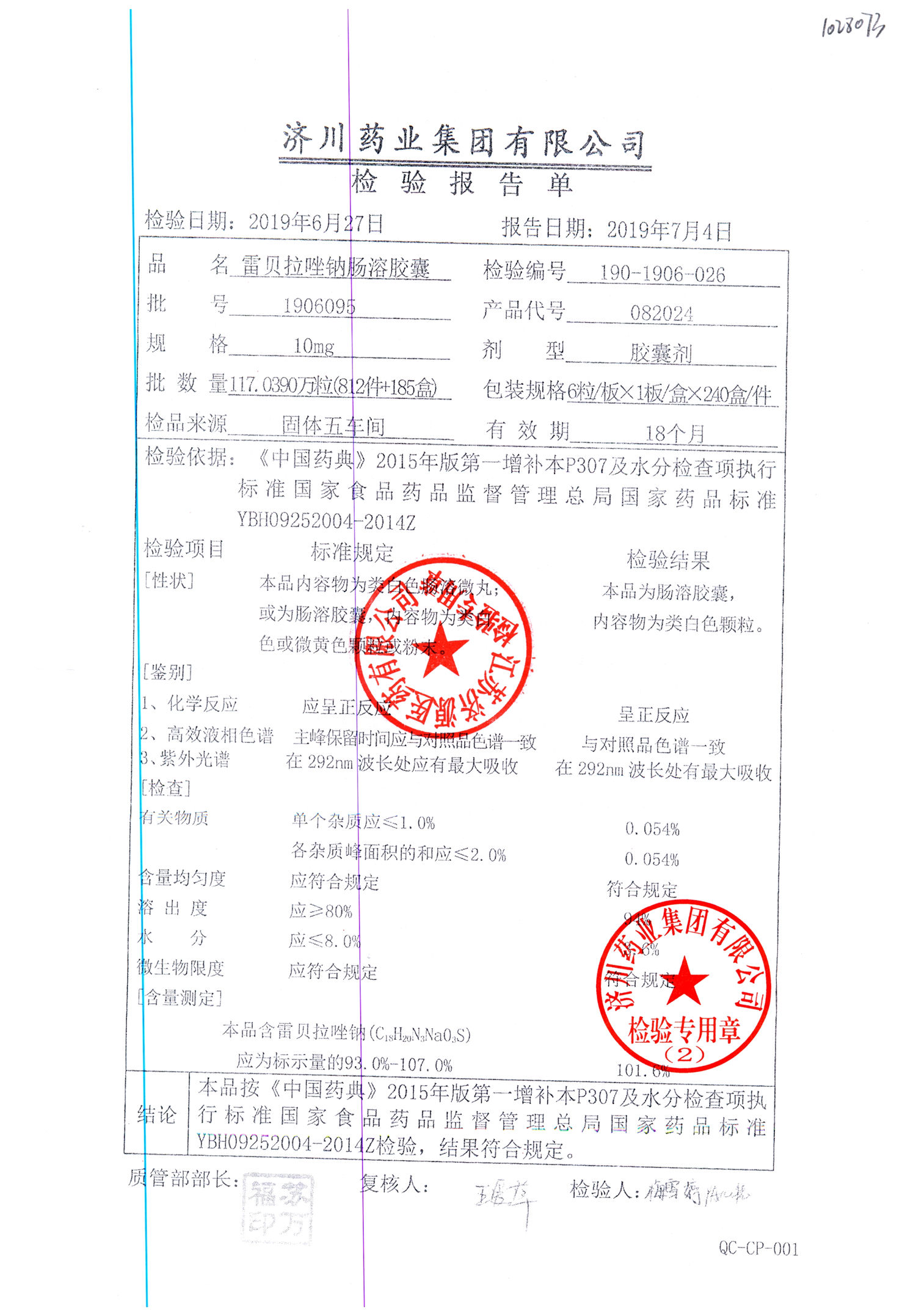 | 雷貝拉唑鈉腸溶膠囊 | 10mg*6粒 | 1903105(2/2) | 查看詳情 |