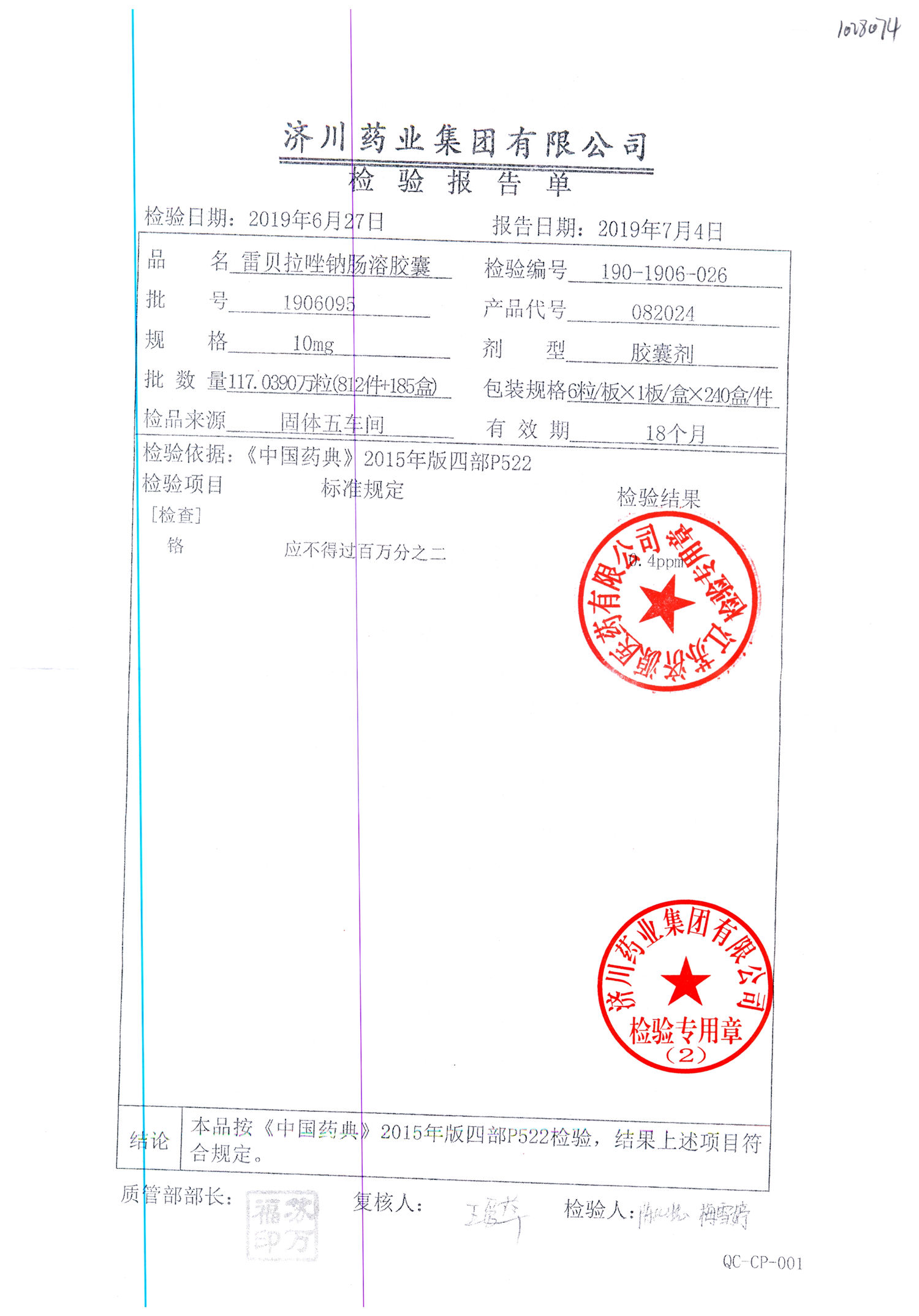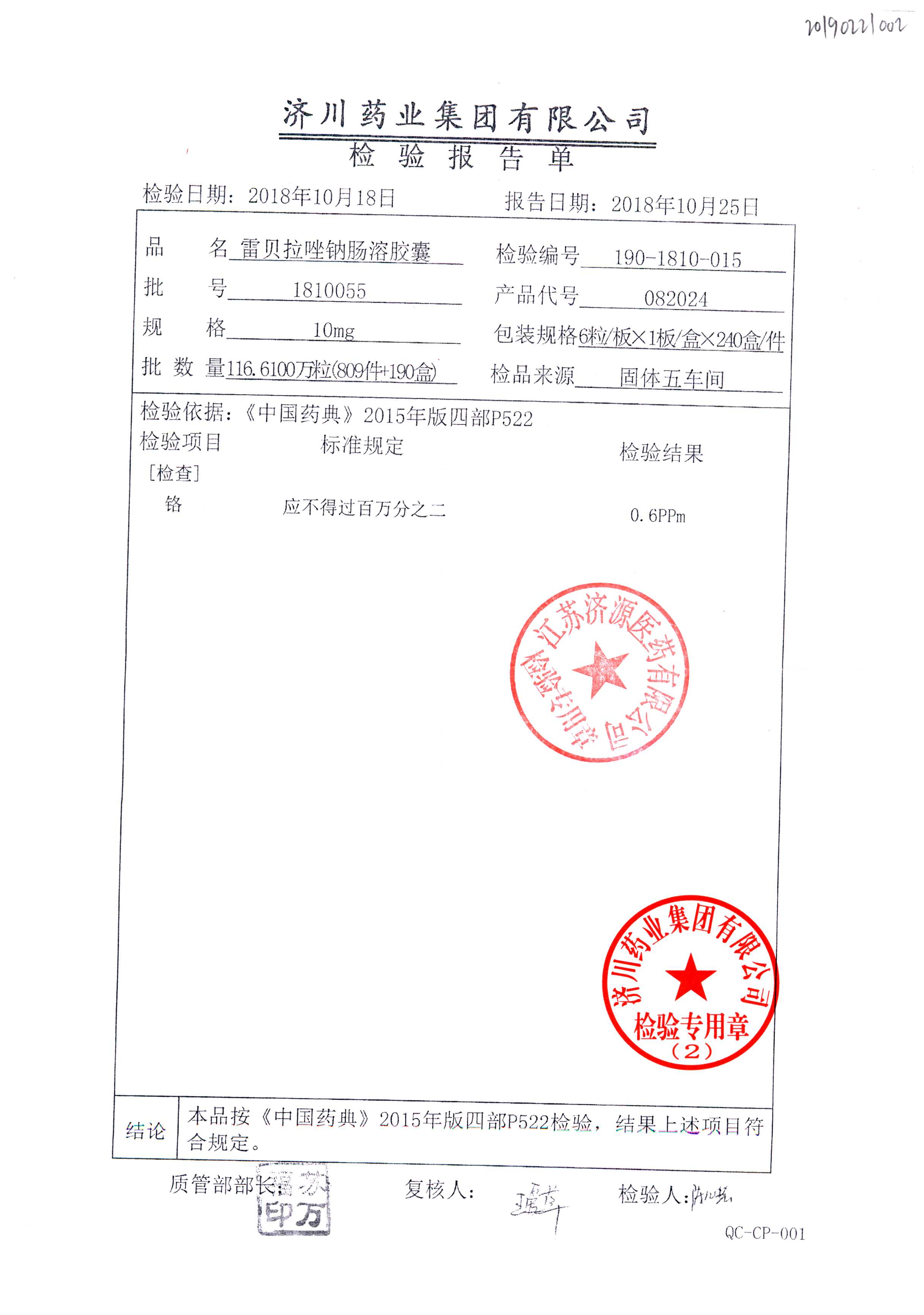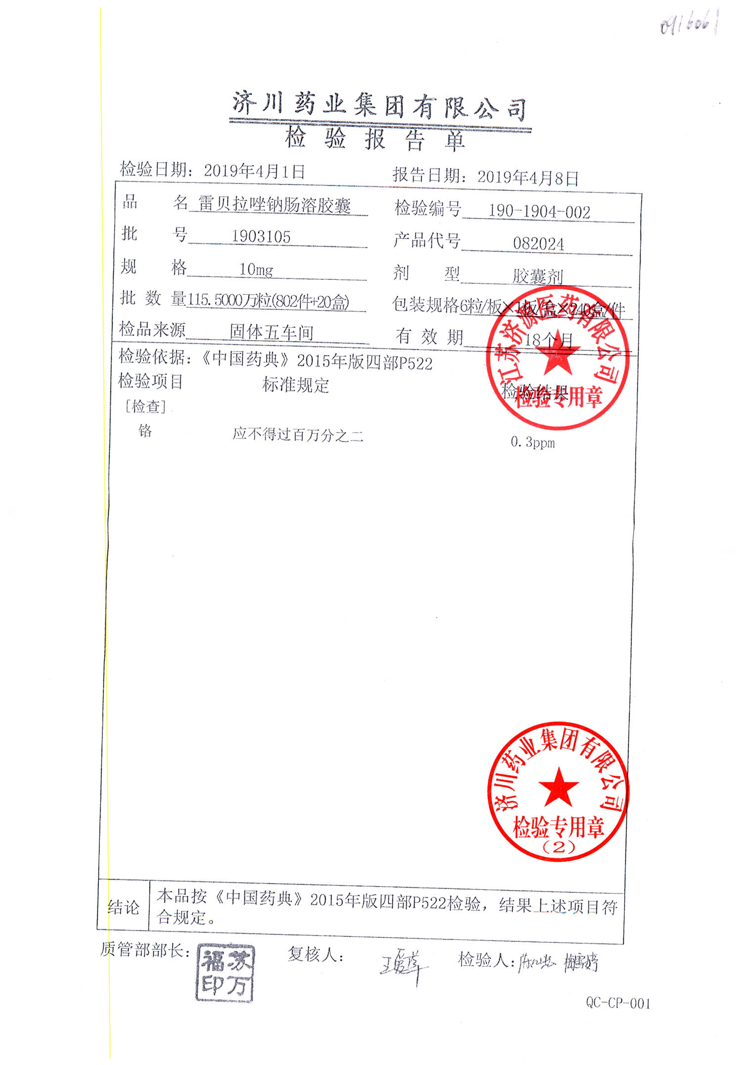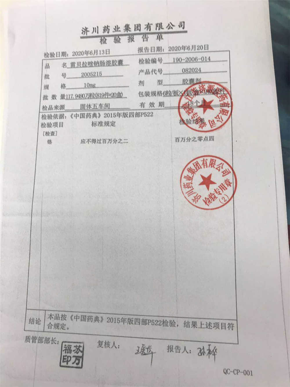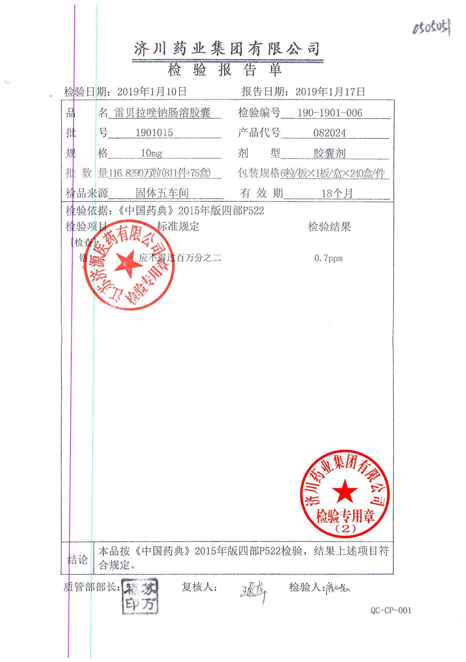 | 雷貝拉唑鈉腸溶膠囊 | 10mg*6粒 | 1903105(2/2) | 查看詳情 |