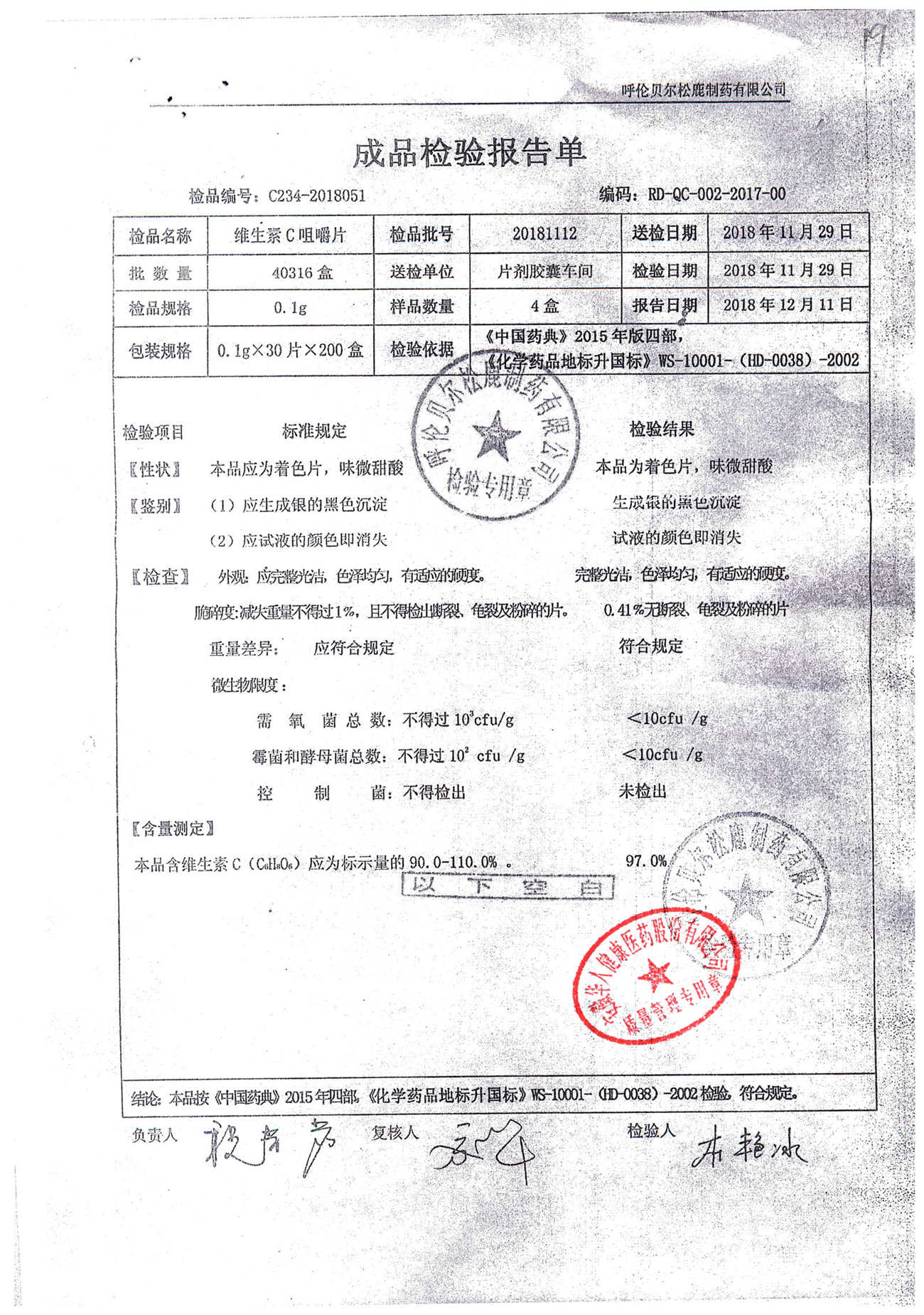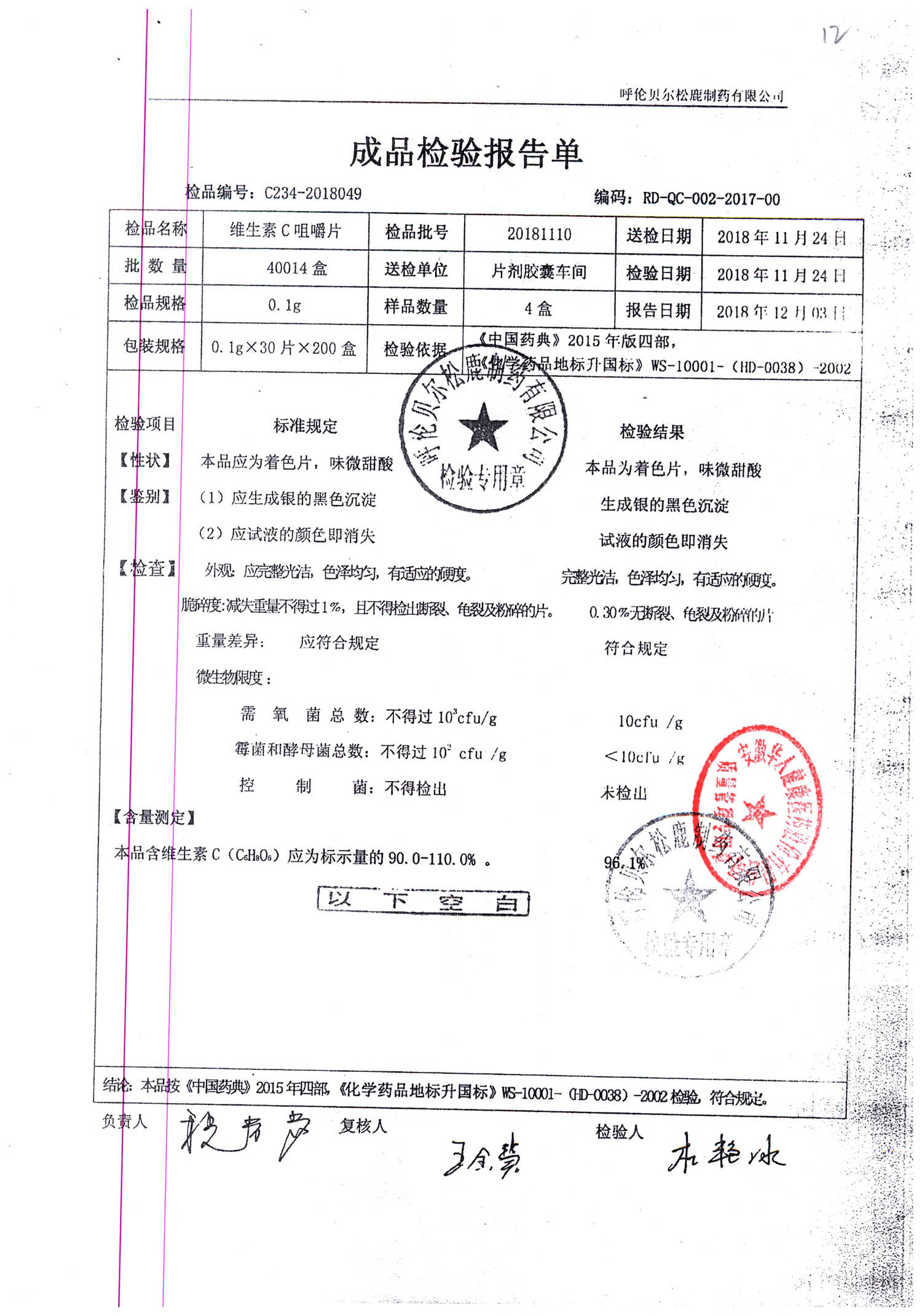 | 維生素C咀嚼片 | 0.1g*30s | 20181112 | 查看詳情 |