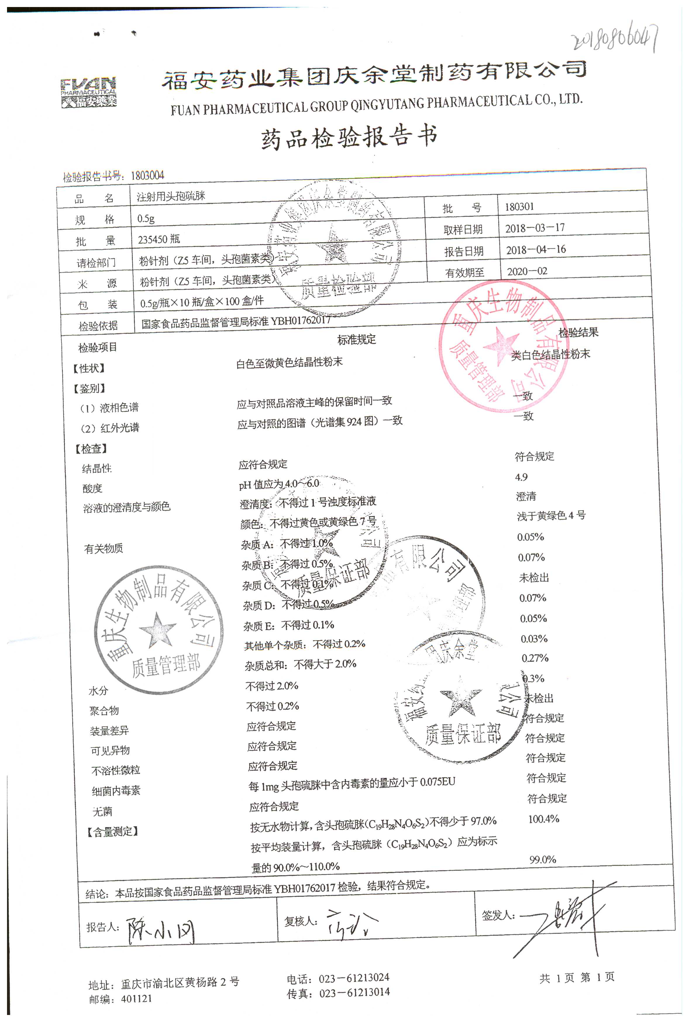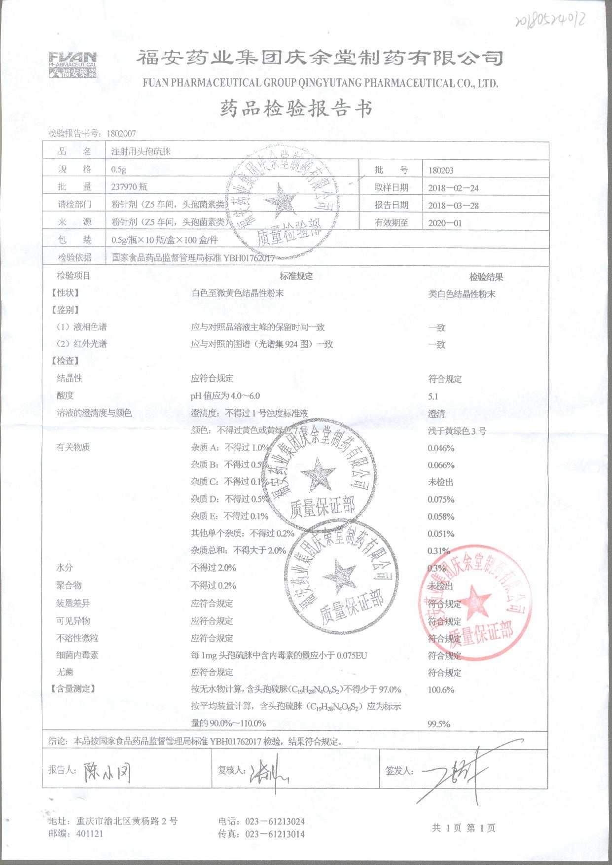 注射用頭孢硫脒 0.5g 180201 查看詳情