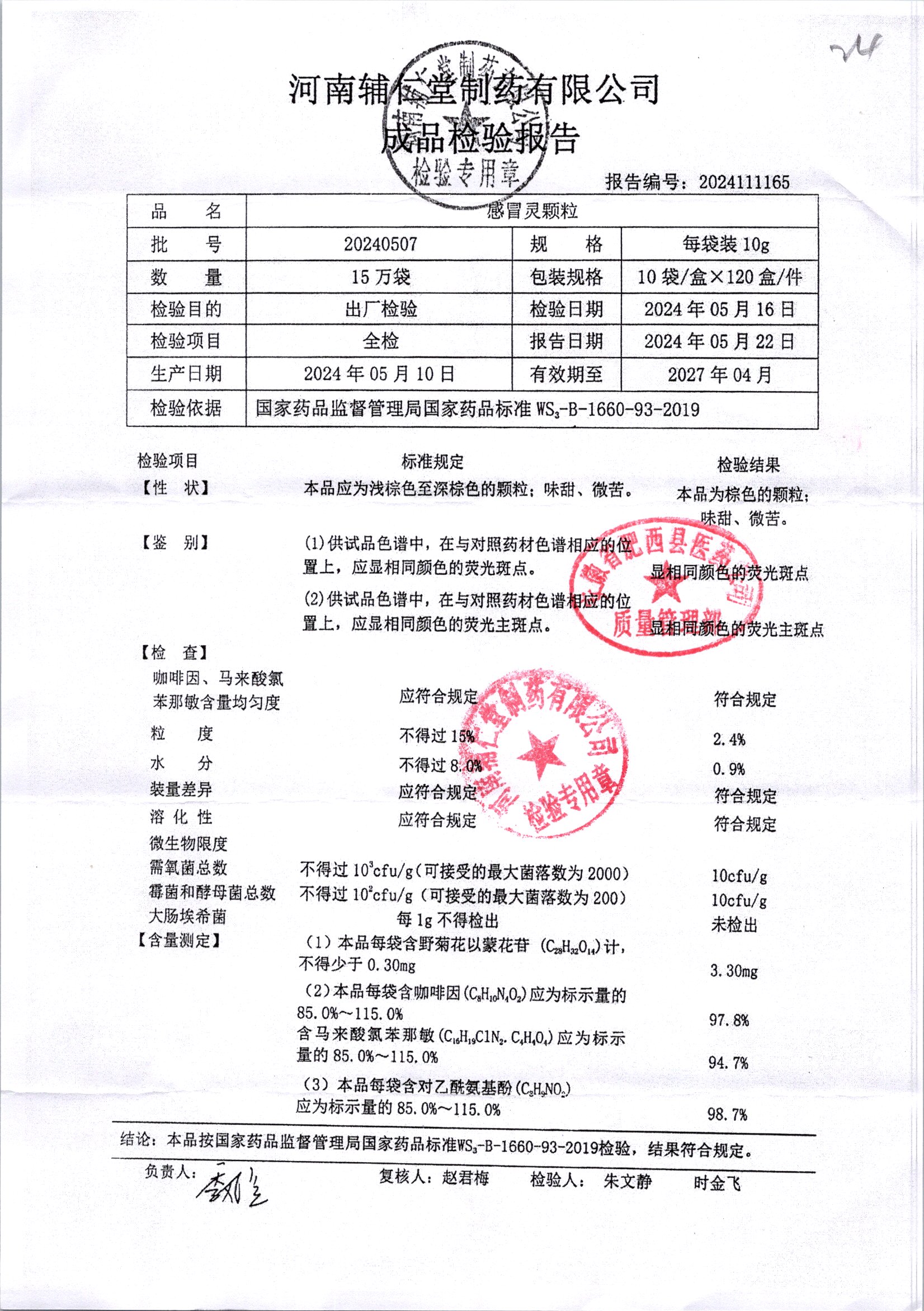 | 感冒靈顆粒 | 10g*10袋 | 20240507 | 查看詳情 |