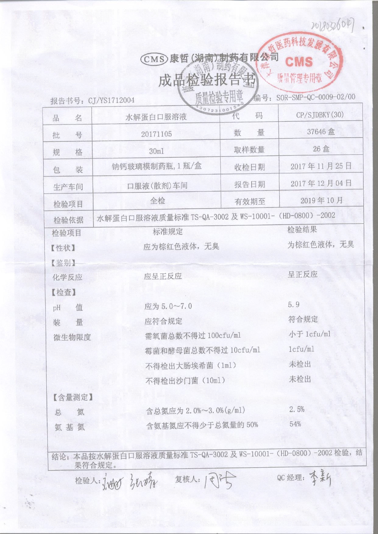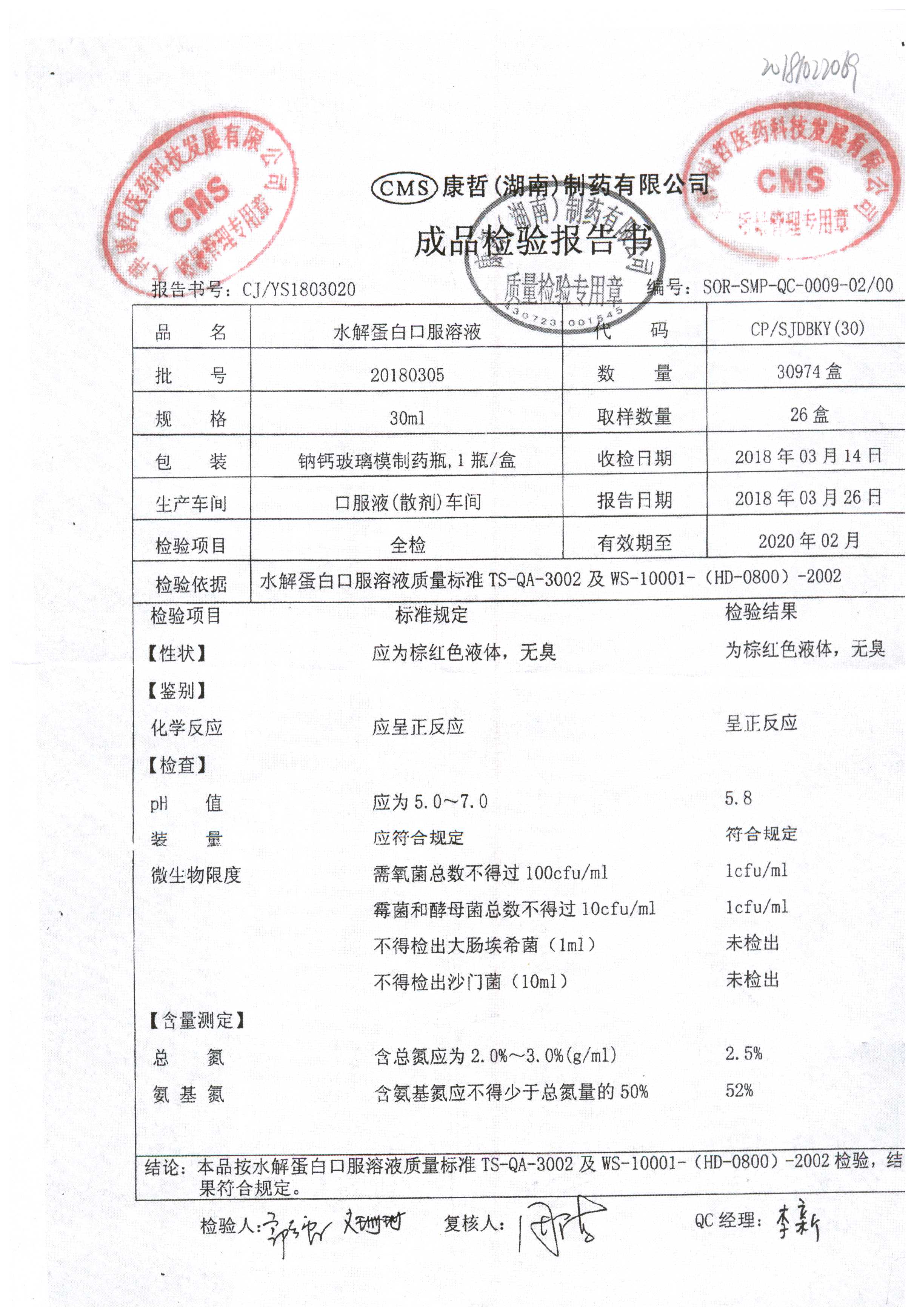 | 水解蛋白口服溶液 | 30ml | 20181103 | 查看詳情 |