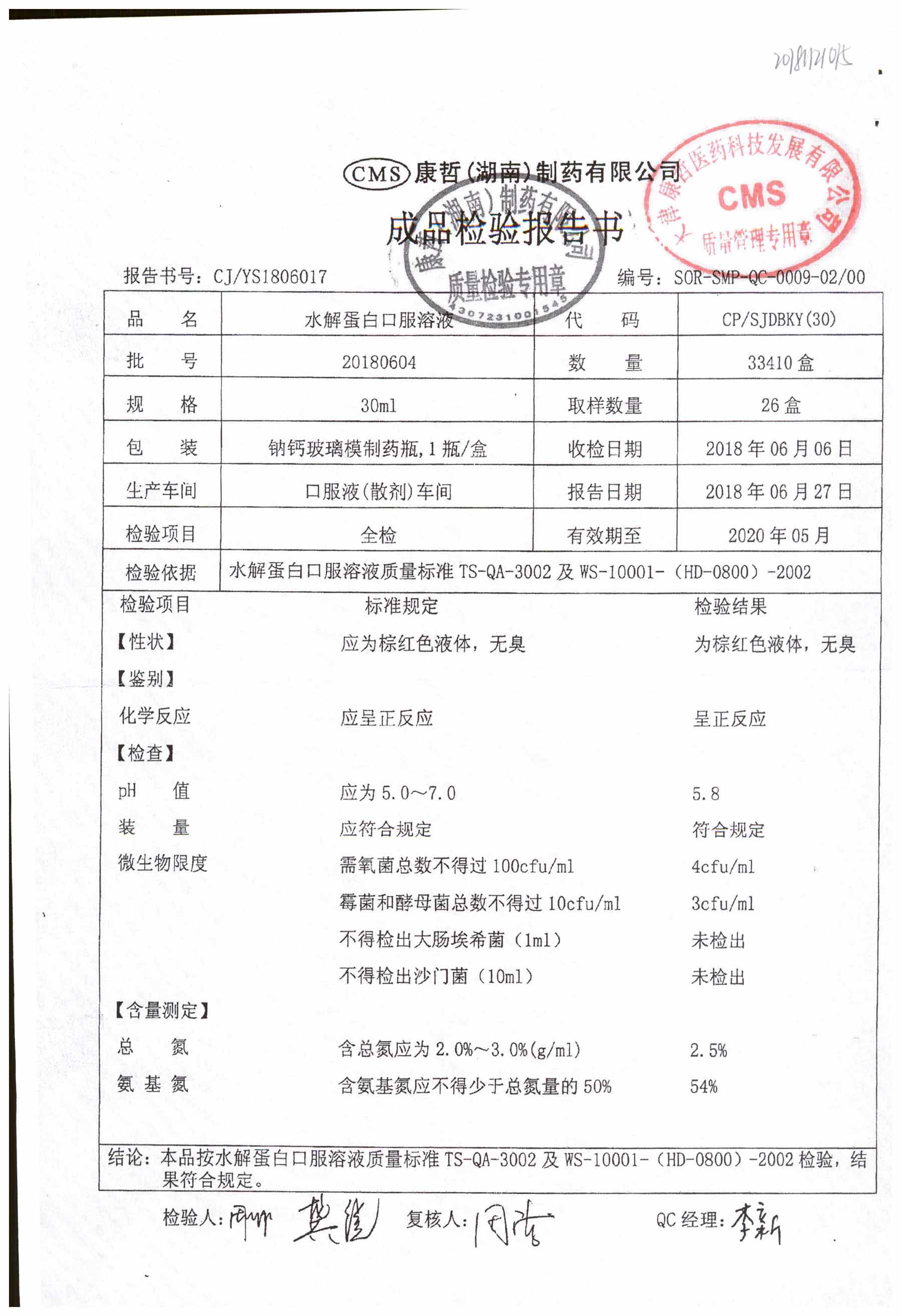 | 水解蛋白口服溶液 | 30ml | 20180604 | 查看詳情 |