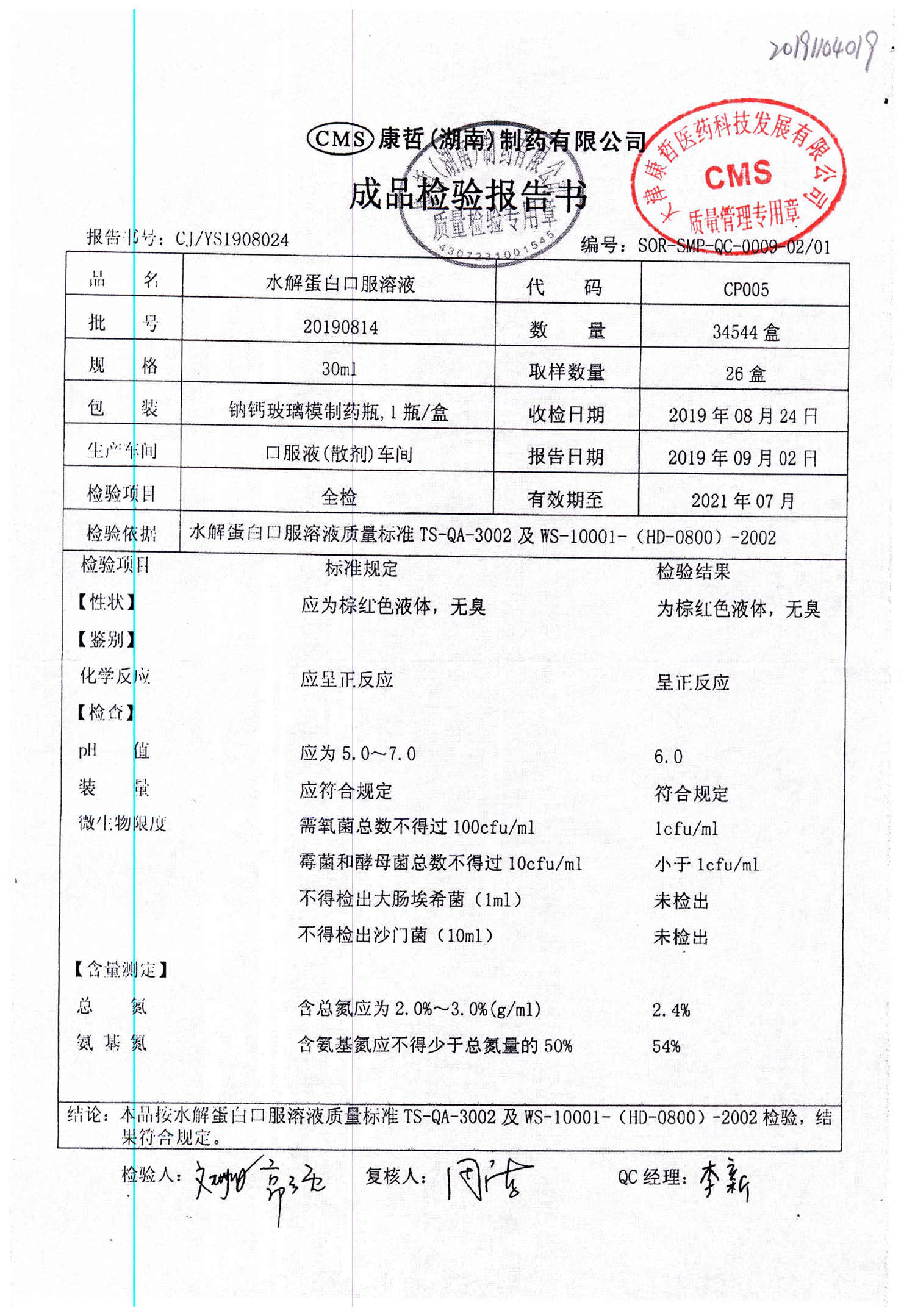 | 水解蛋白口服溶液 | 30ml | 20191009 | 查看詳情 |