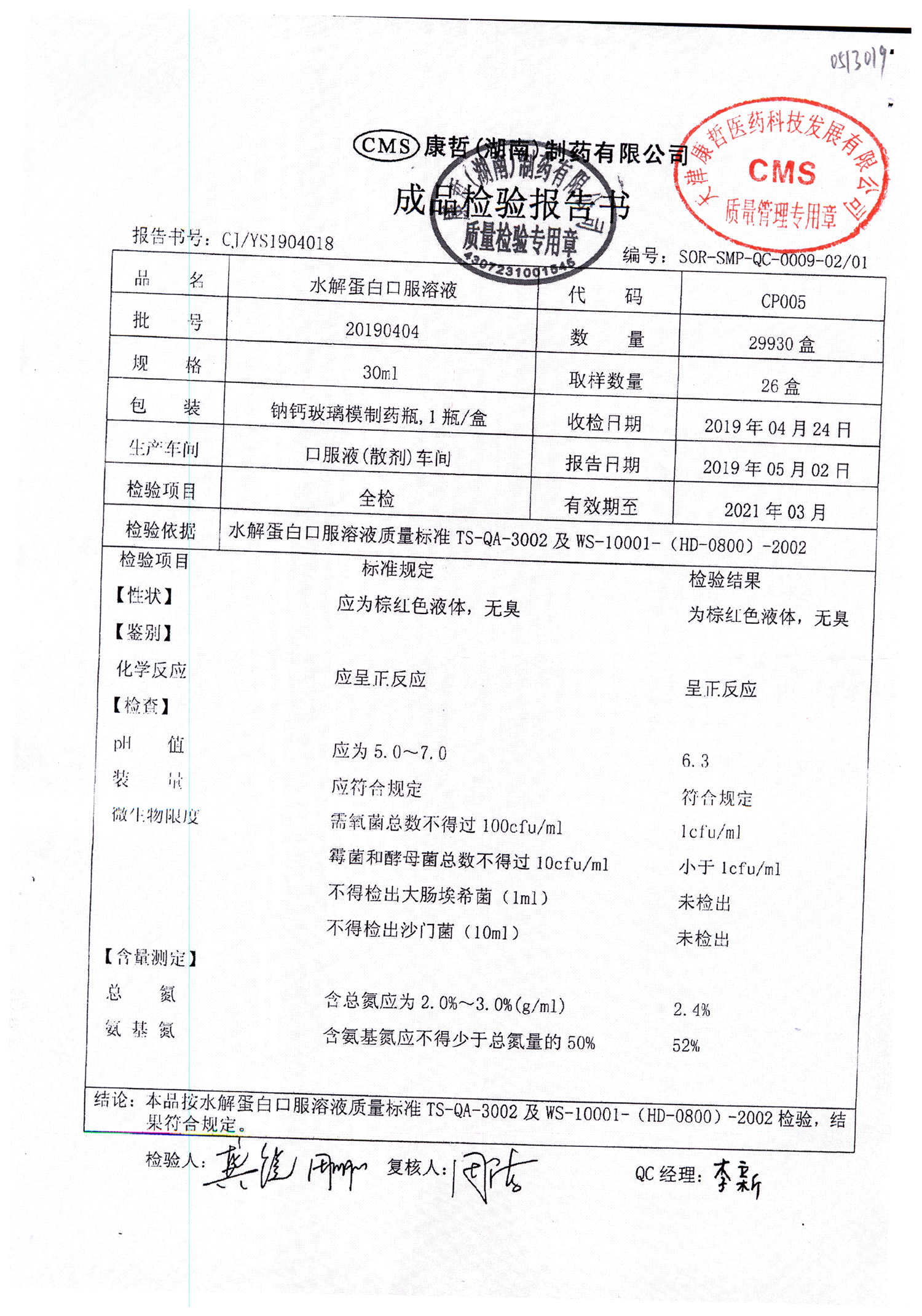 | 水解蛋白口服溶液 | 30ml | 20190404 | 查看詳情 |