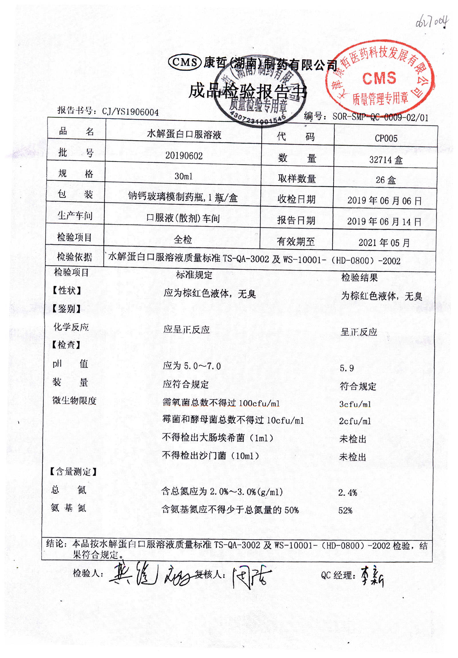 | 水解蛋白口服溶液 | 30ml | 20190602 | 查看詳情 |