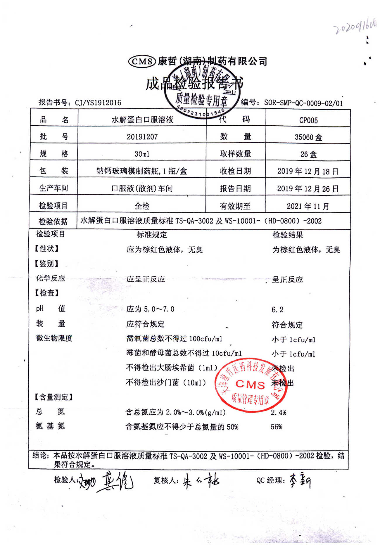 | 水解蛋白口服溶液 | 30ml | 20191207 | 查看詳情 |