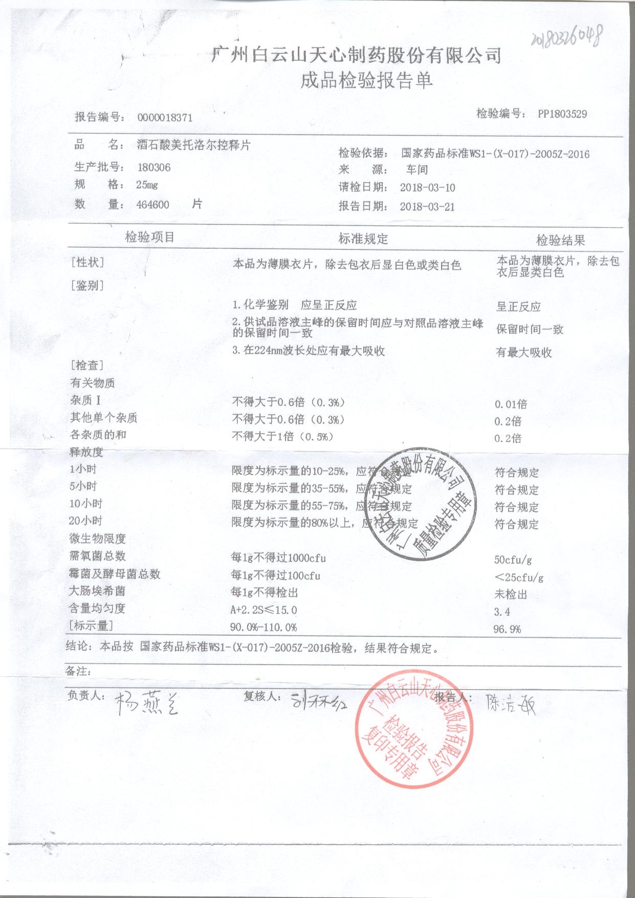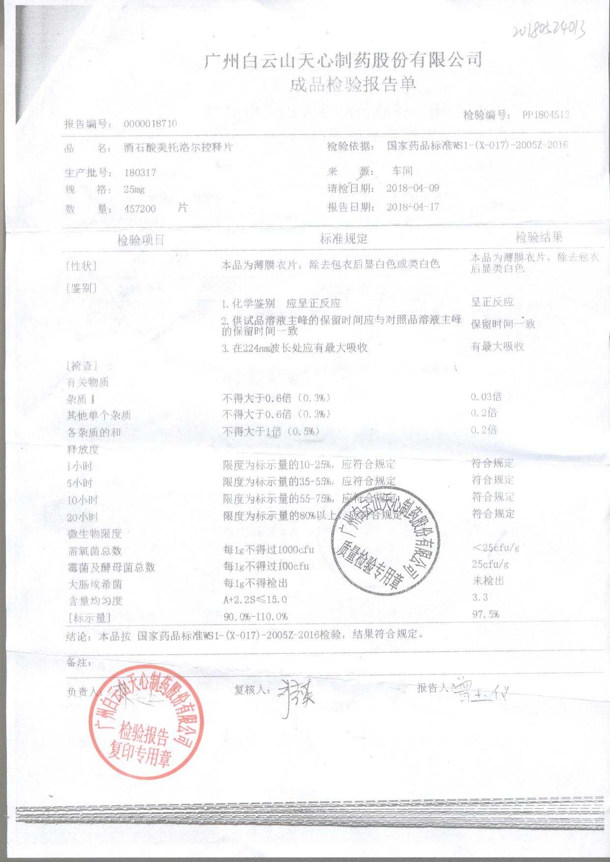 酒石酸美托洛爾控釋片 25mg 180501 查看詳情