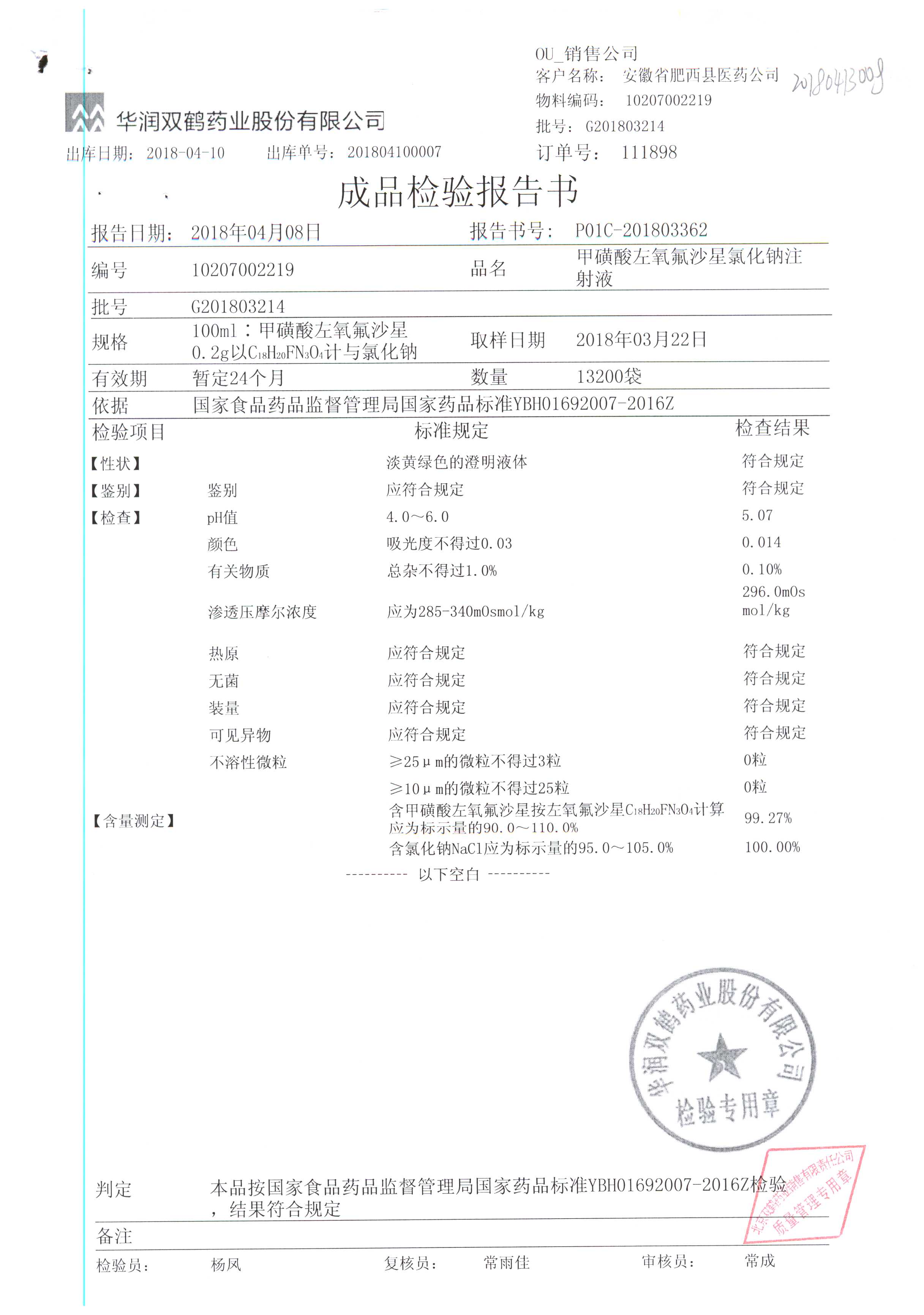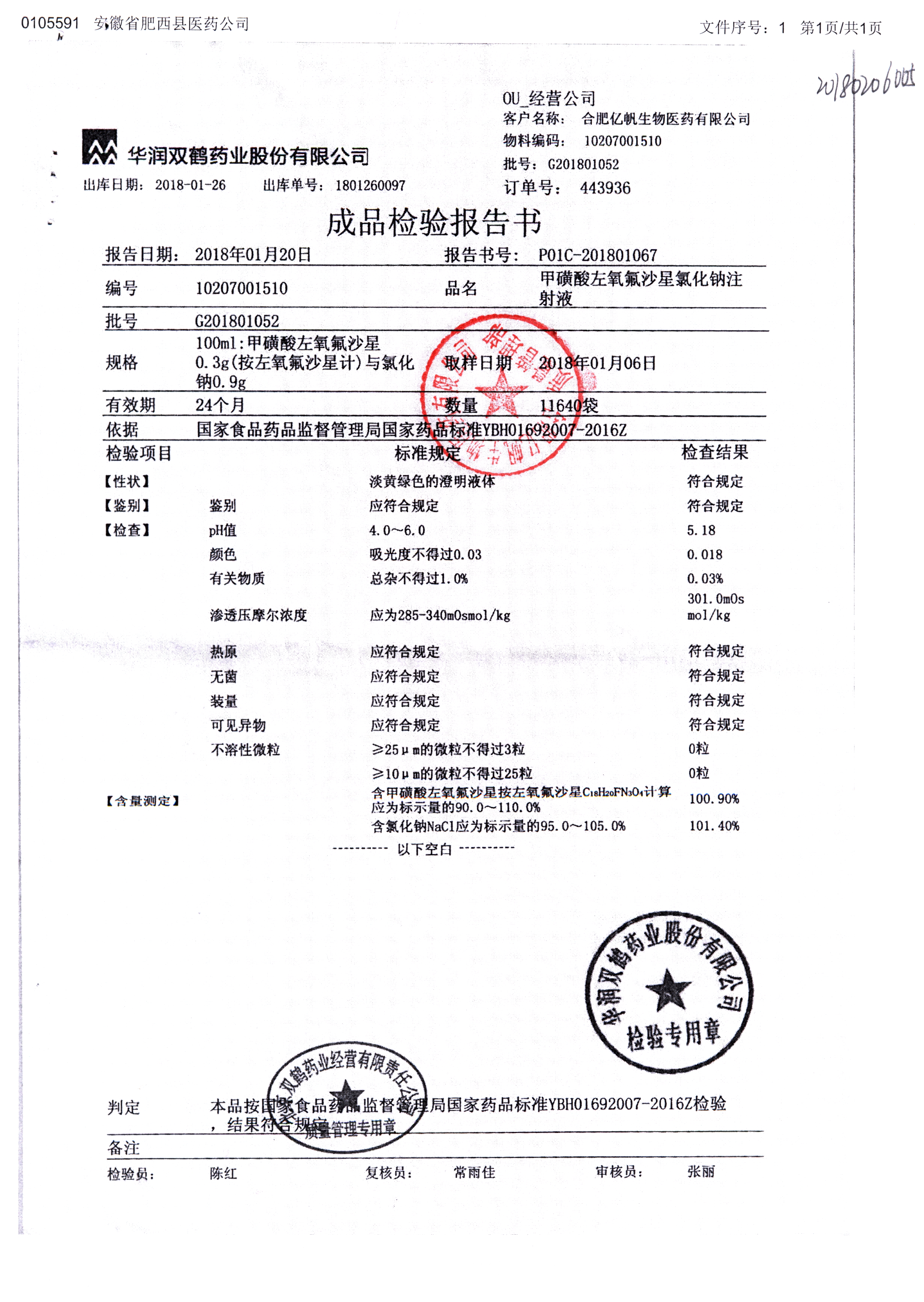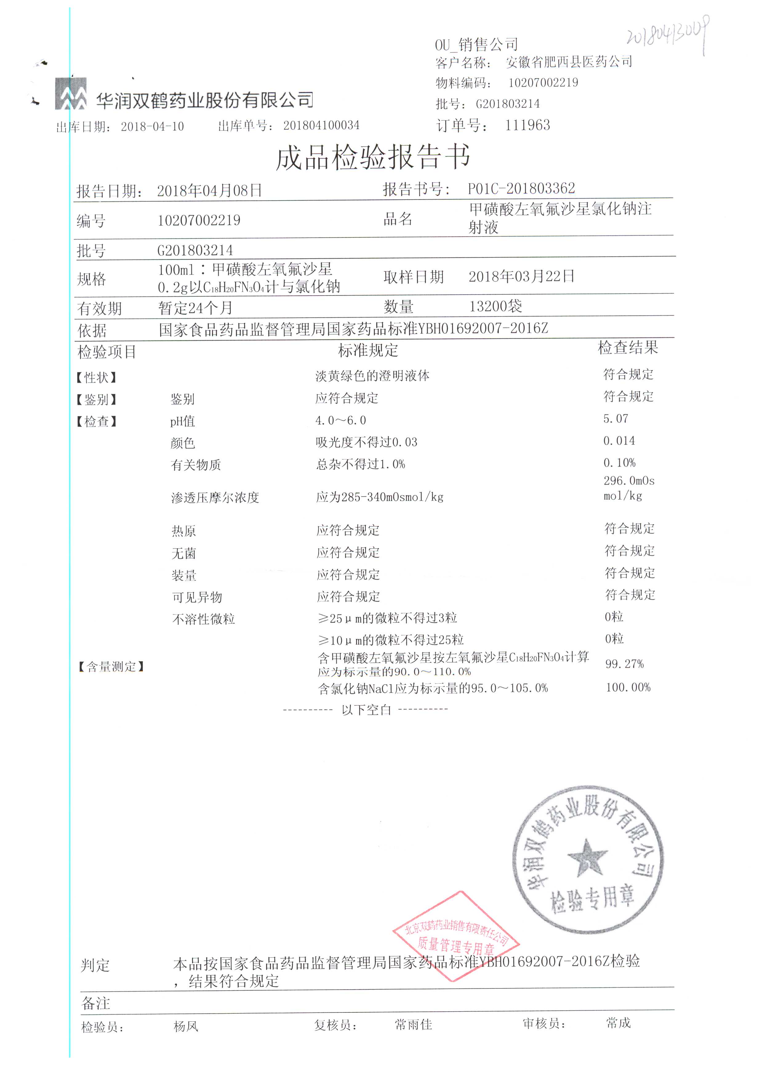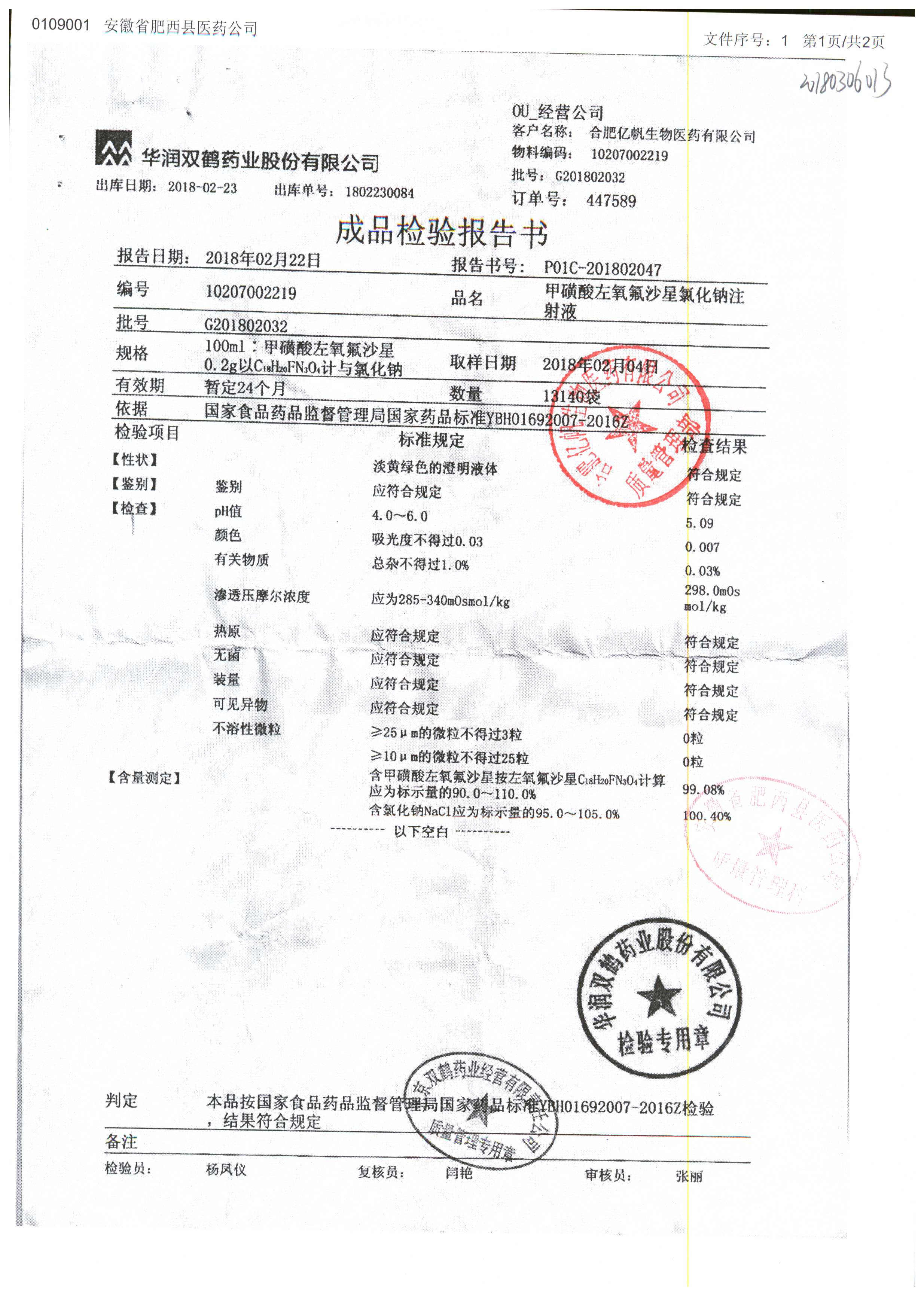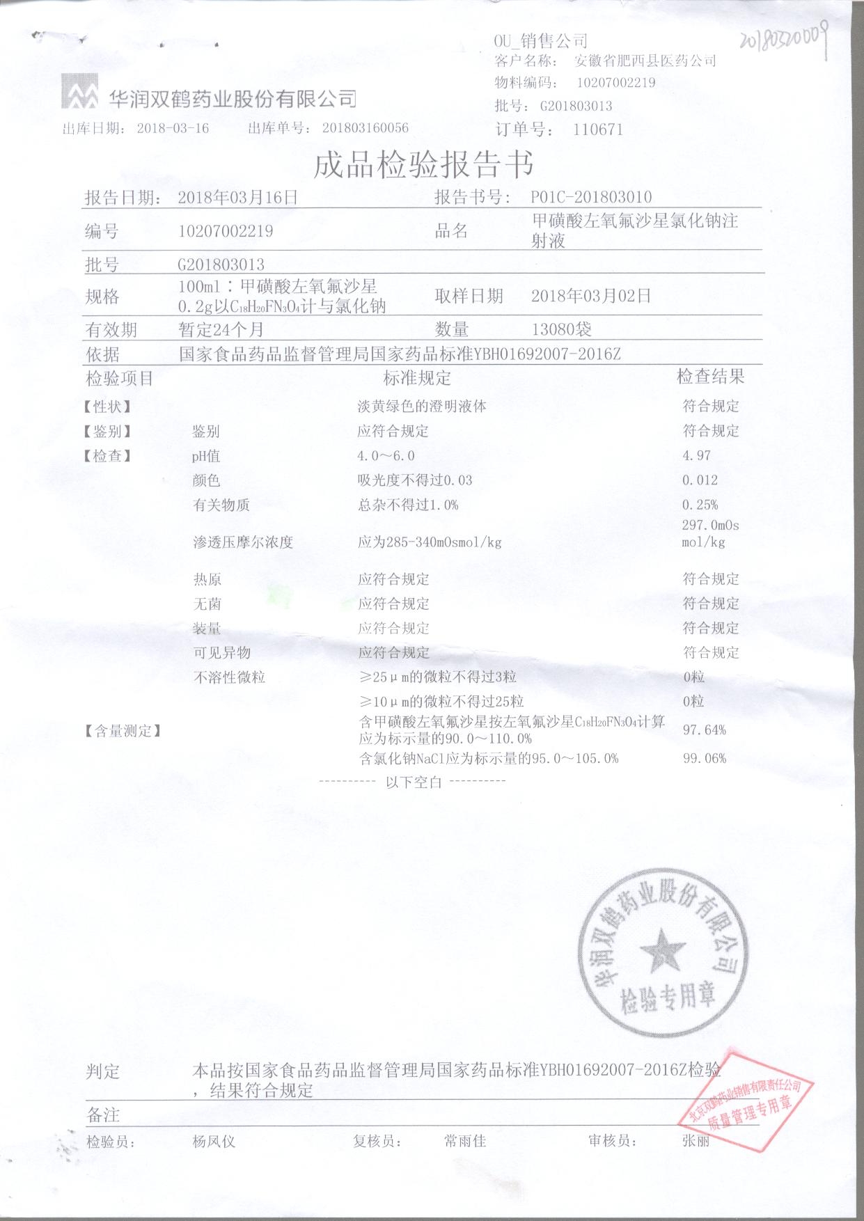 | 甲磺酸左氧氟沙星氯化鈉注射液 | 100ml | G201803214(1/2) | 查看詳情 |