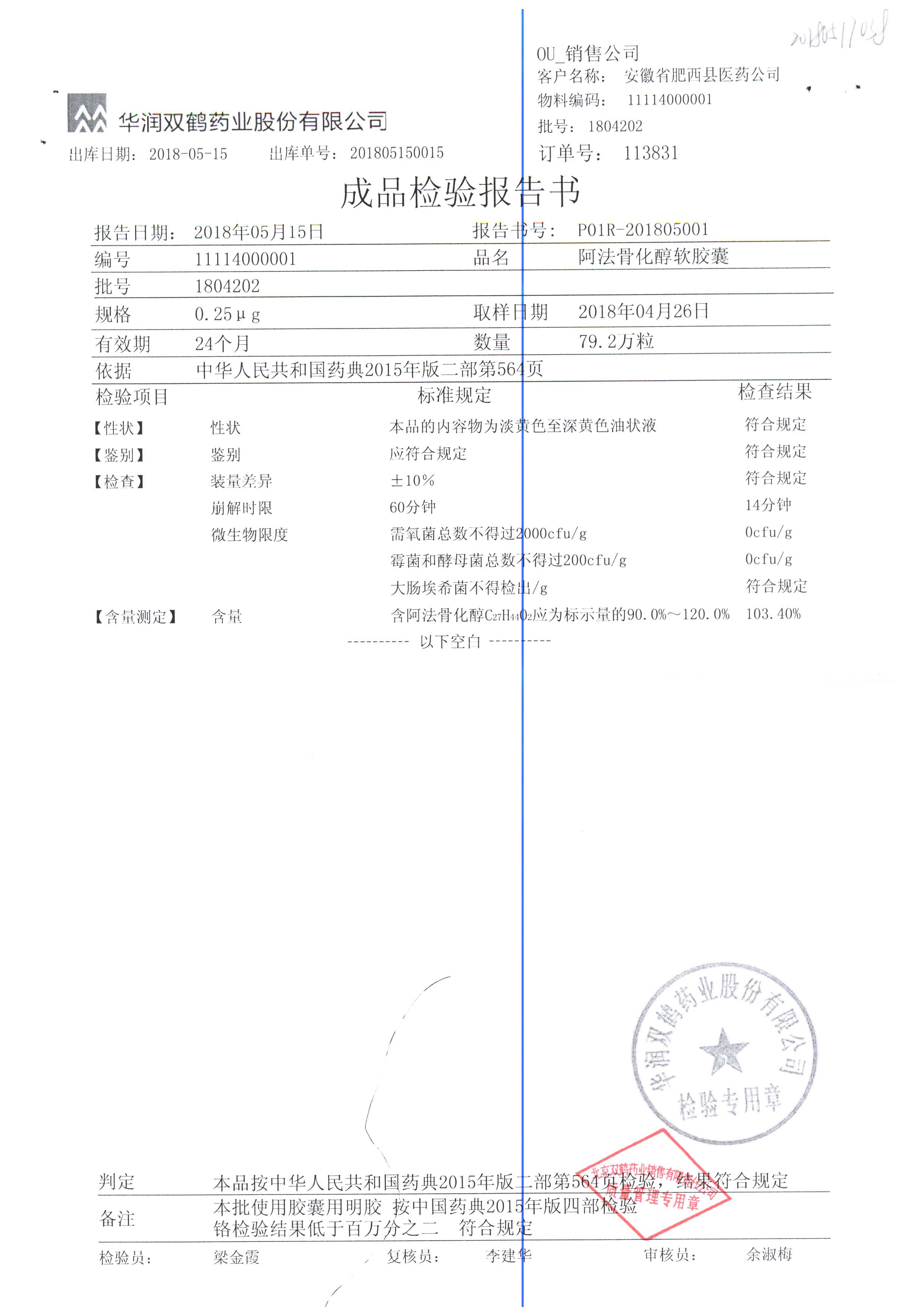 | 阿法骨化醇軟膠囊 | 0.25ug | 1804202 | 查看詳情 |