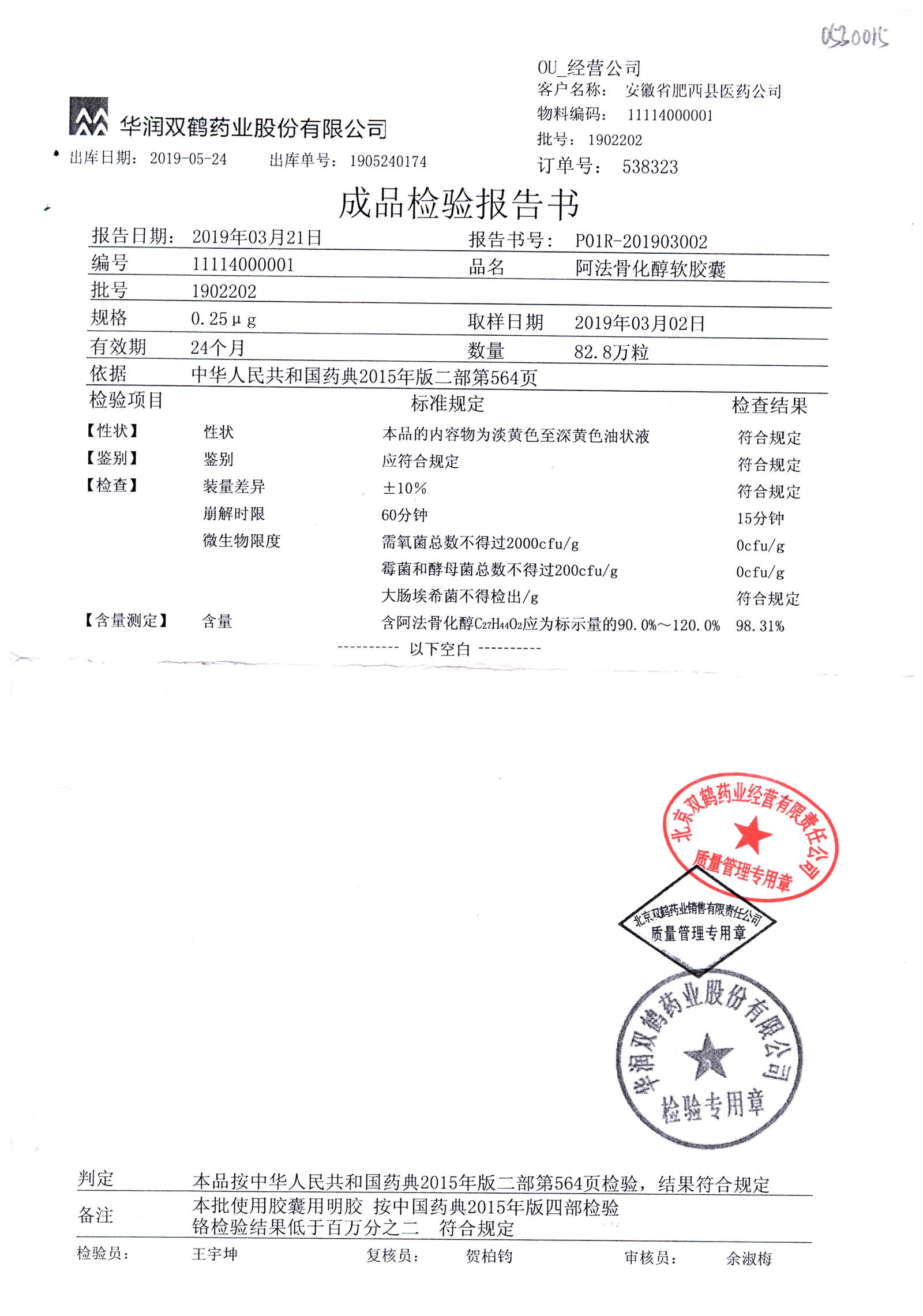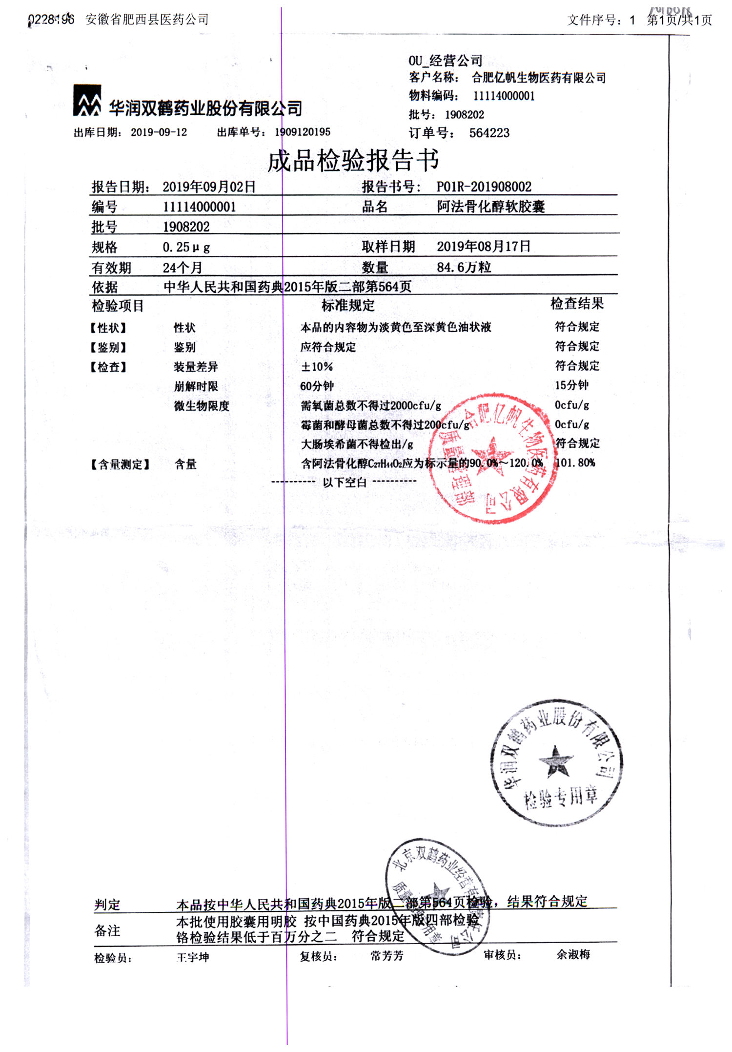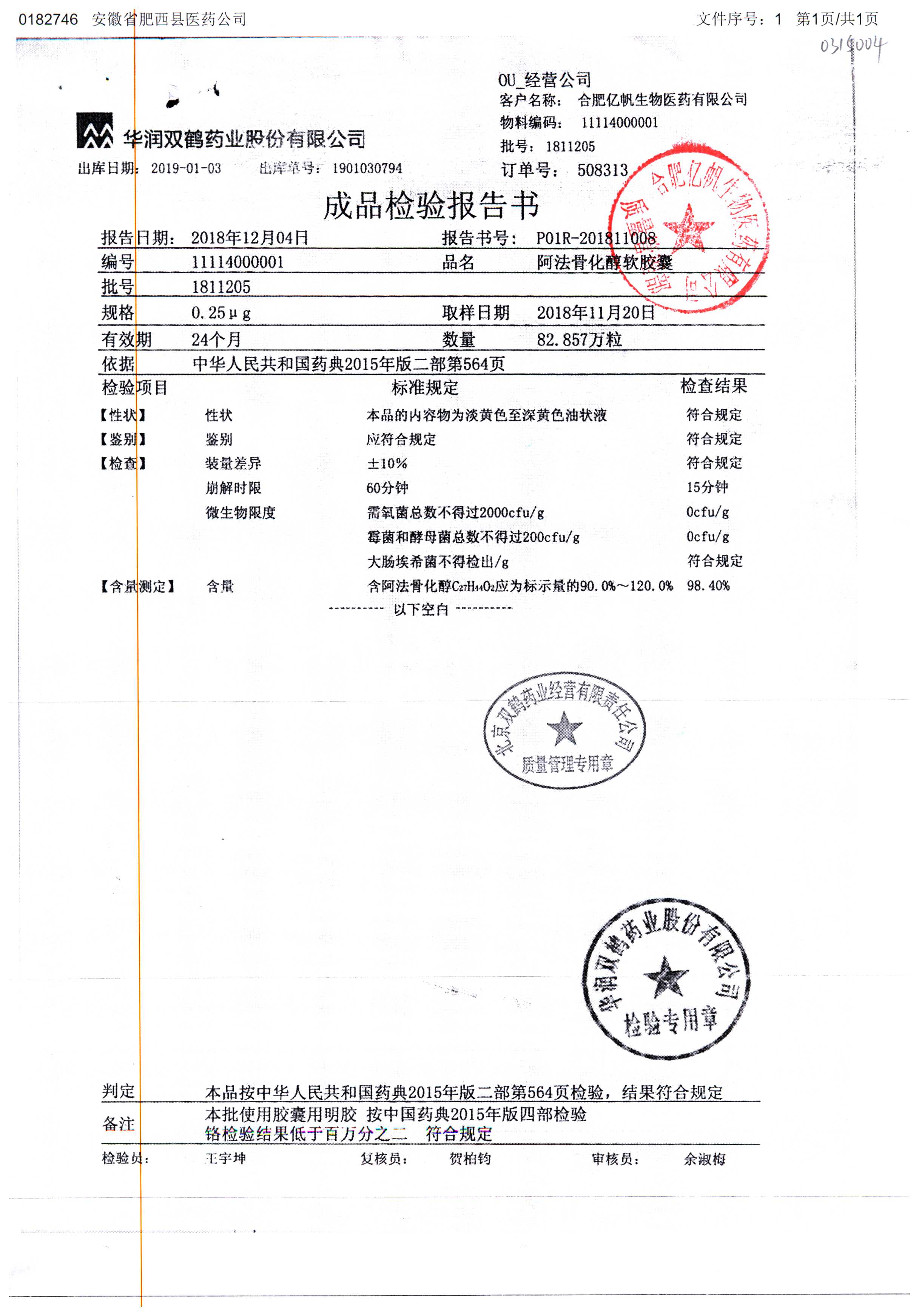 | 阿法骨化醇軟膠囊 | 0.25ug | 1902202 | 查看詳情 |