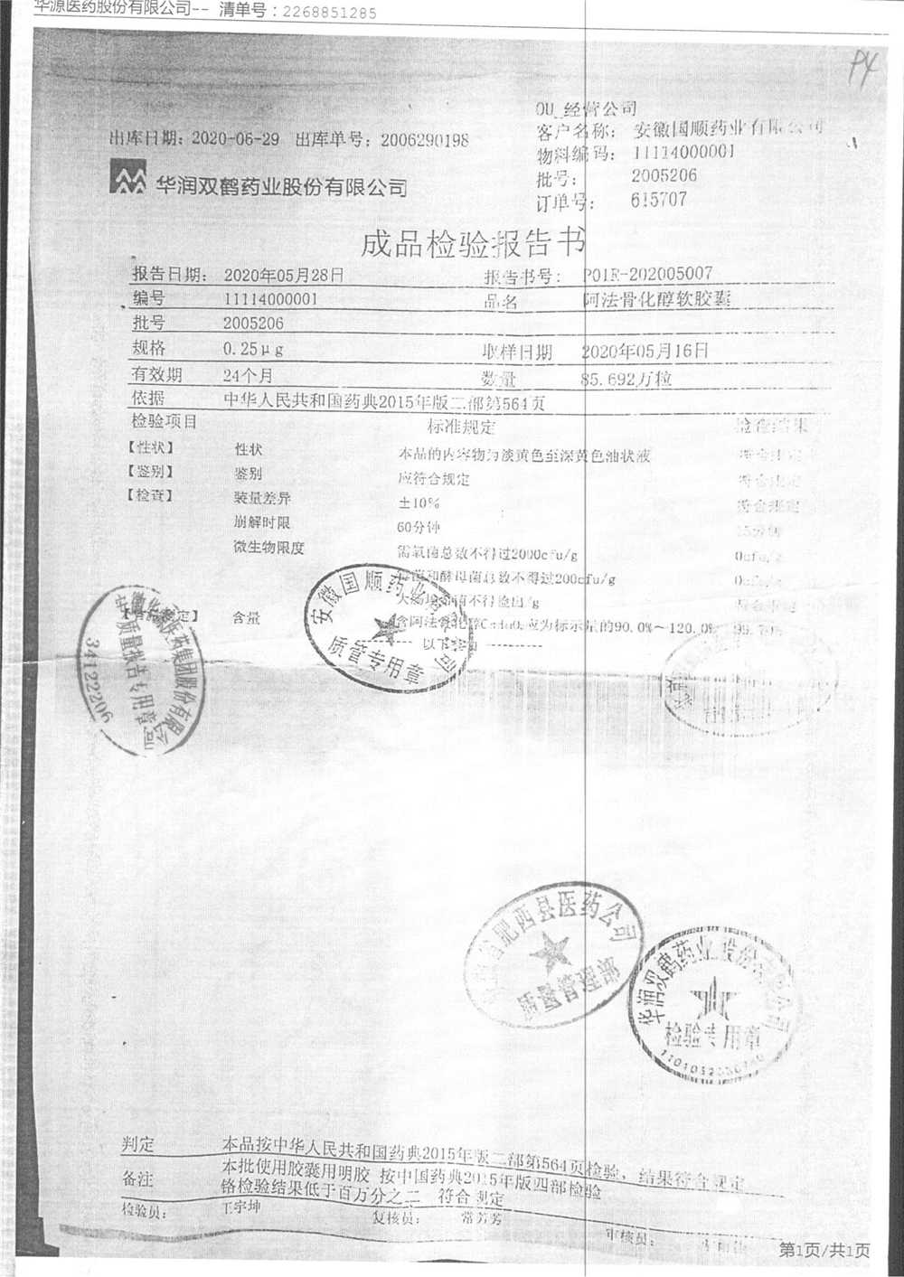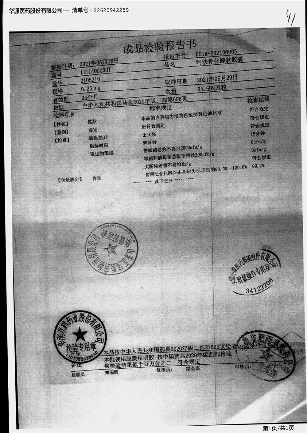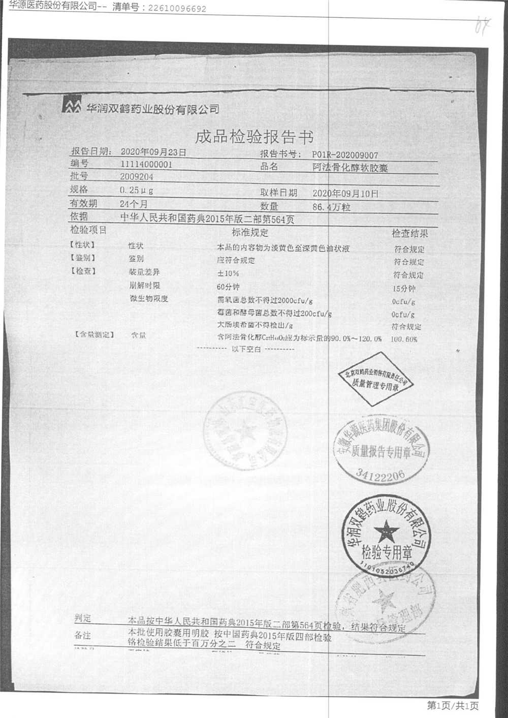 | 阿法骨化醇軟膠囊 | 0.25ug | 2009204 | 查看詳情 |