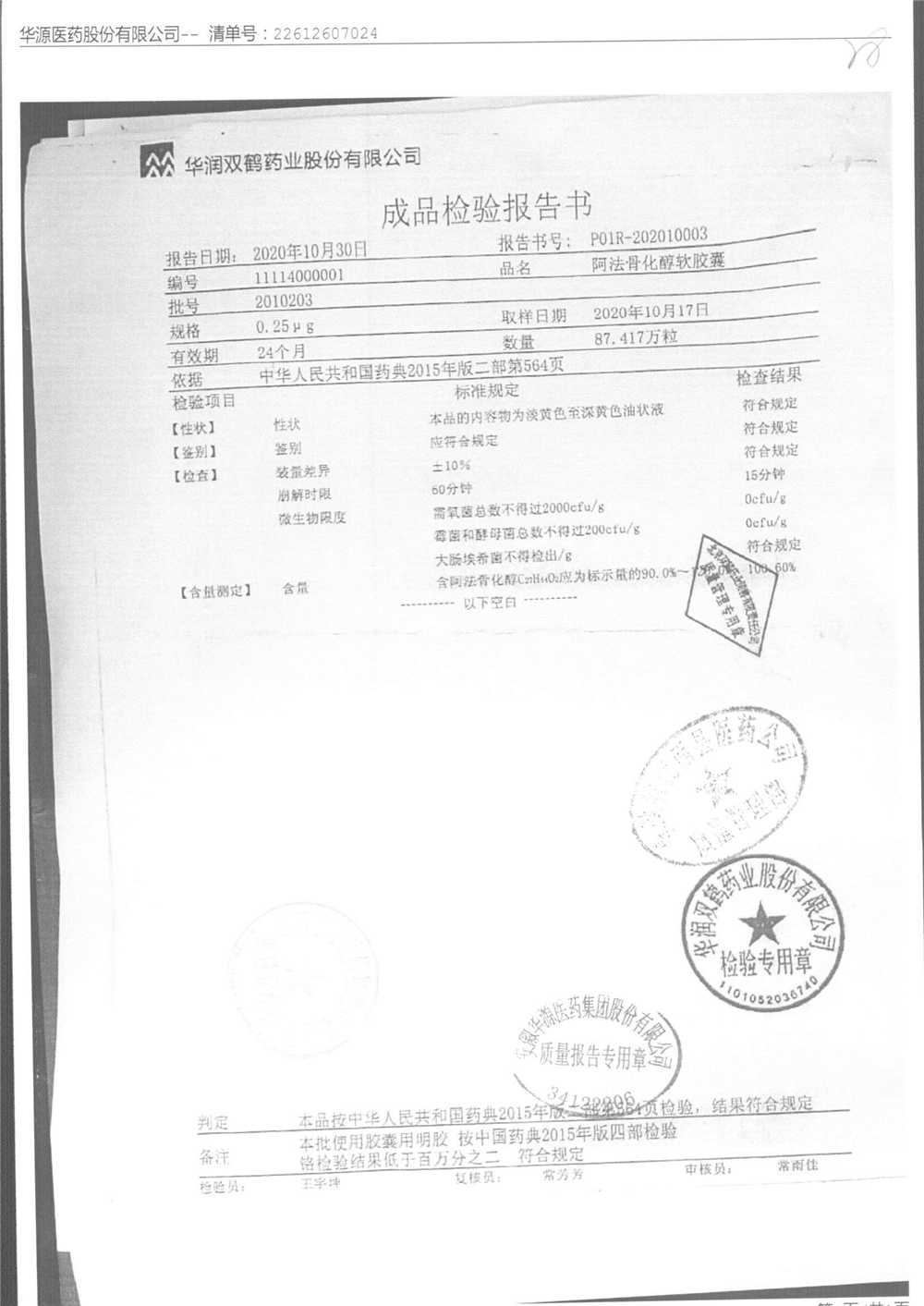 | 阿法骨化醇軟膠囊 | 0.25ug | 1811205 | 查看詳情 |