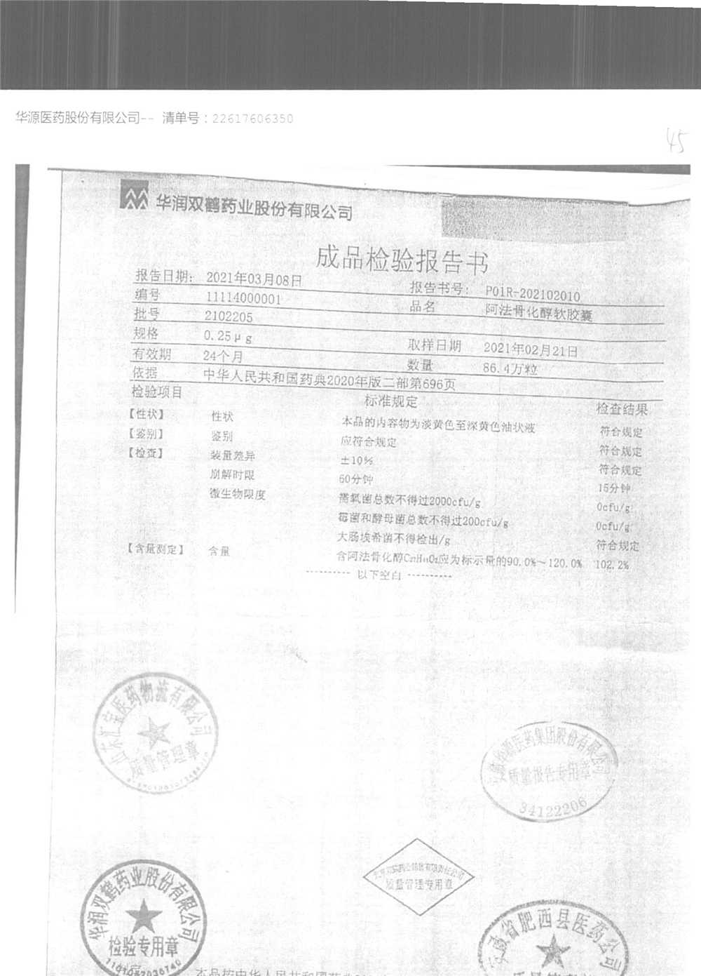 | 阿法骨化醇軟膠囊 | 0.25ug | 2210205 | 查看詳情 |