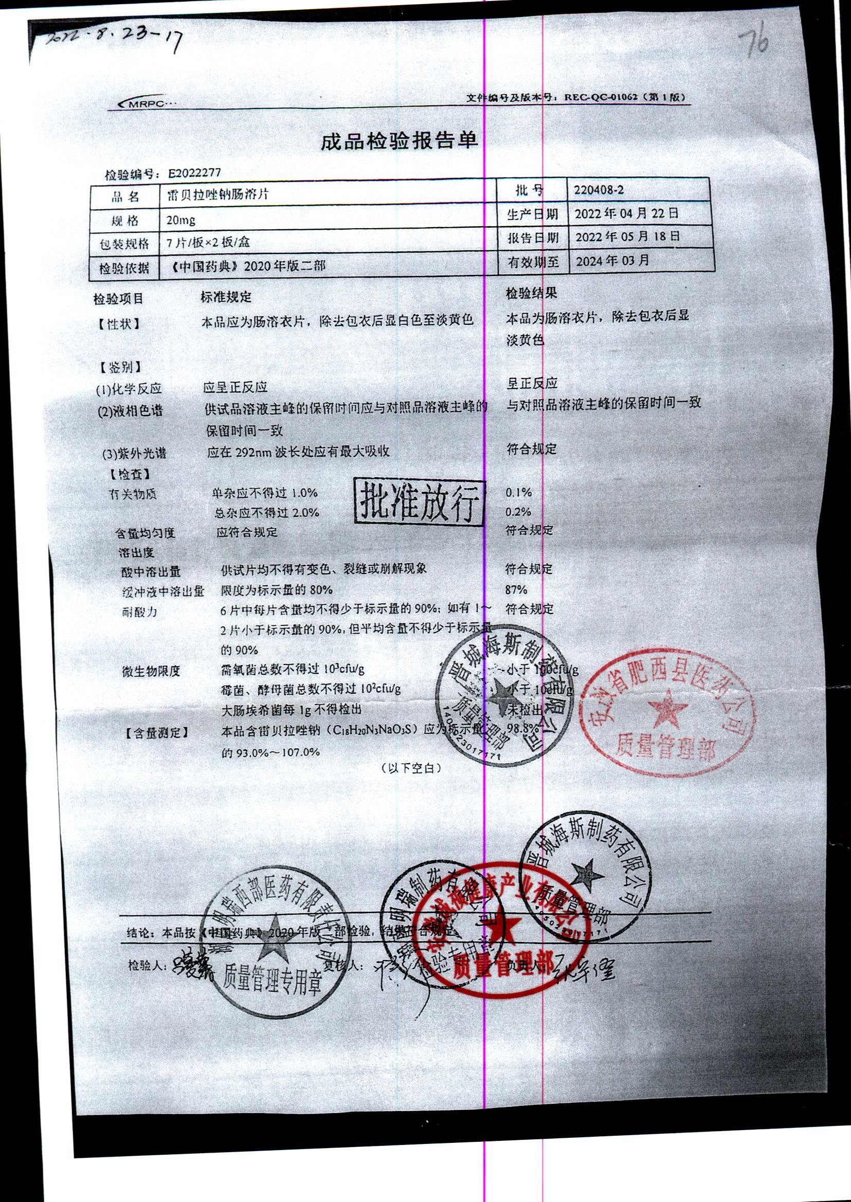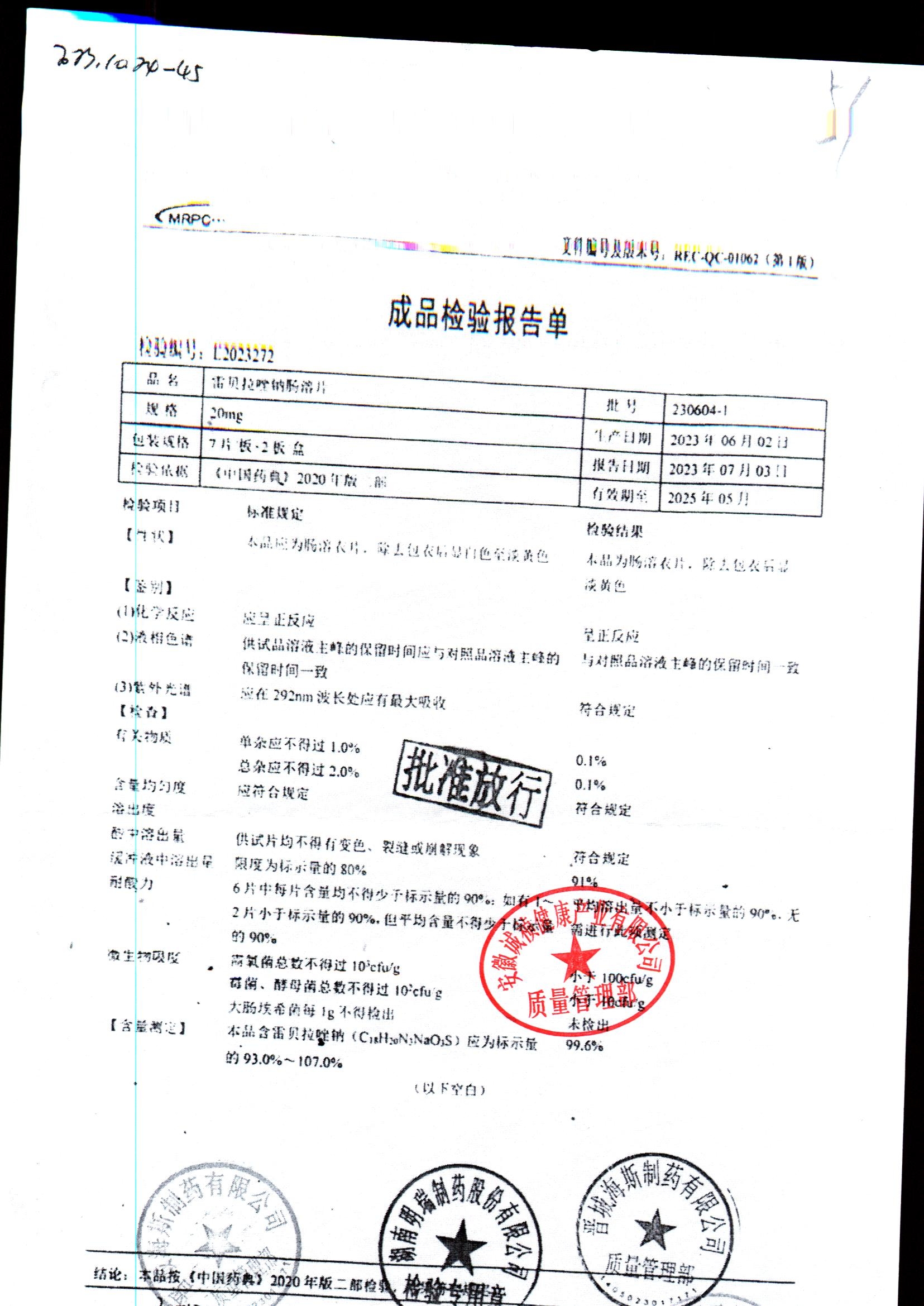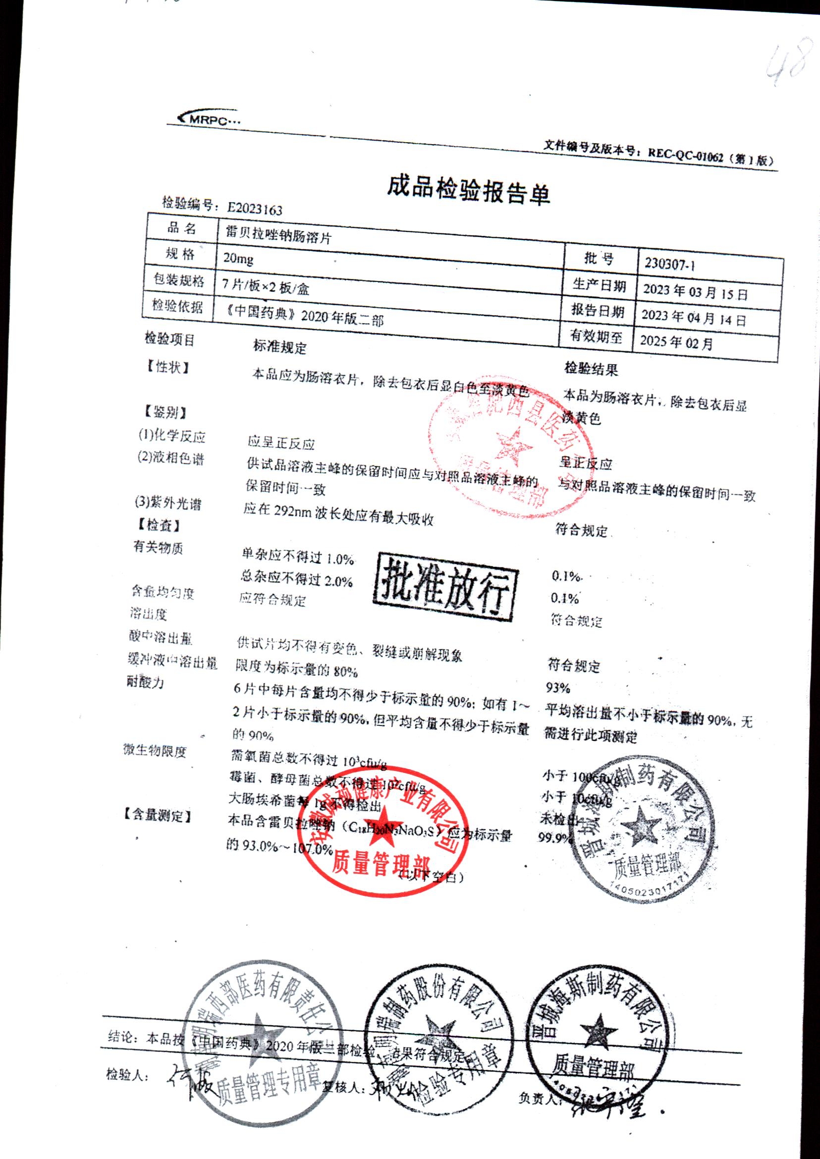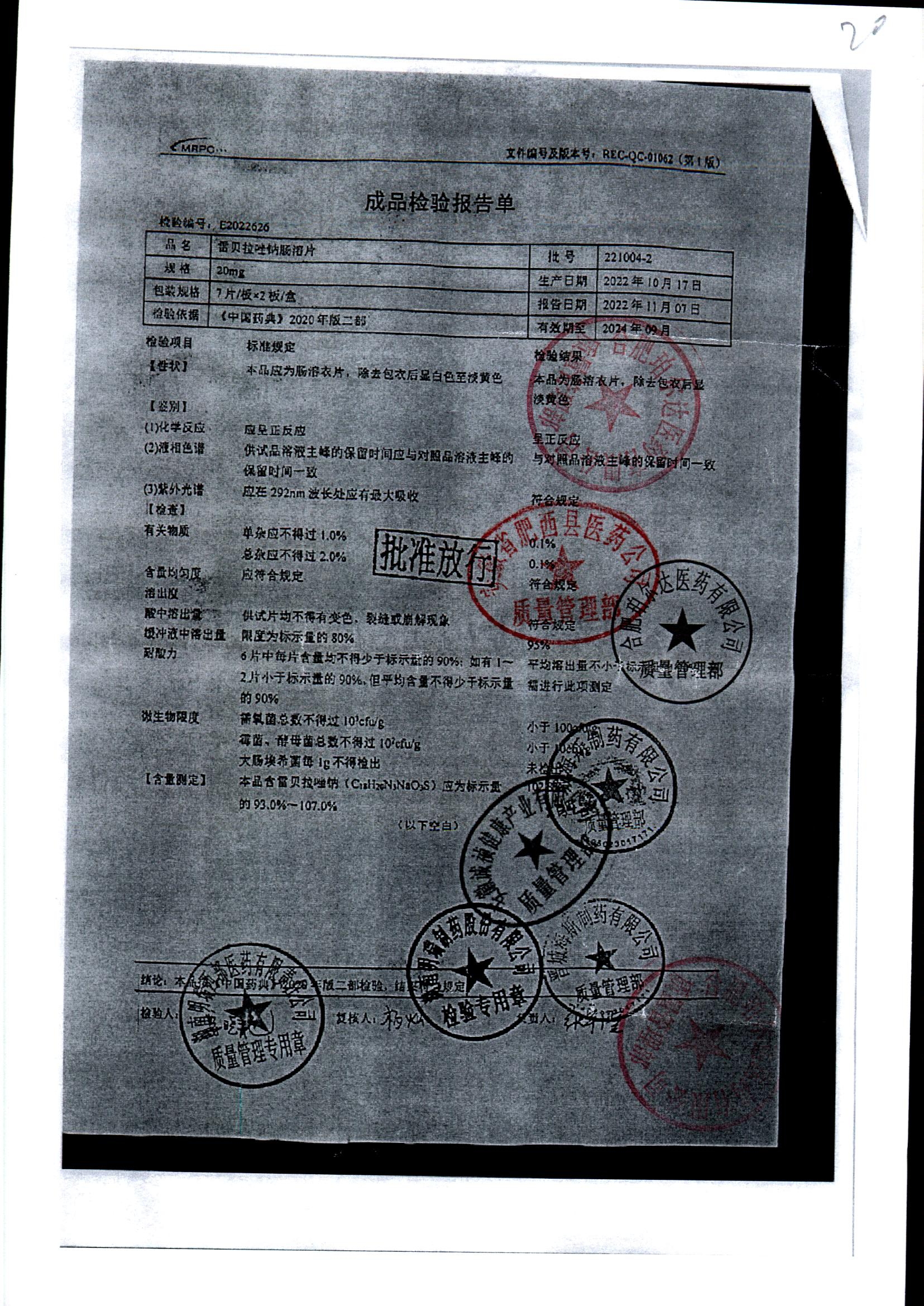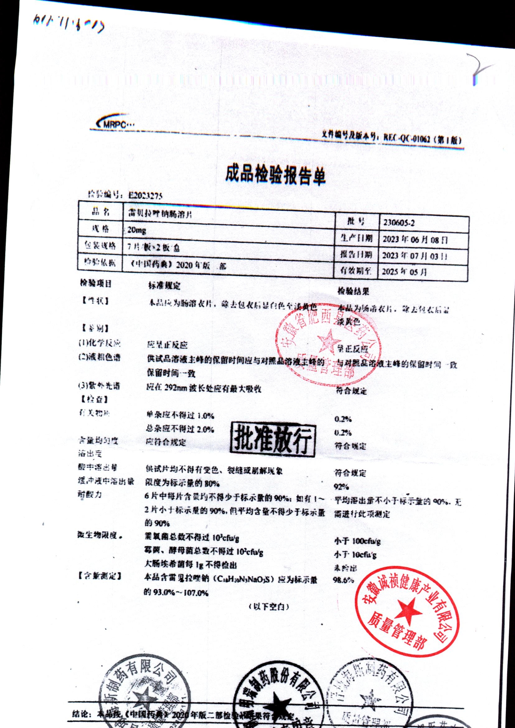 | 雷貝拉唑鈉腸溶片 | 20mg*14片 | 20210816 | 查看詳情 |