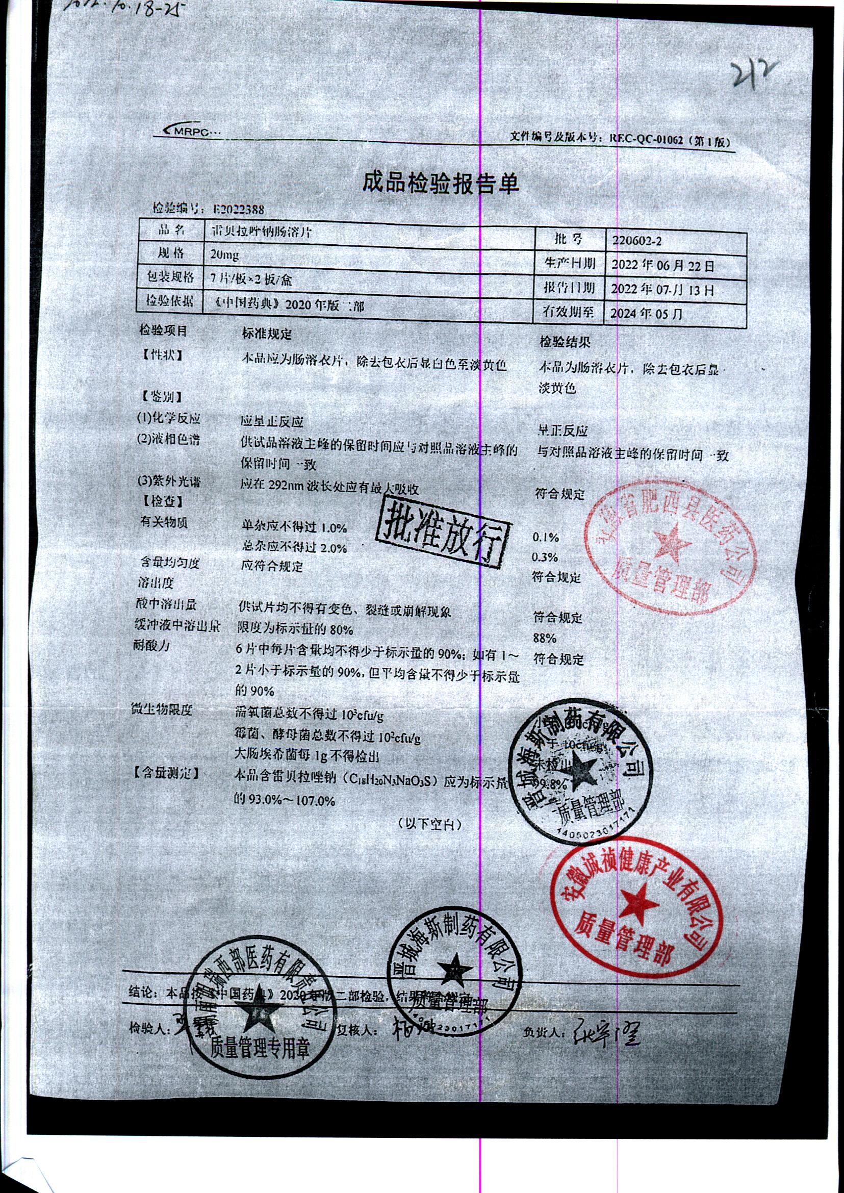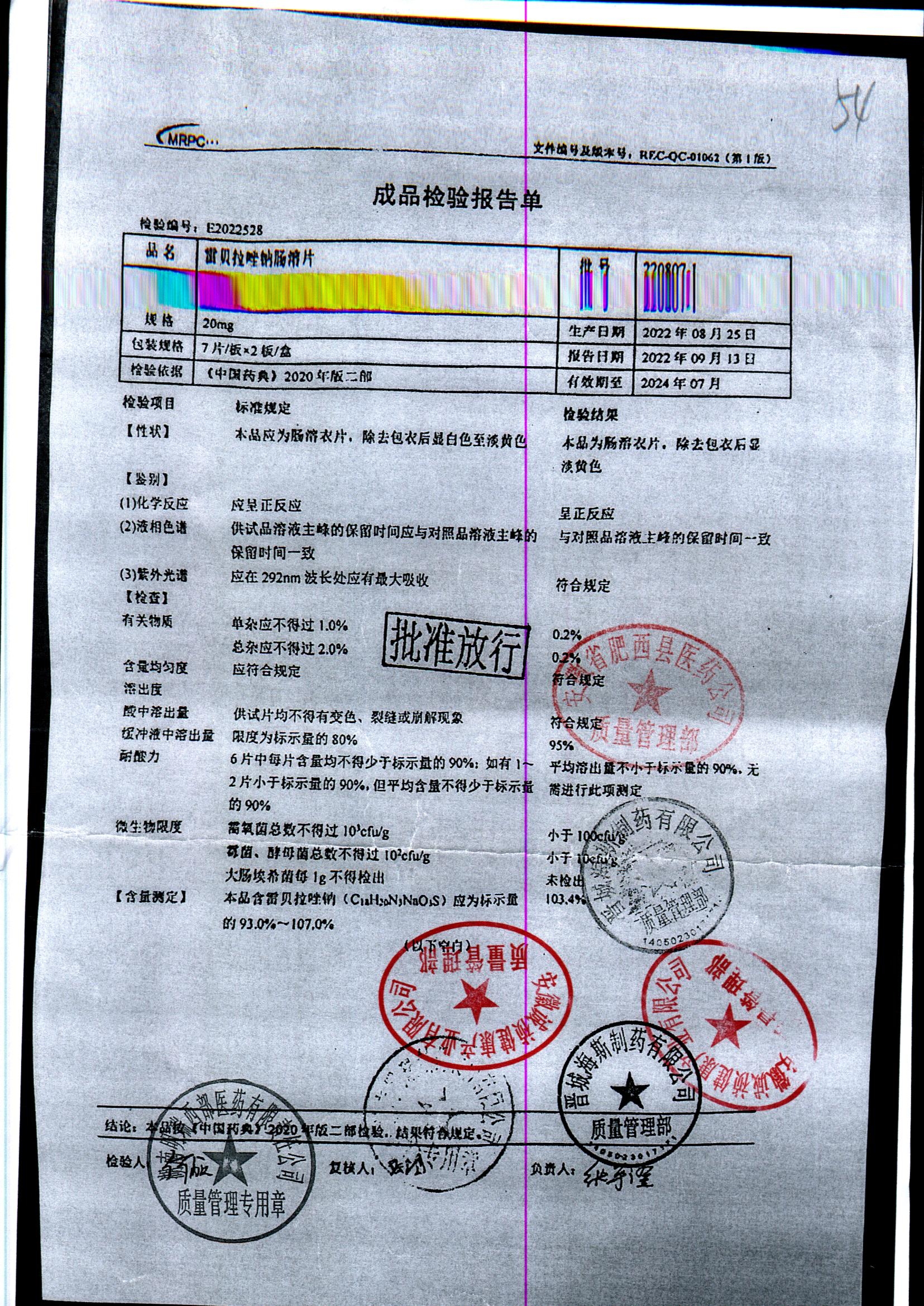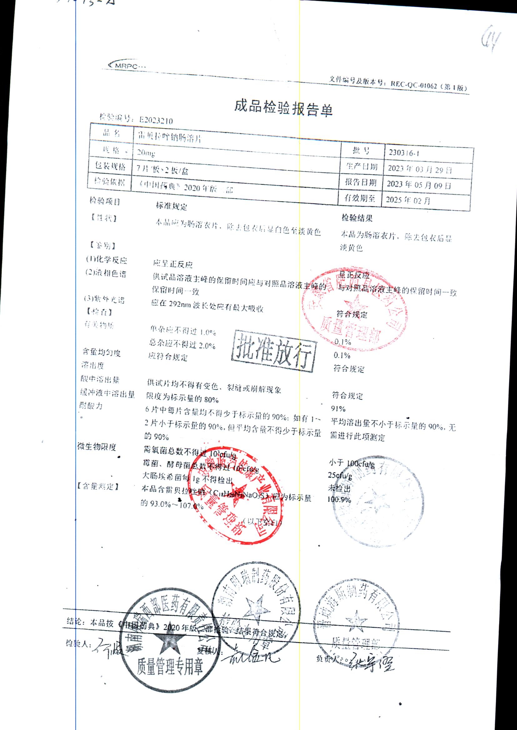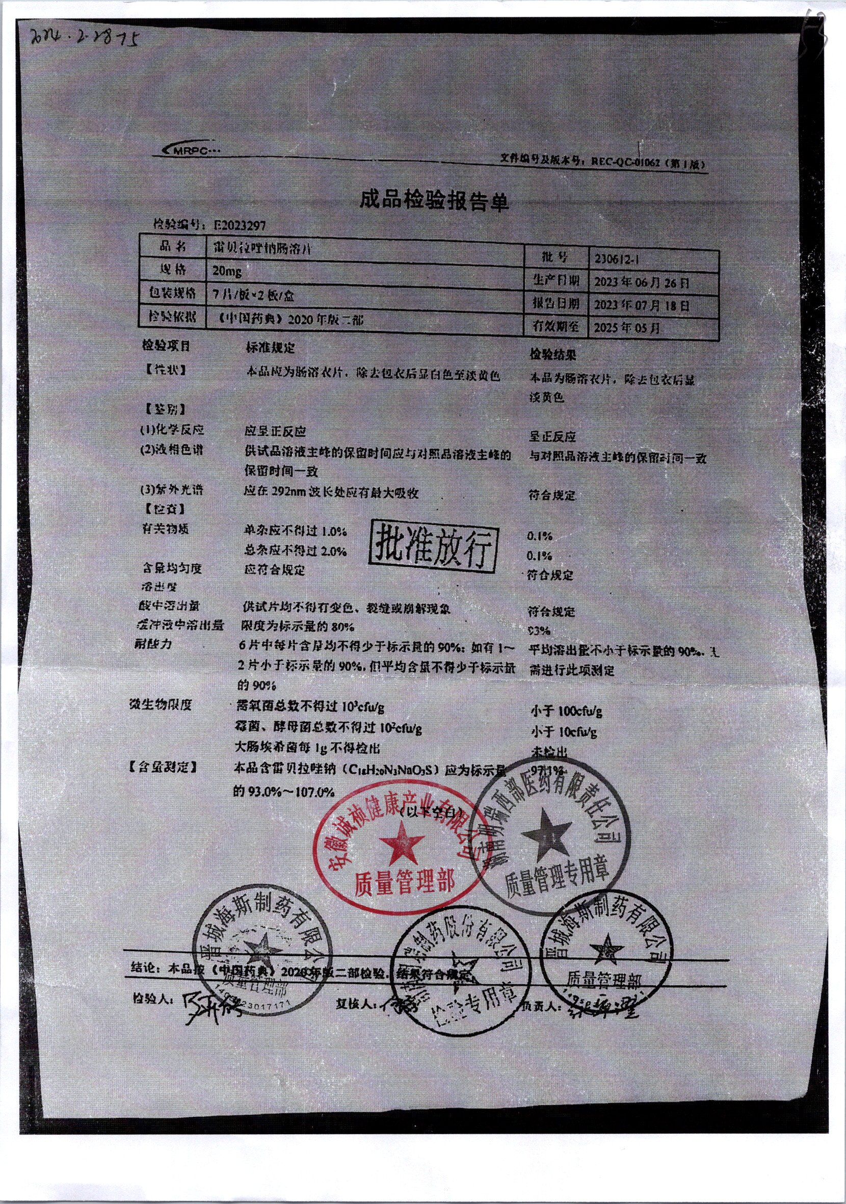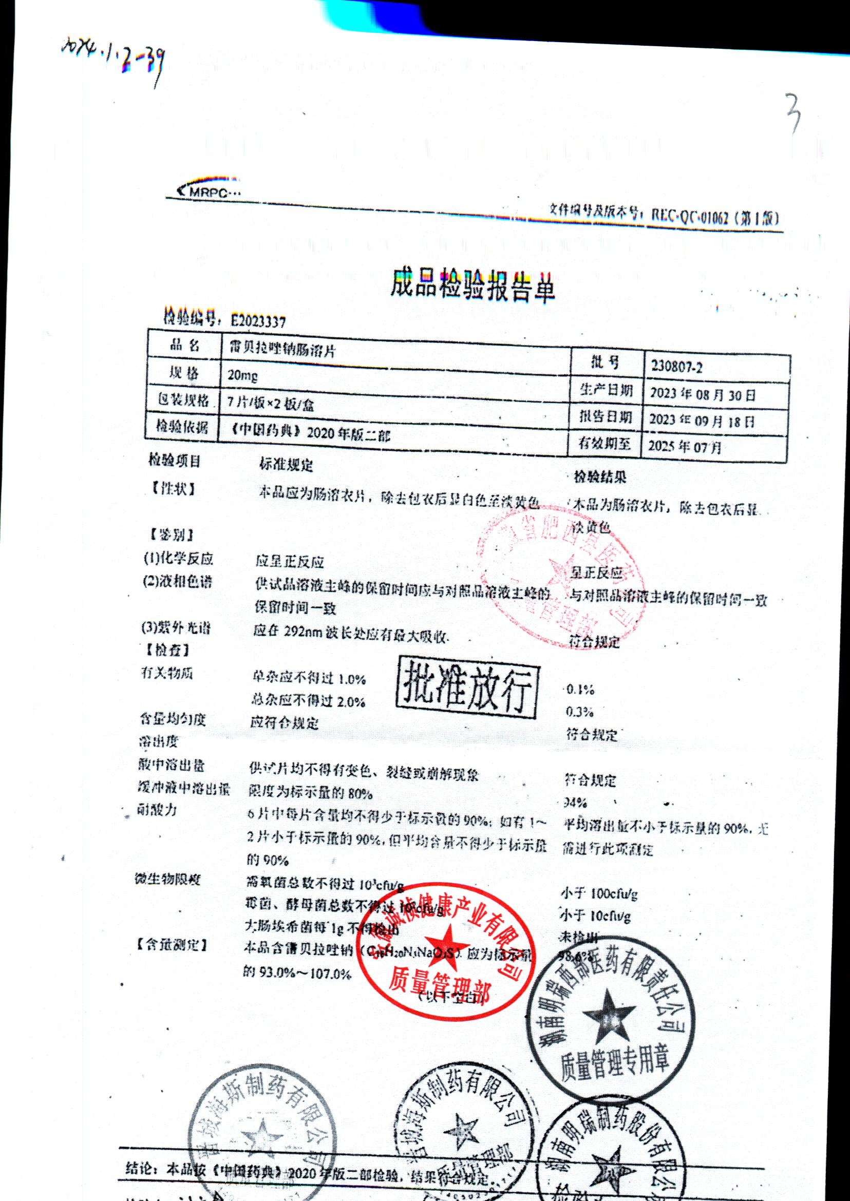 | 雷貝拉唑鈉腸溶片 | 20mg*14片 | 20210816 | 查看詳情 |