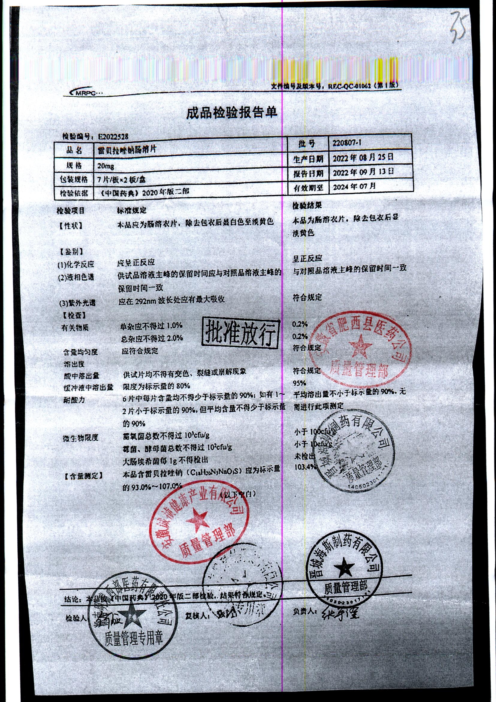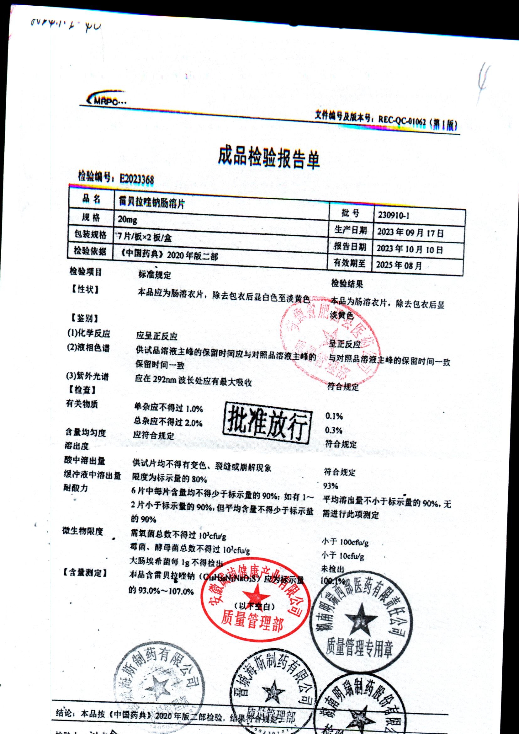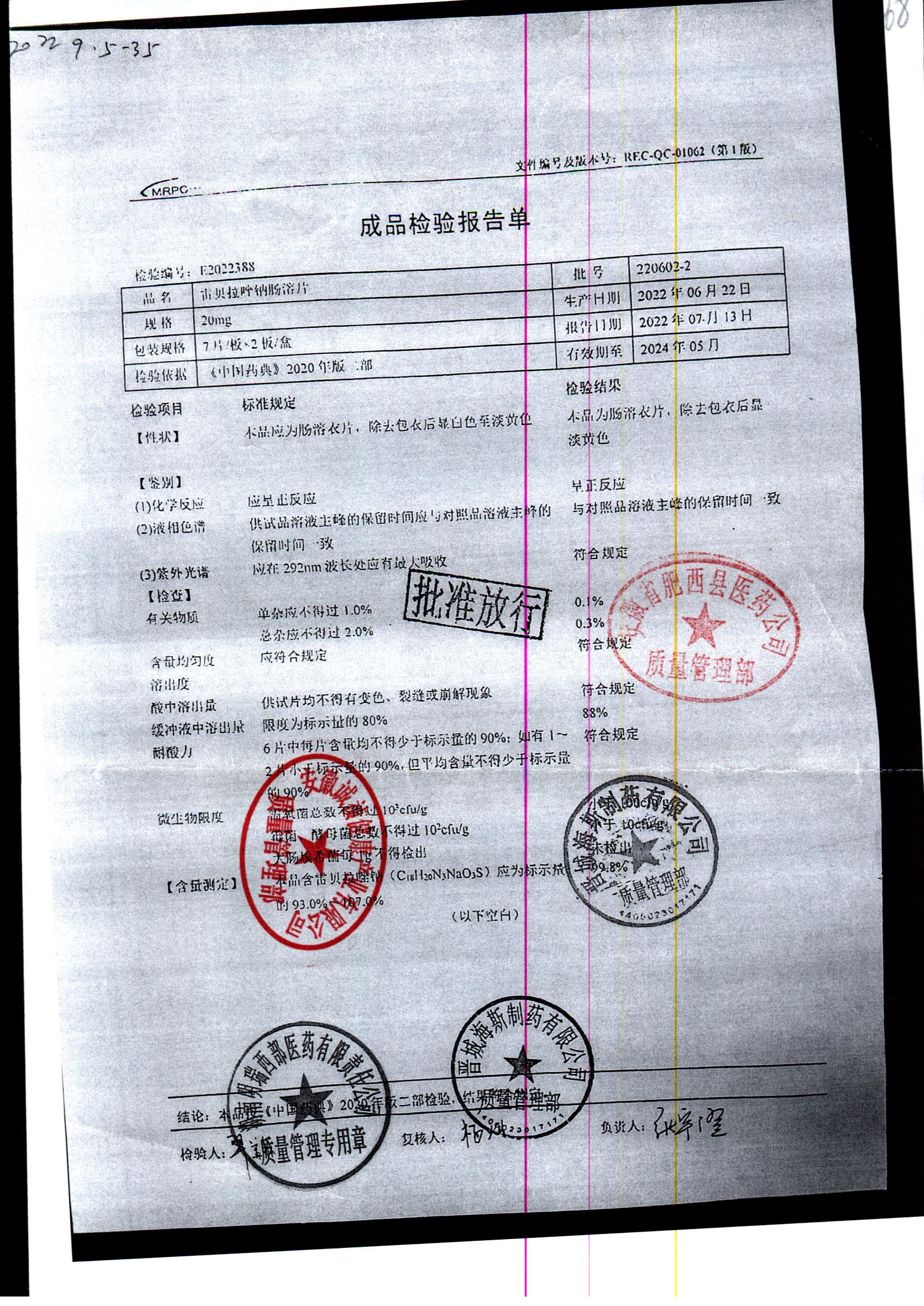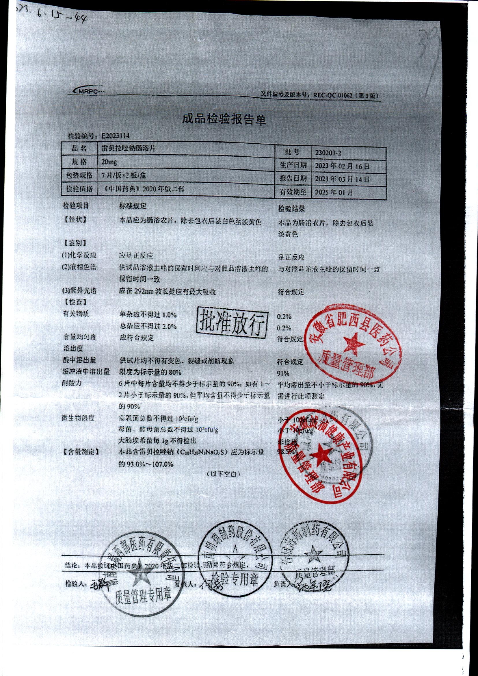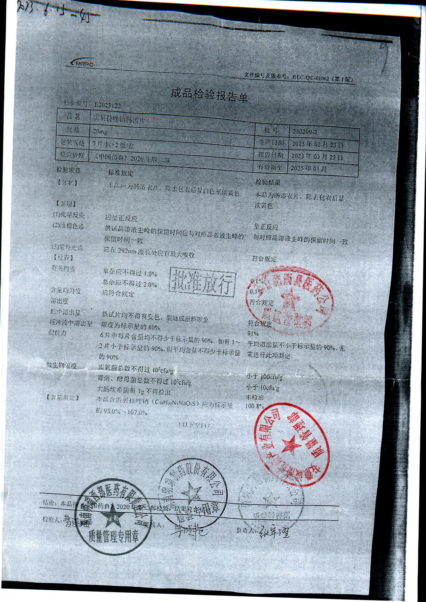 | 雷貝拉唑鈉腸溶片 | 20mg*14片 | 20210816 | 查看詳情 |