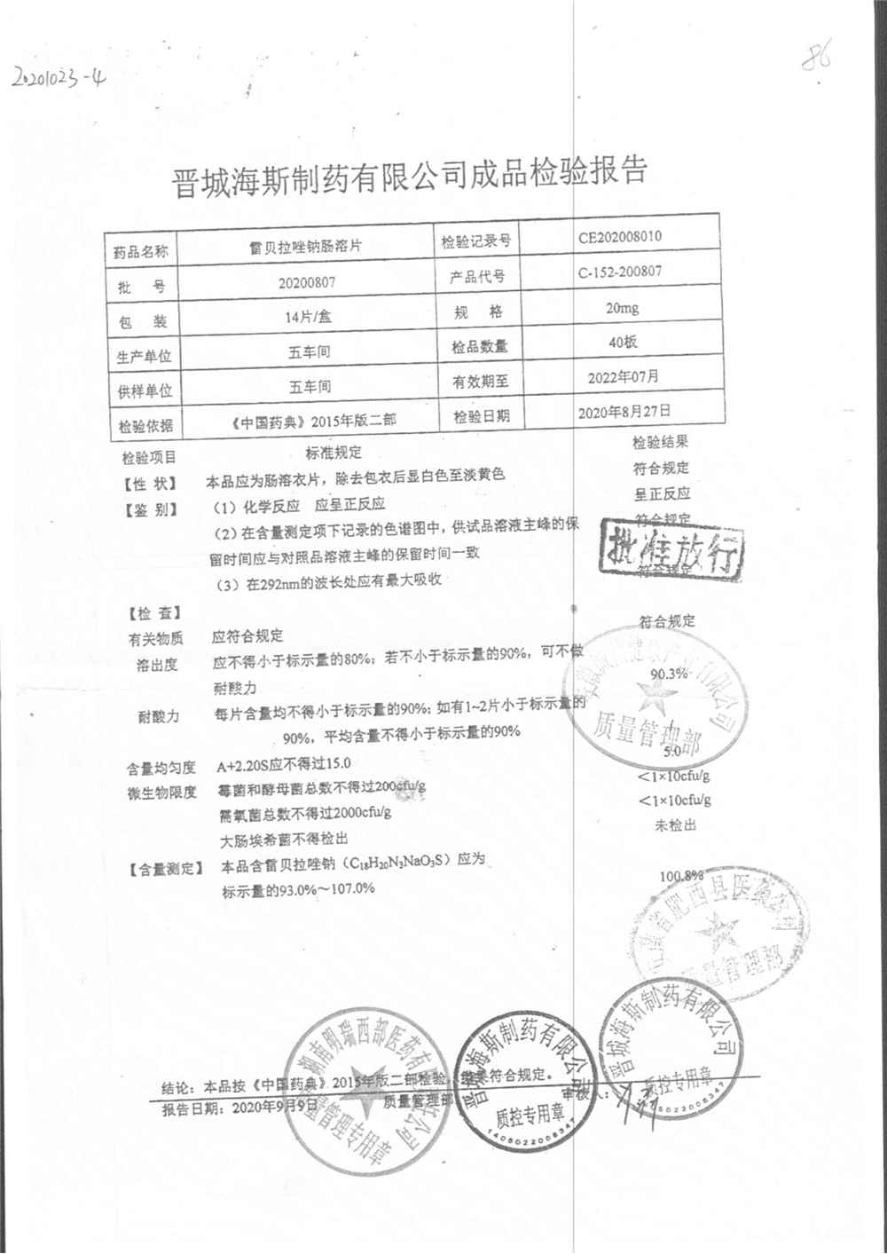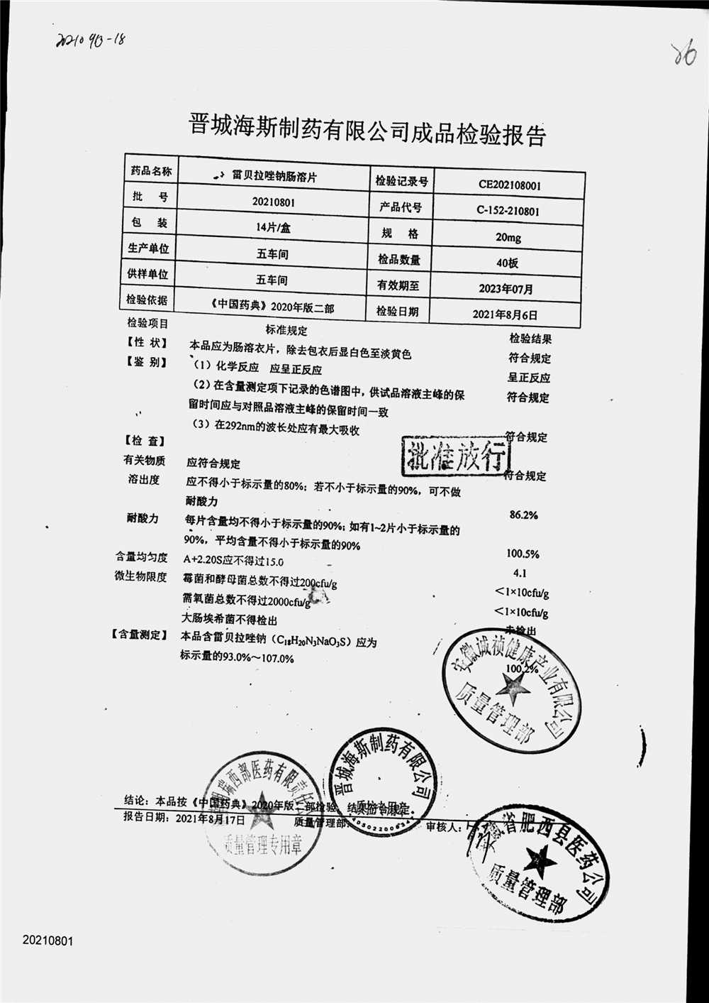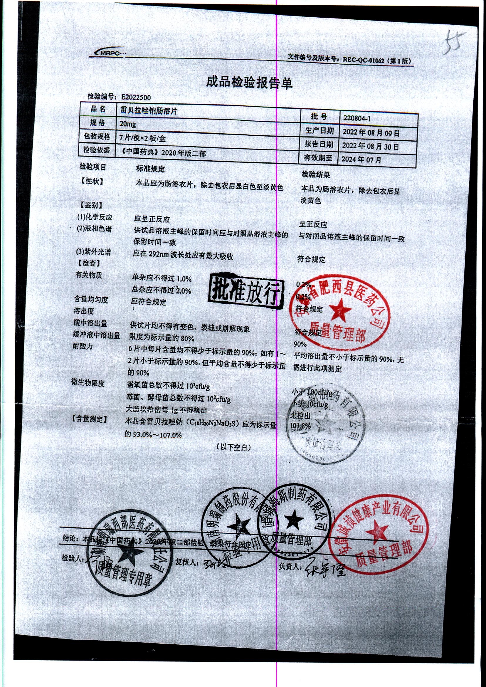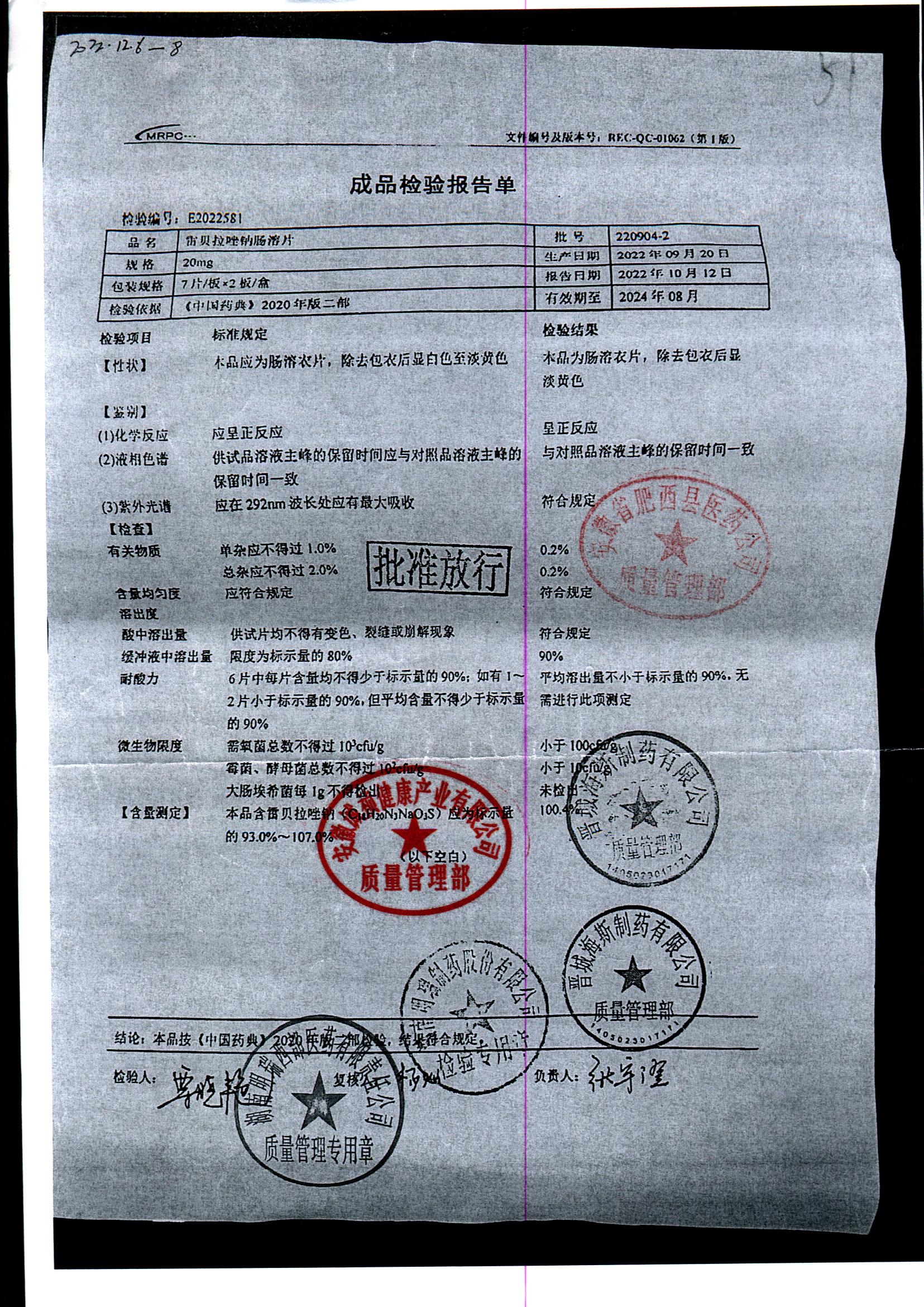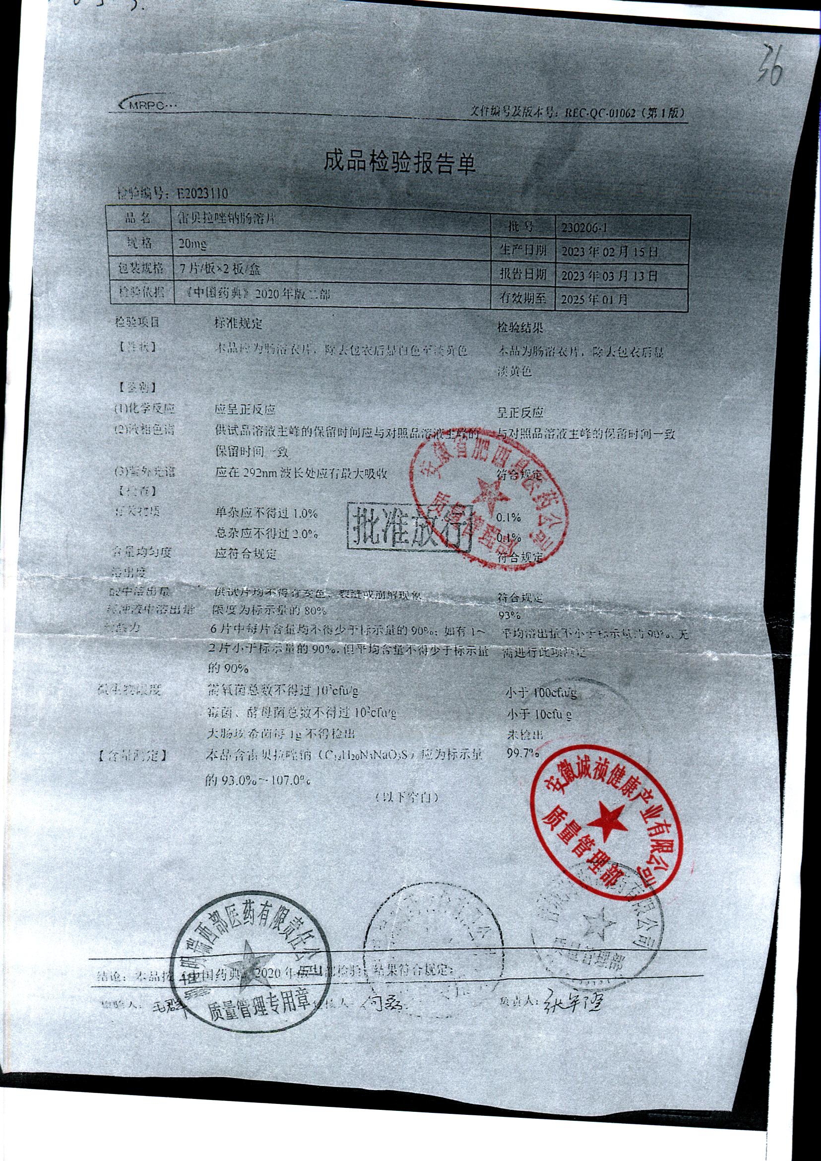 | 雷貝拉唑鈉腸溶片 | 20mg*14片 | 20210816 | 查看詳情 |