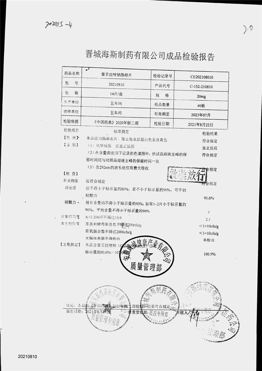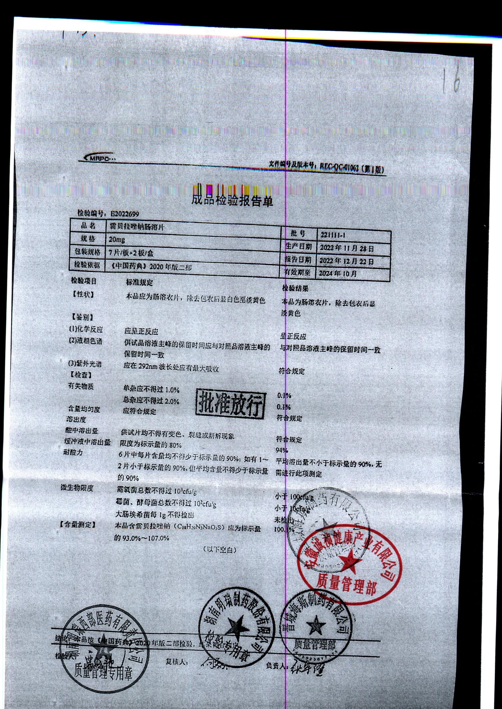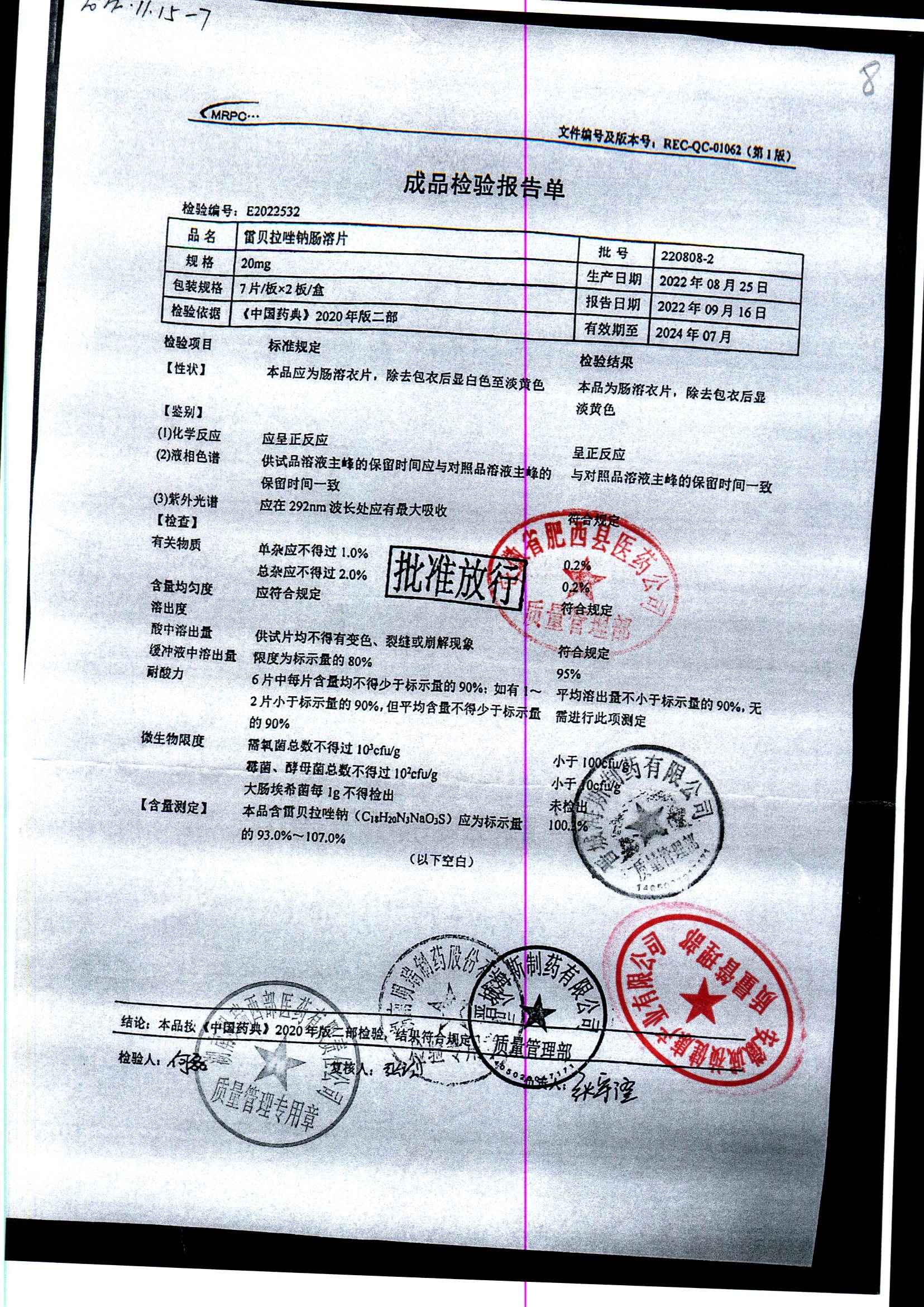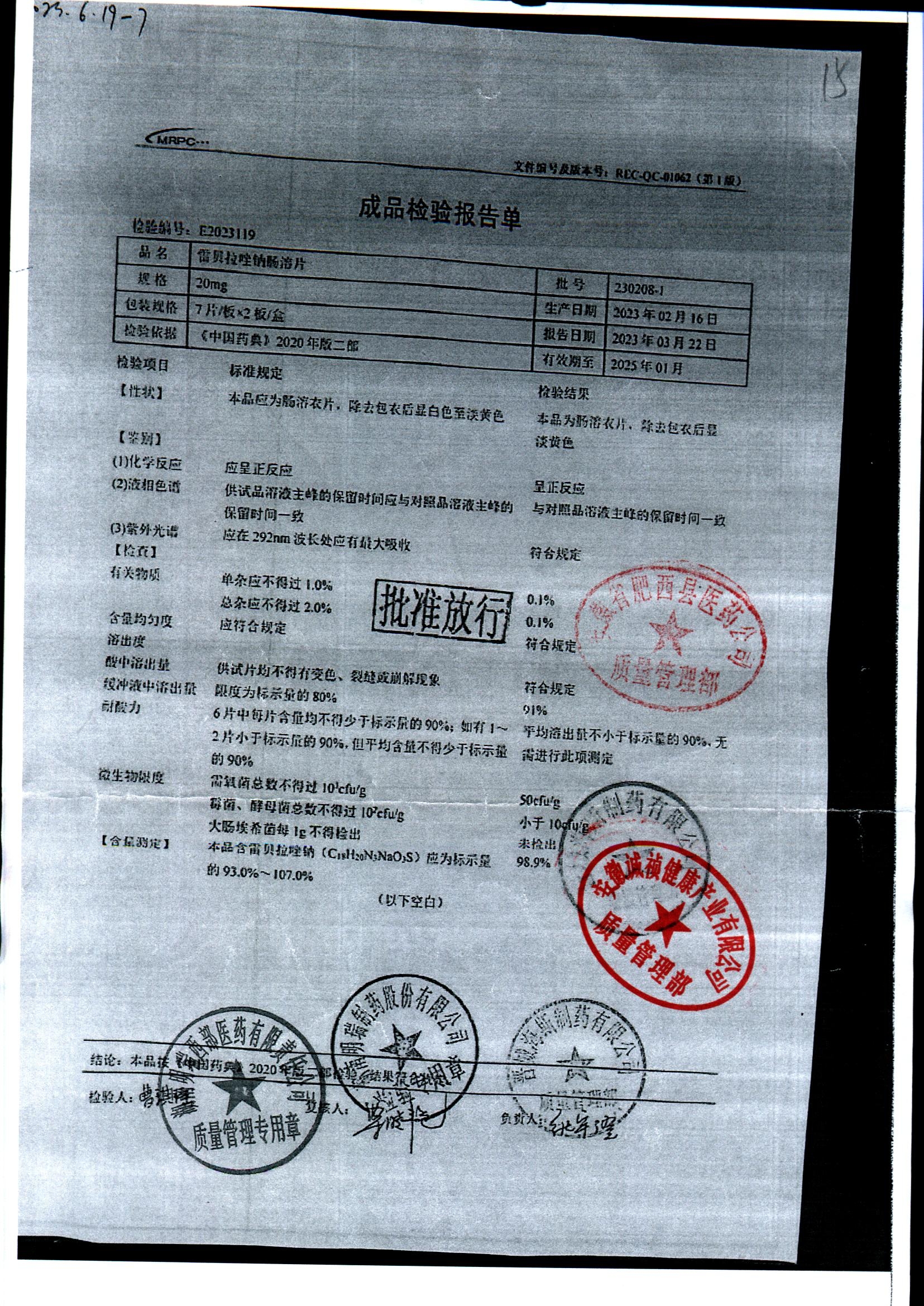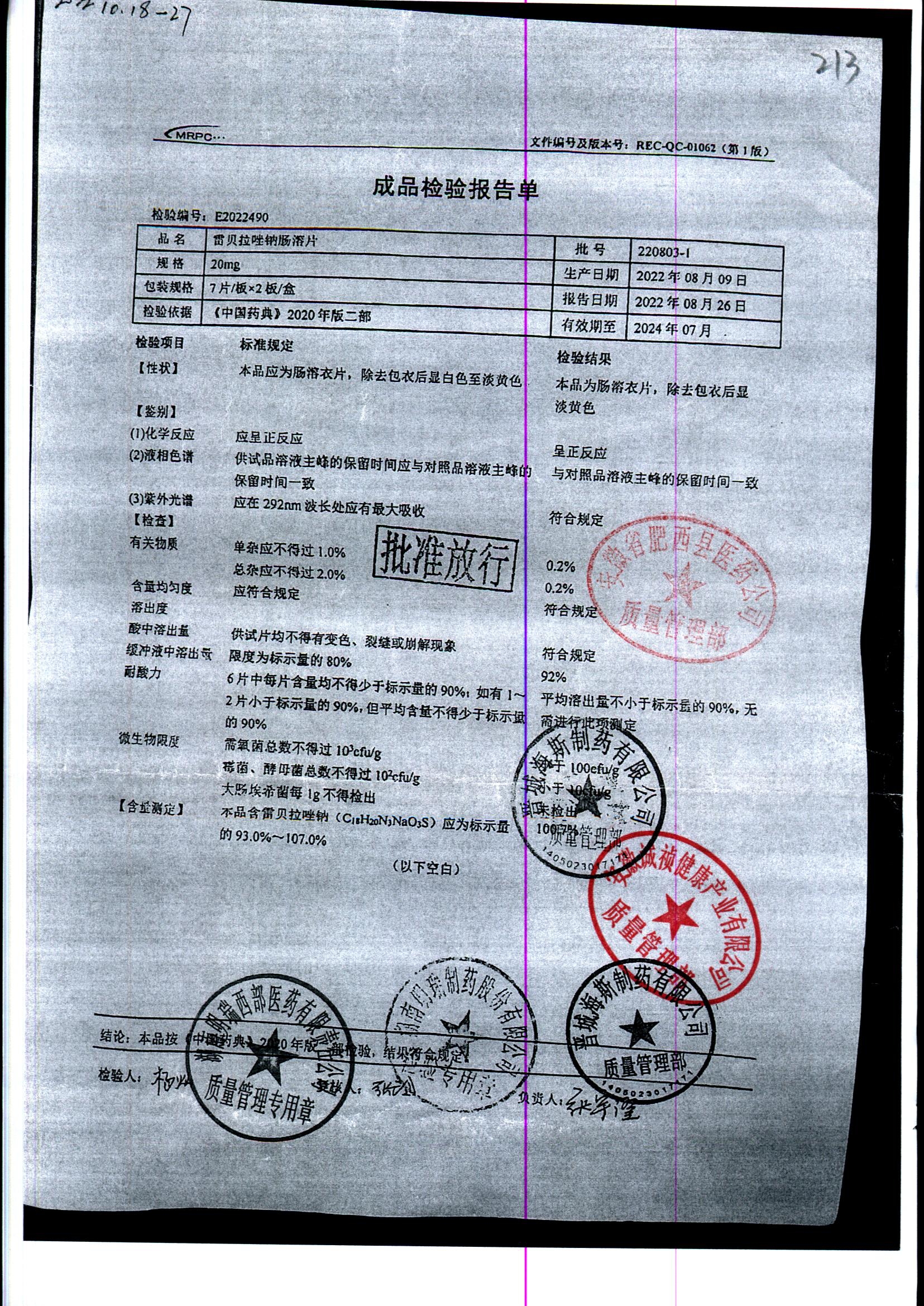| 雷貝拉唑鈉腸溶片 | 20mg*14片 | 20210816 | 查看詳情 |