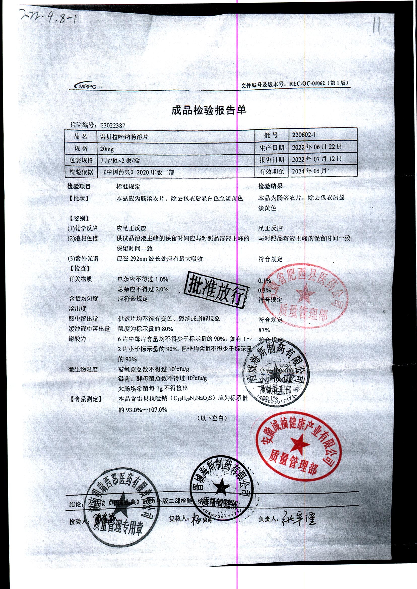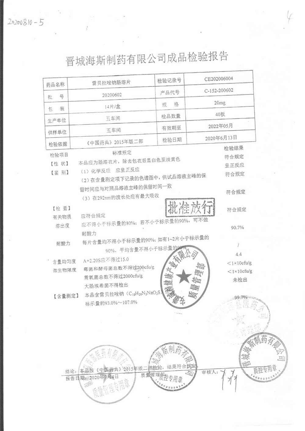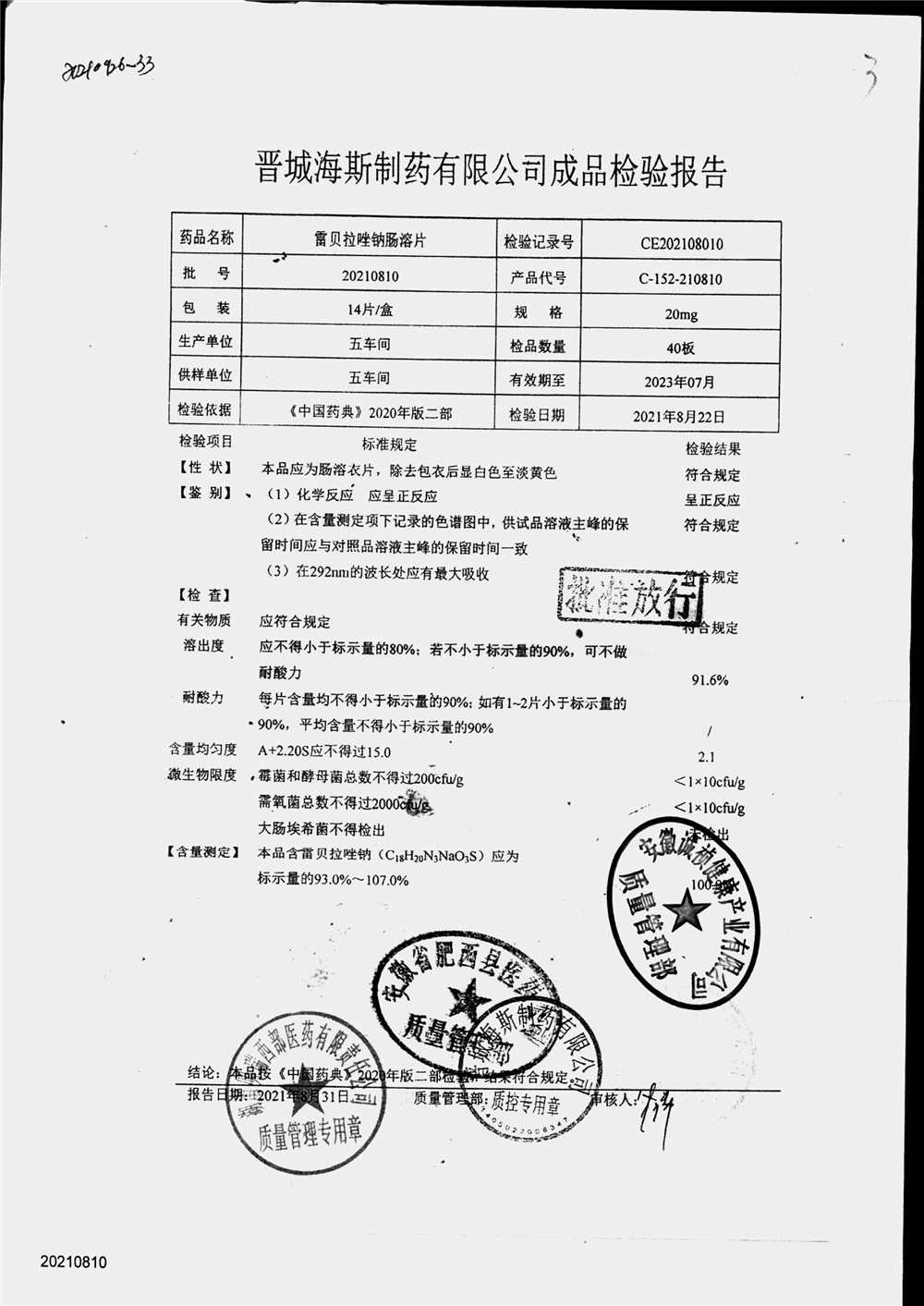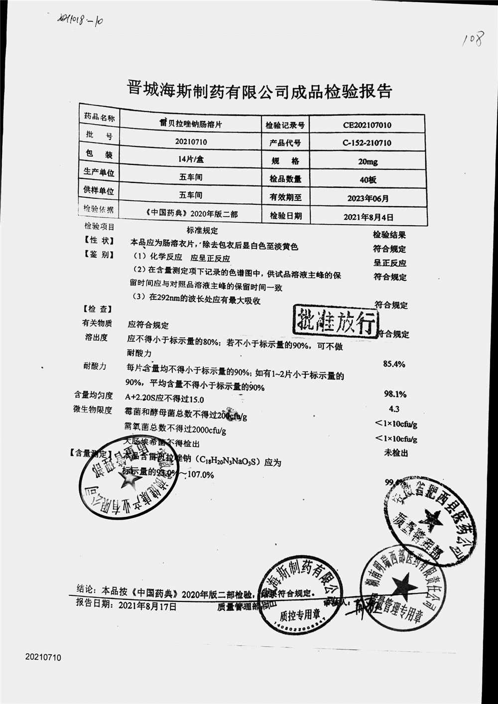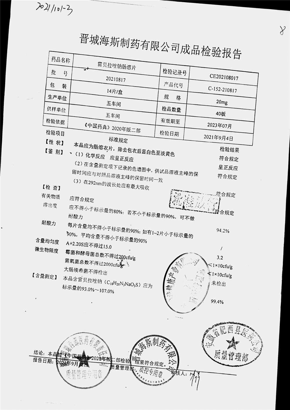 | 雷貝拉唑鈉腸溶片 | 20mg*14片 | 20210816 | 查看詳情 |