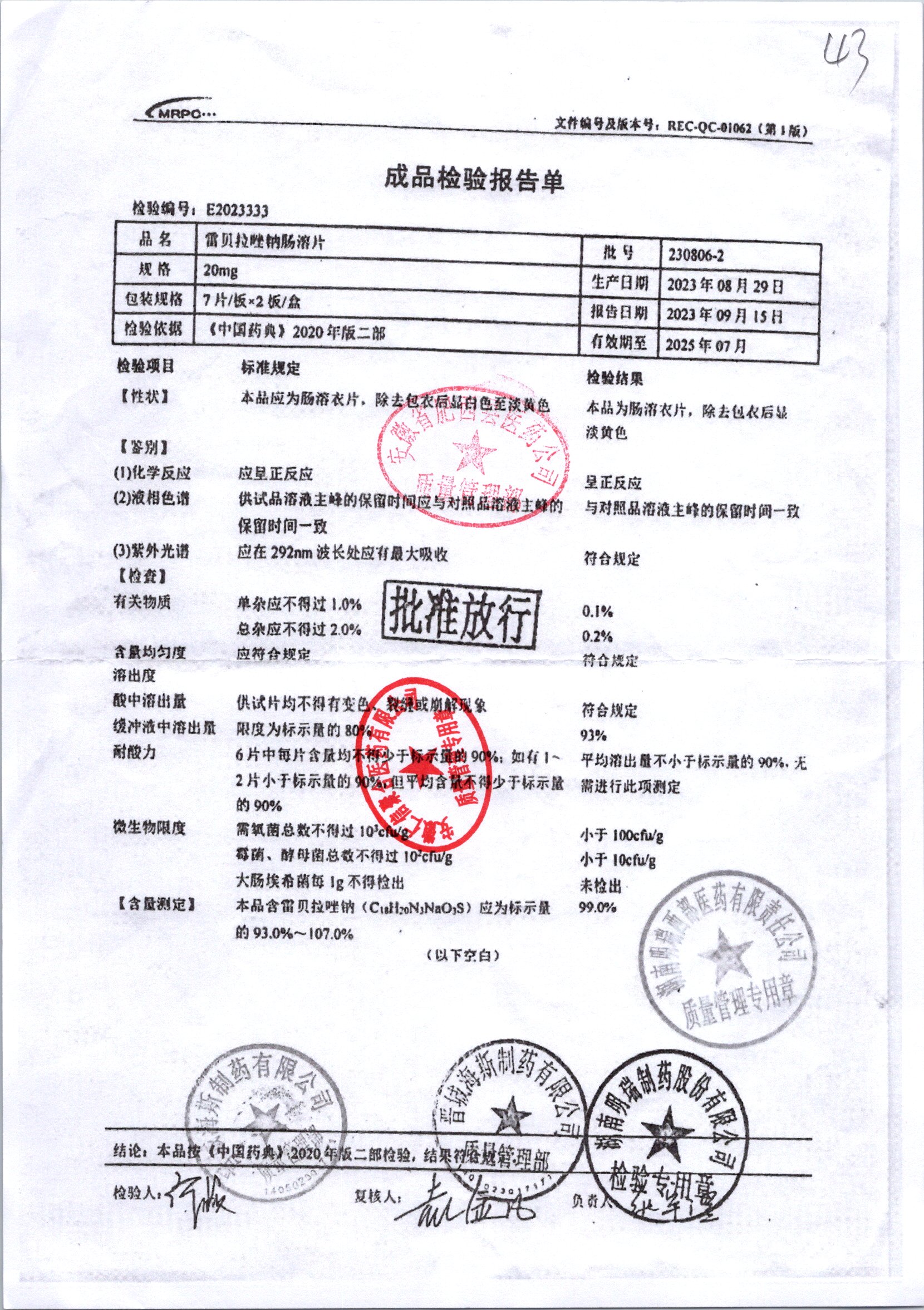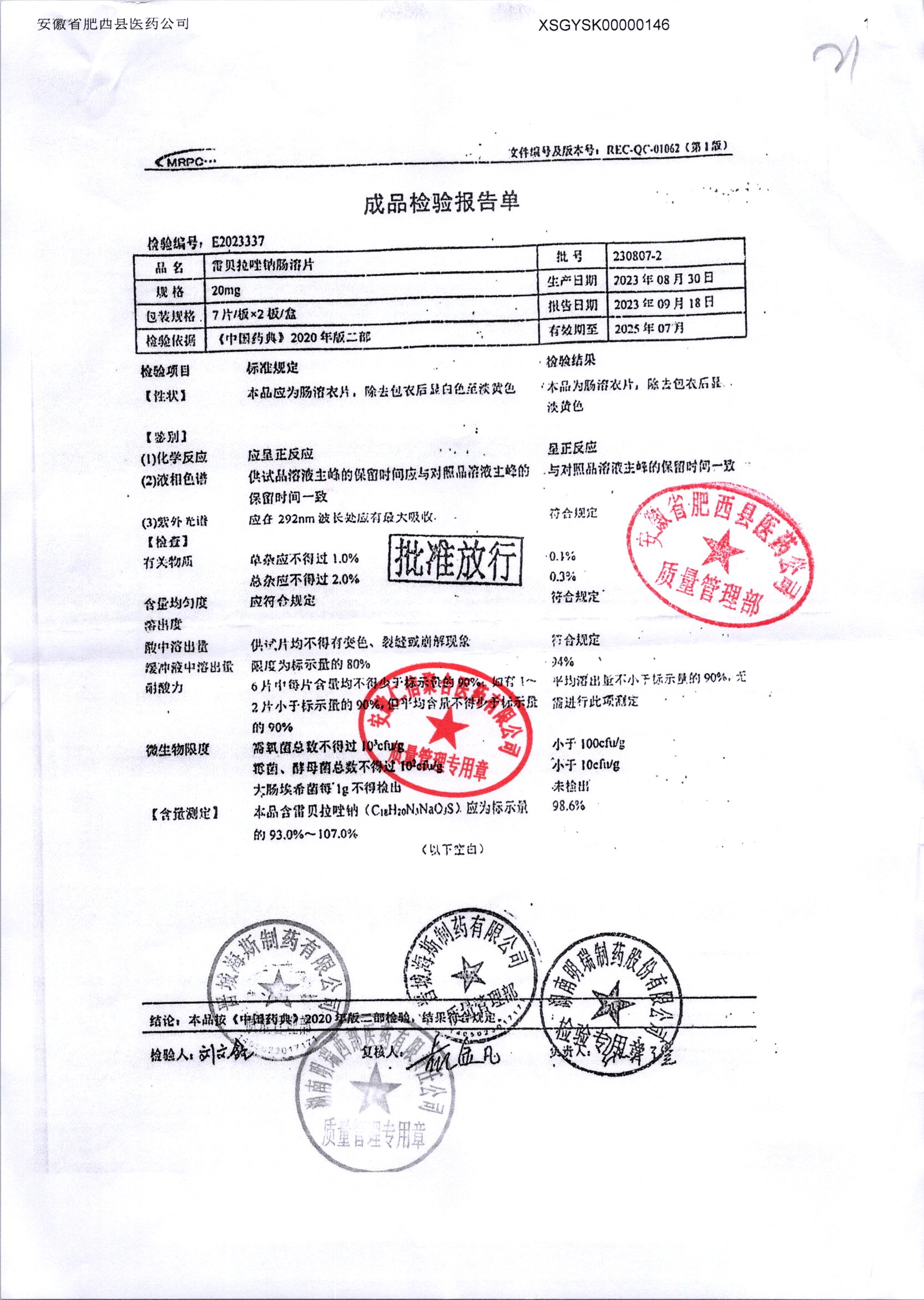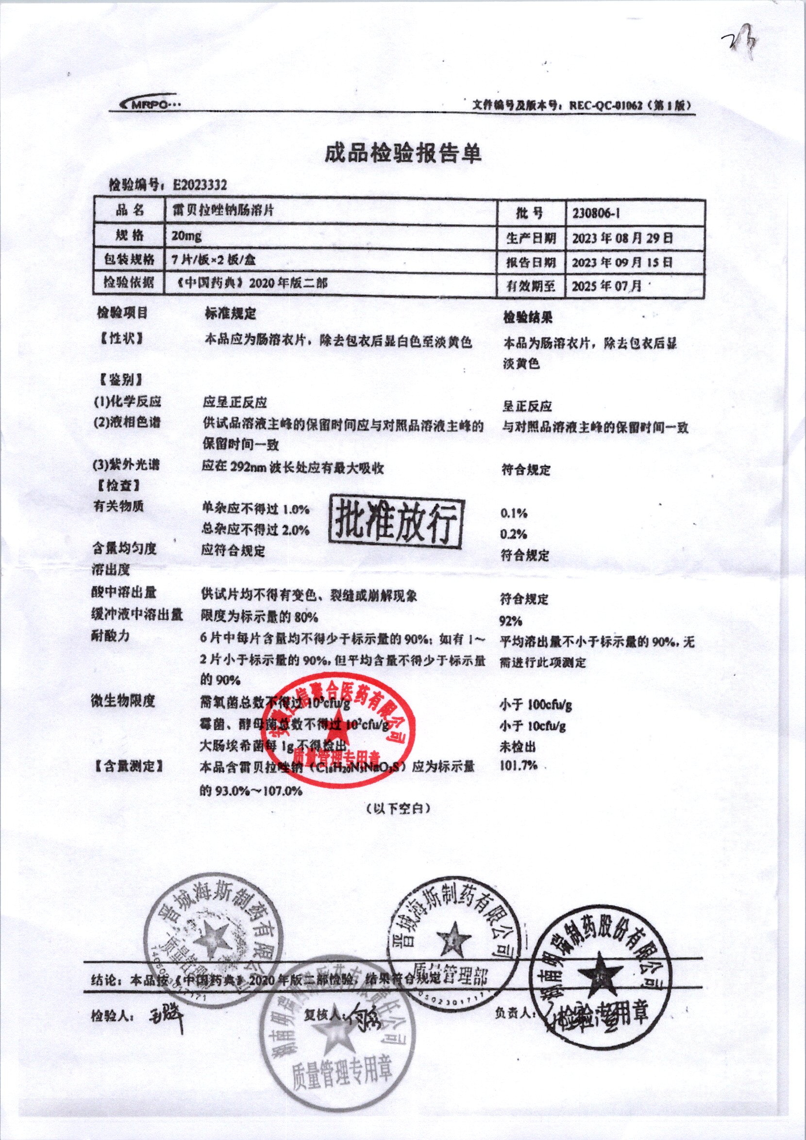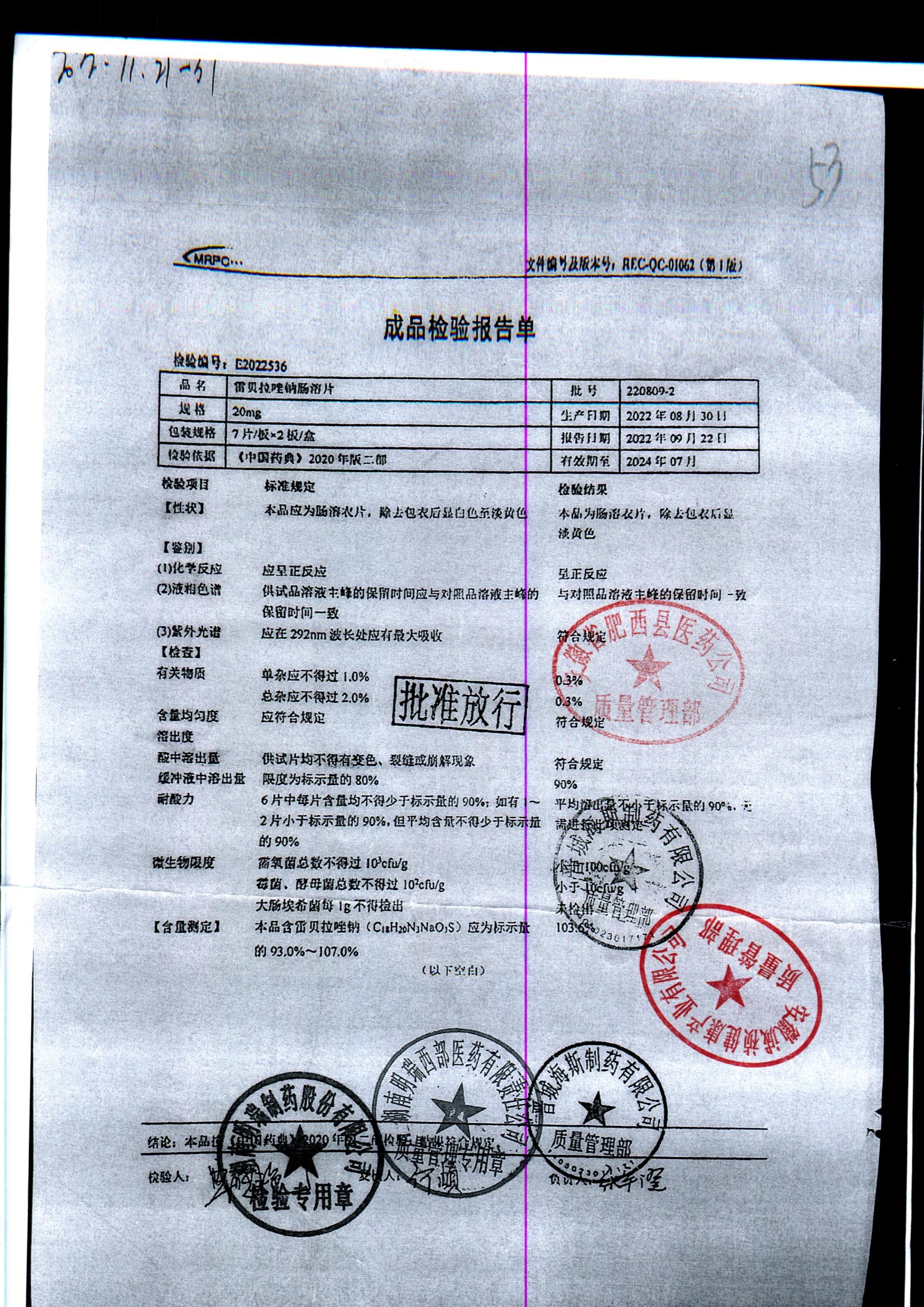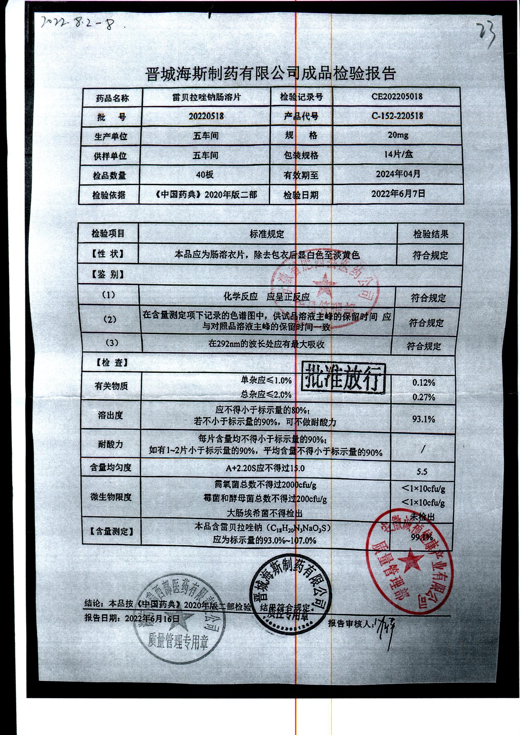 | 雷貝拉唑鈉腸溶片 | 20mg*14片 | 20210816 | 查看詳情 |