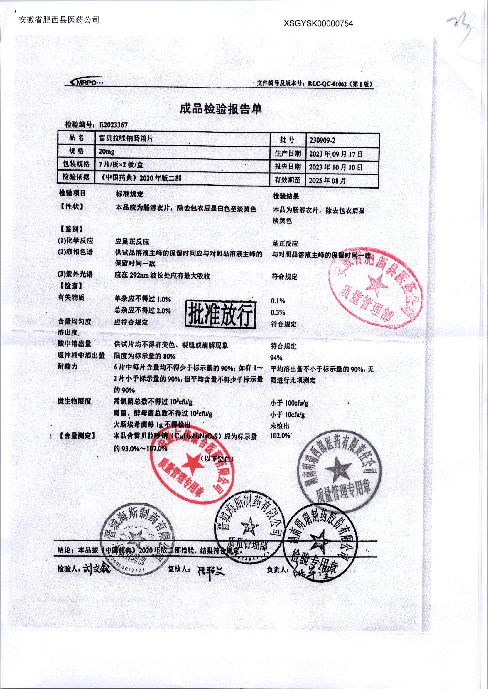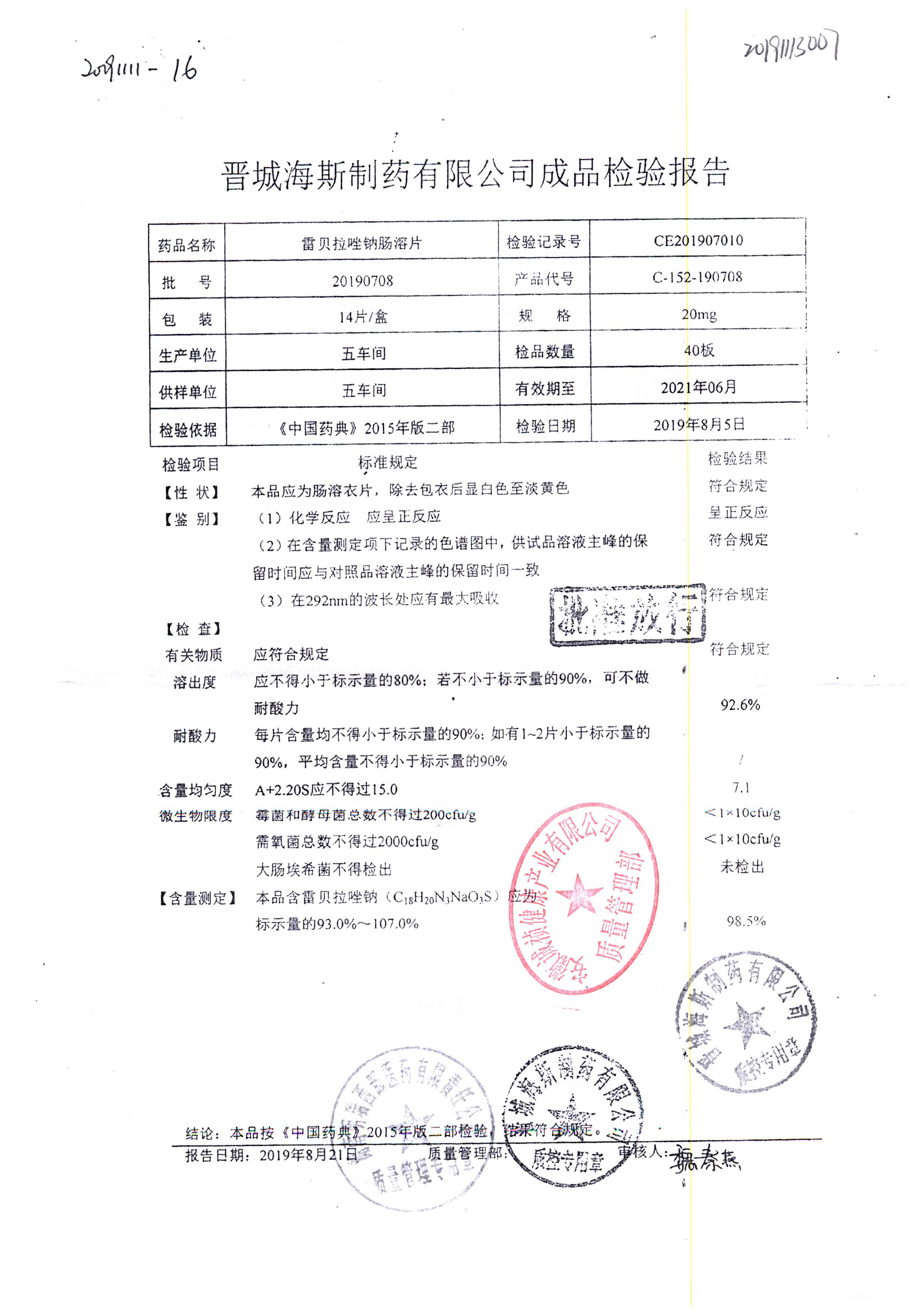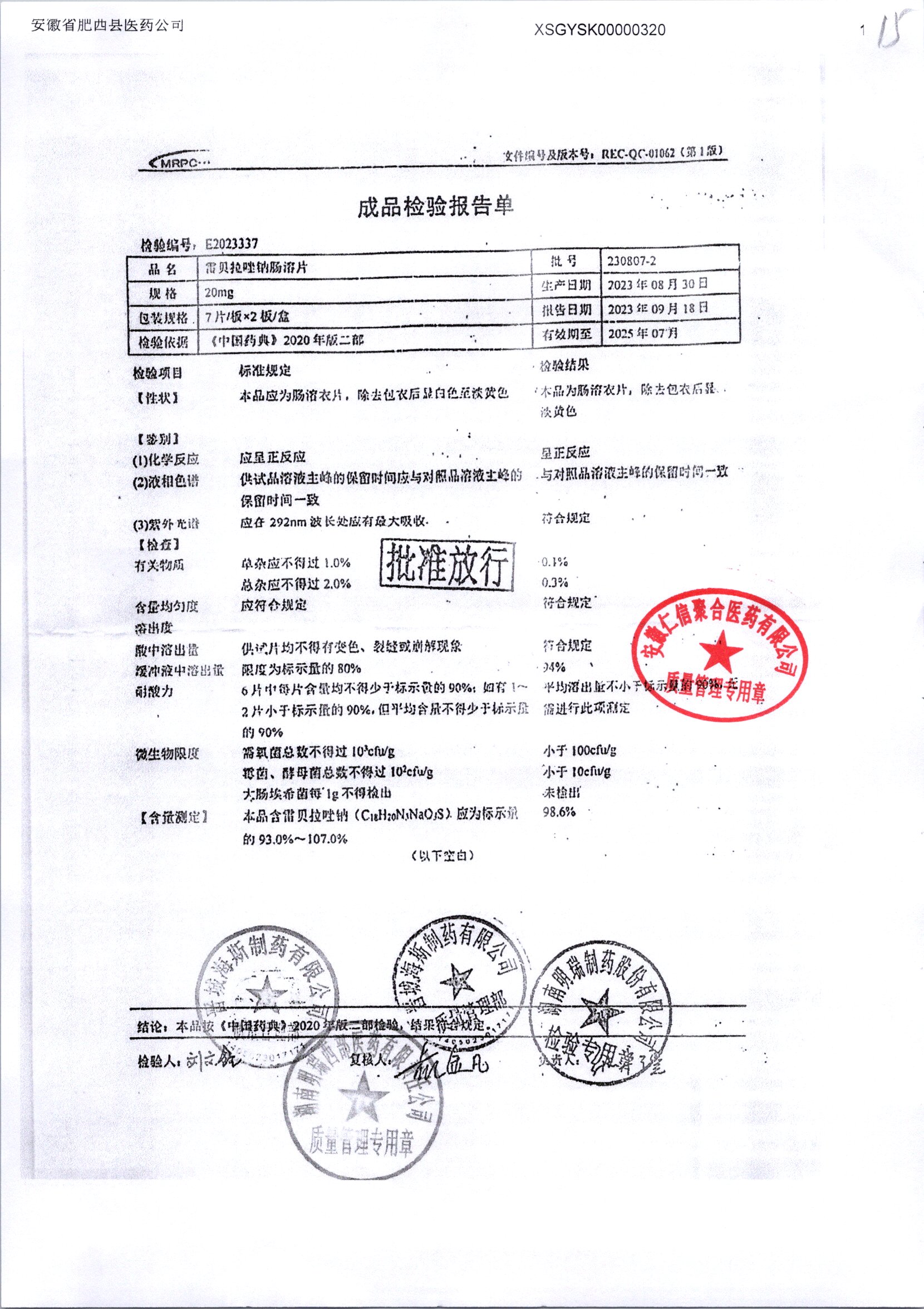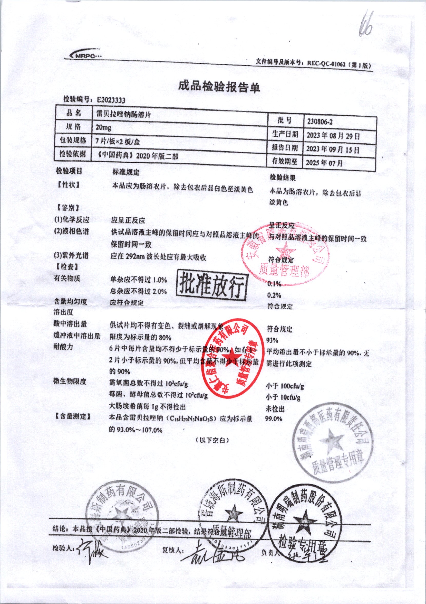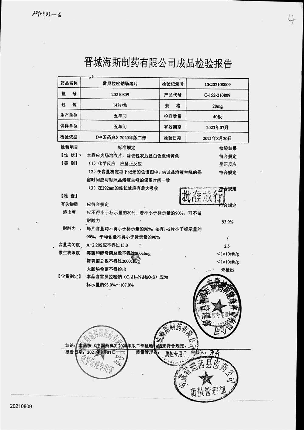| 雷貝拉唑鈉腸溶片 | 20mg*14片 | 20210816 | 查看詳情 |