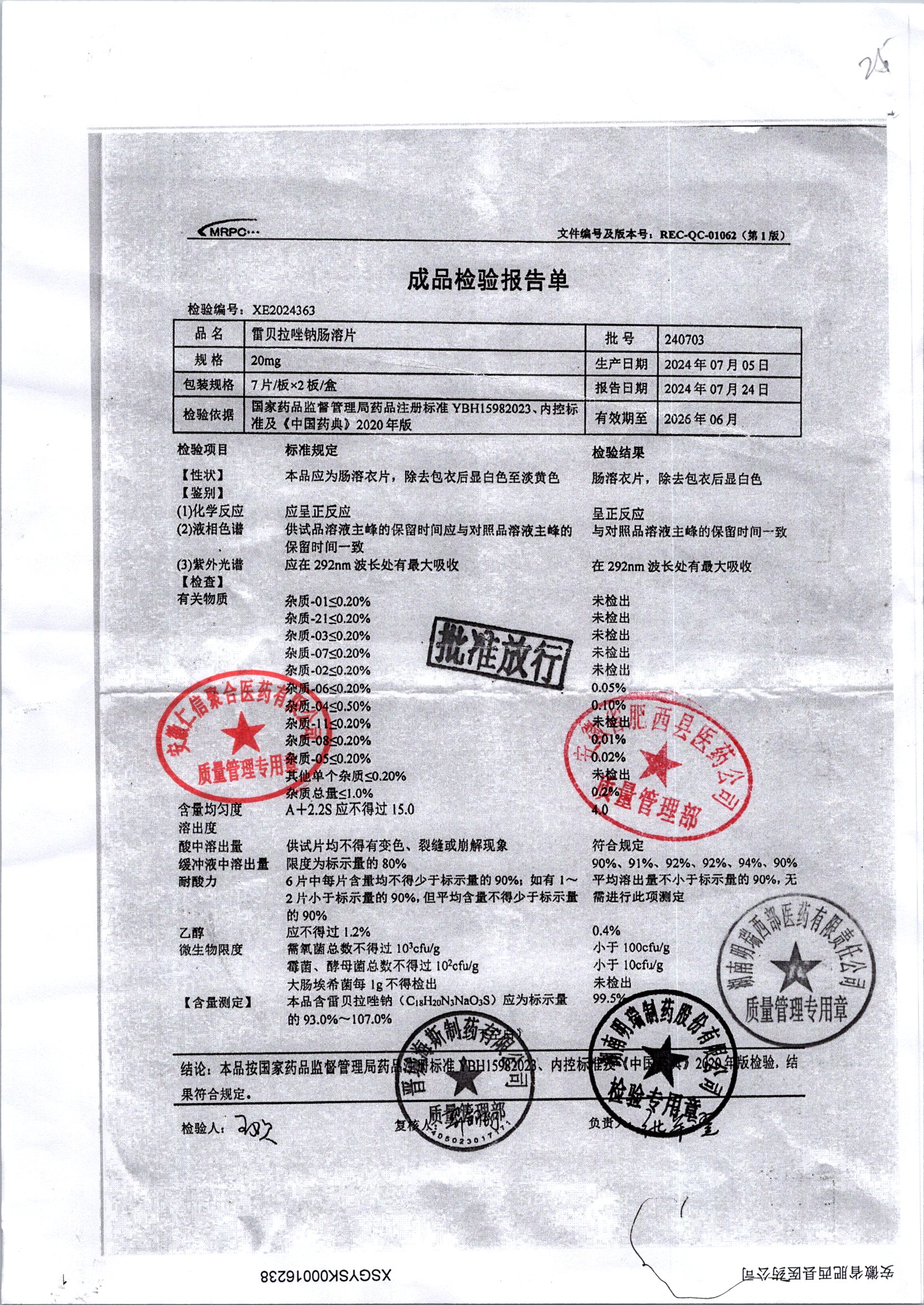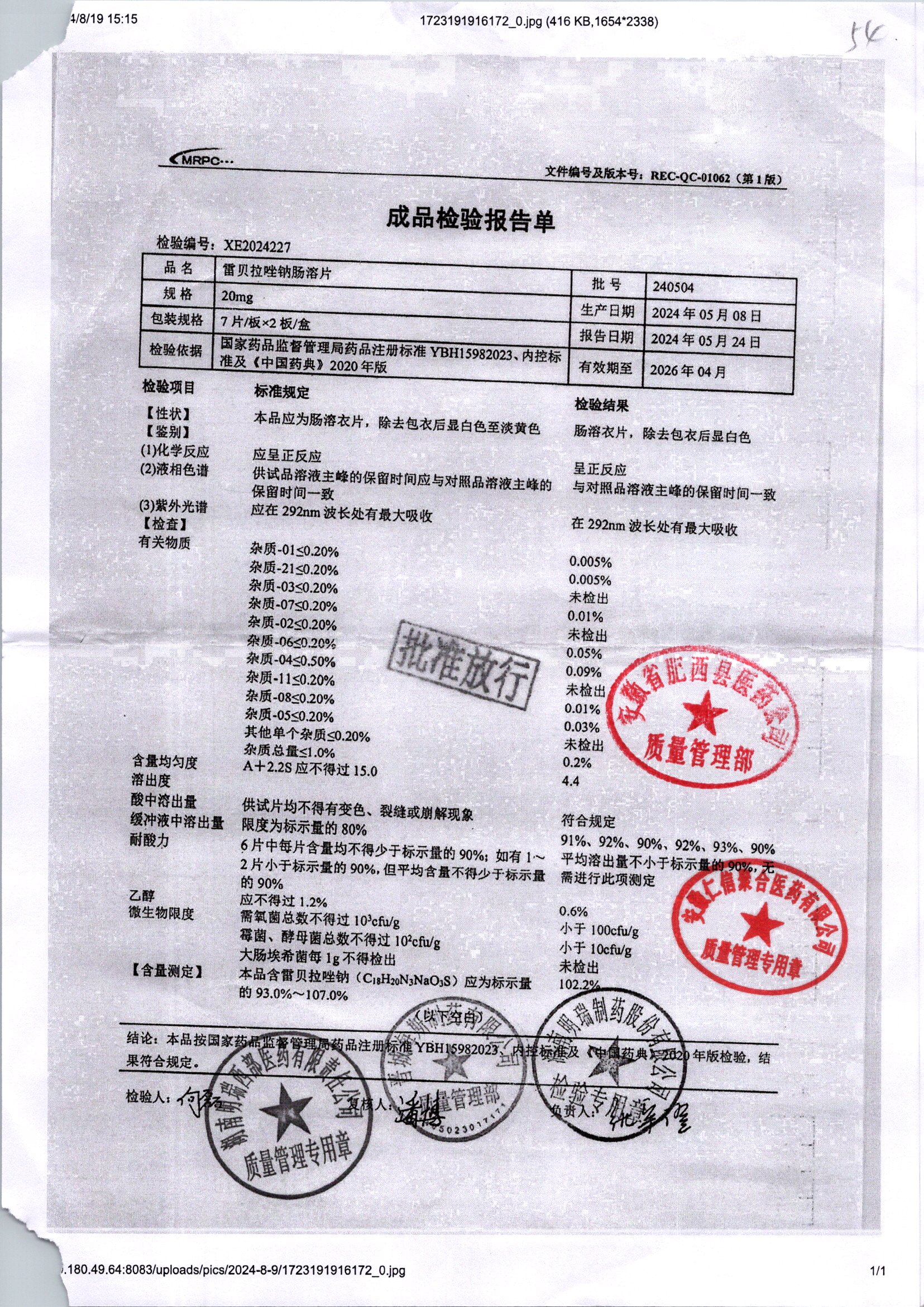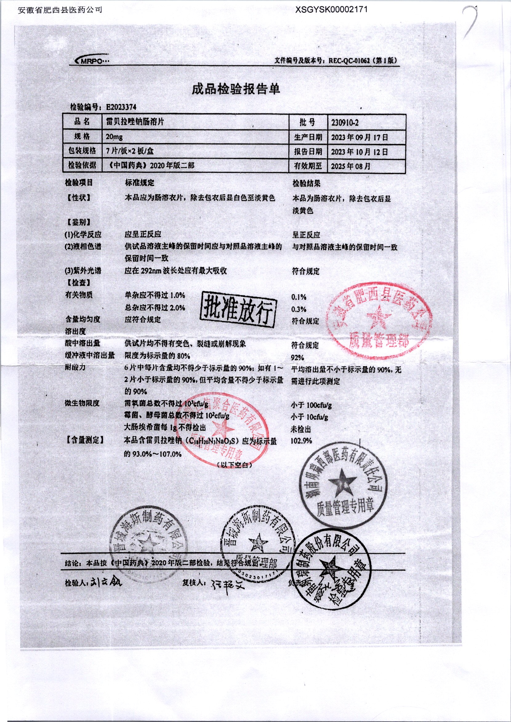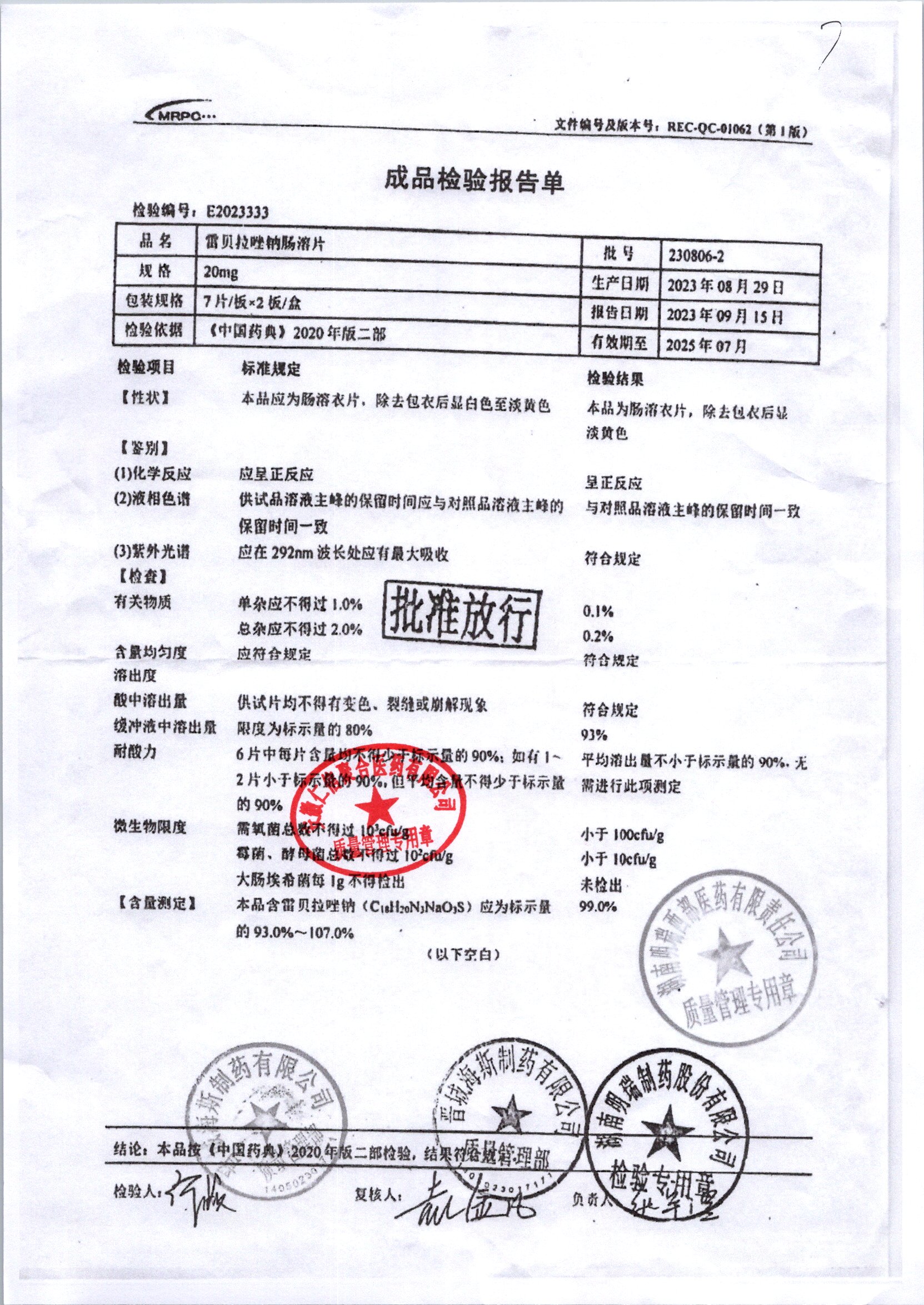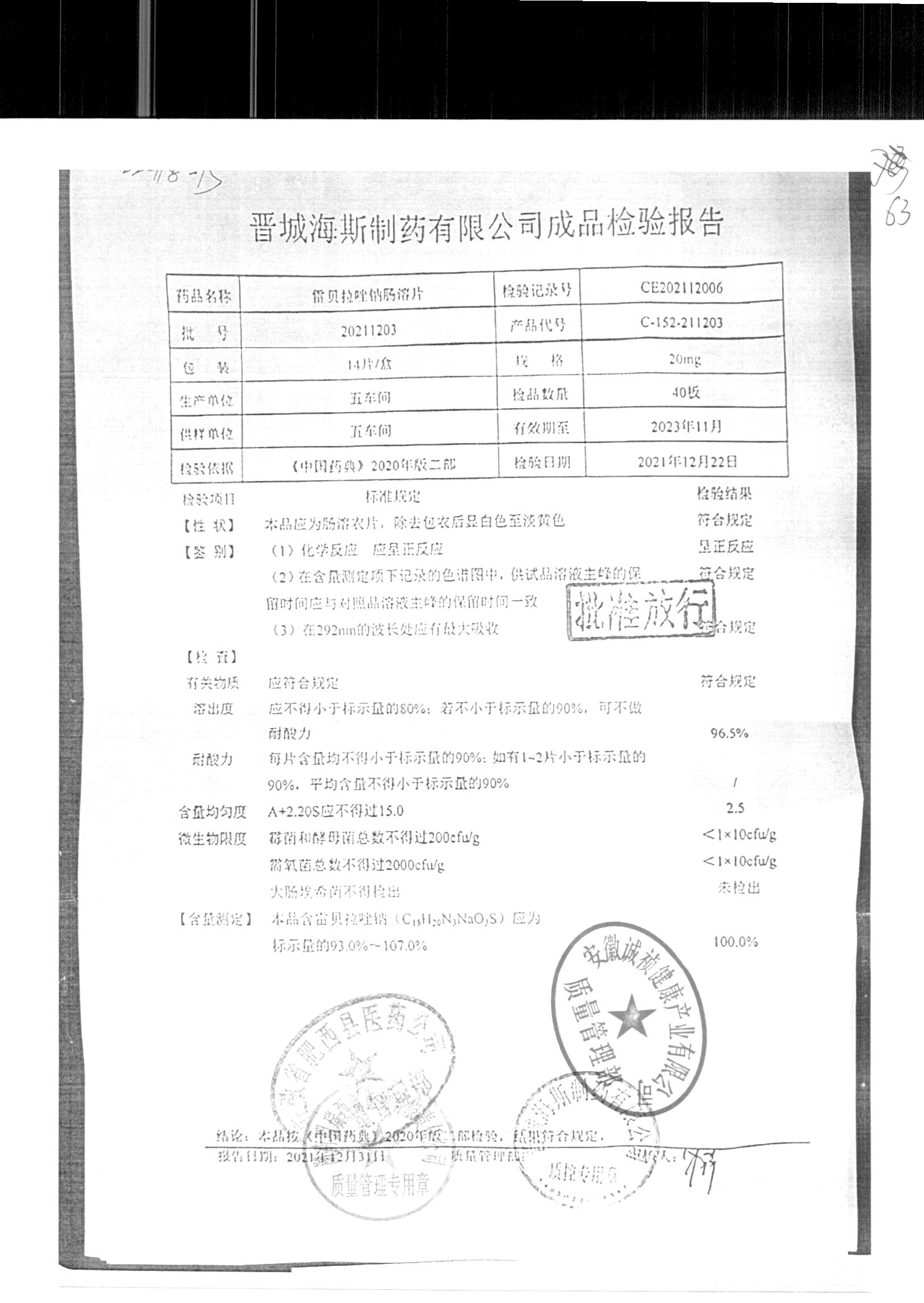 | 雷貝拉唑鈉腸溶片 | 20mg*14片 | 20210816 | 查看詳情 |