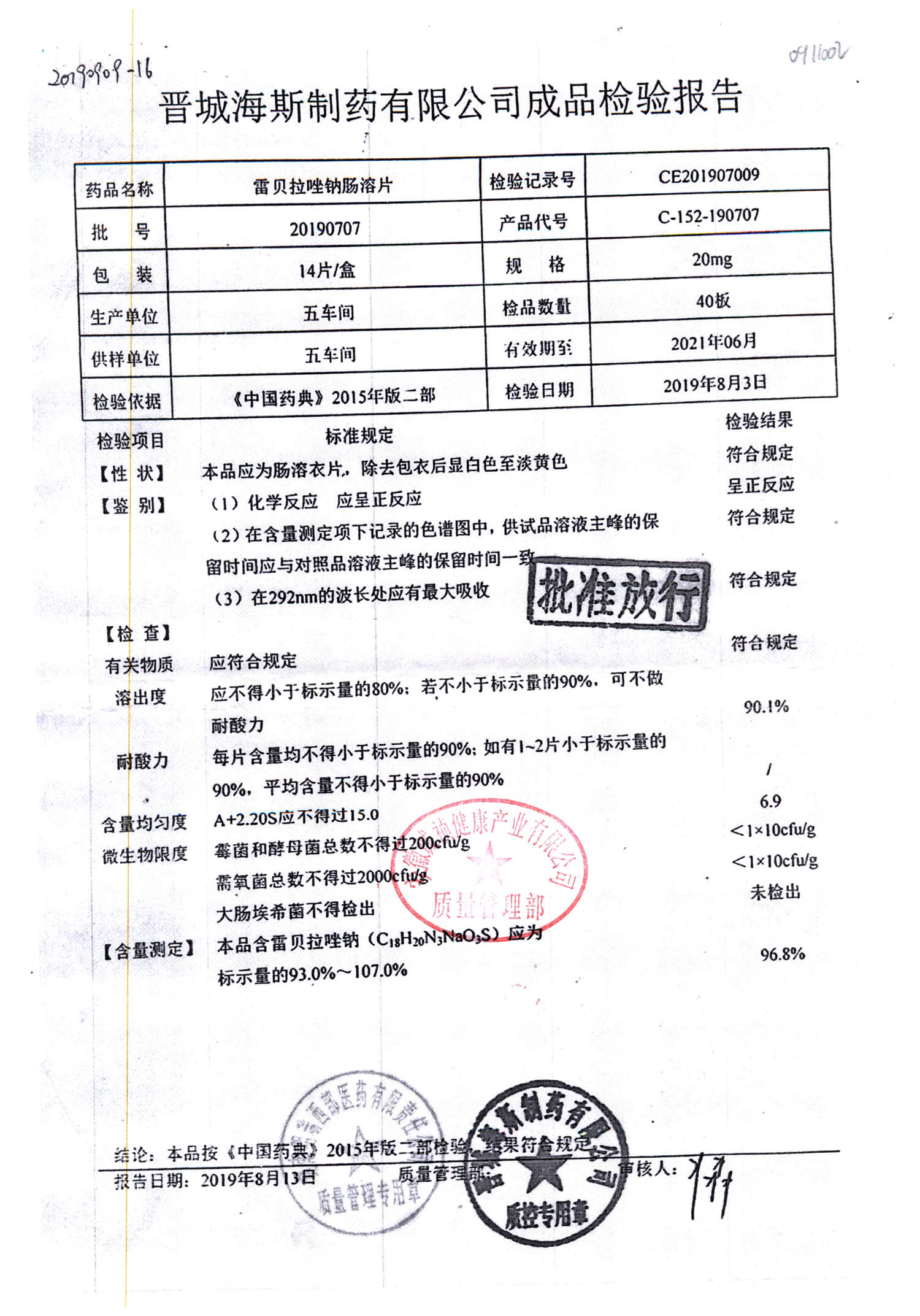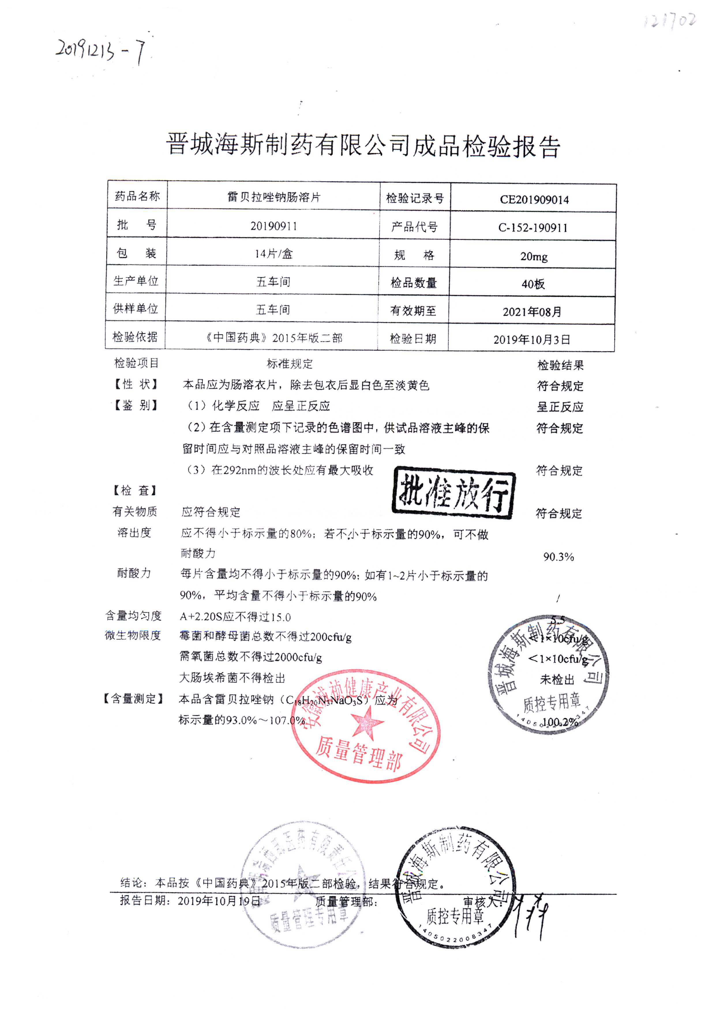 | 雷貝拉唑鈉腸溶片 | 20mg*14片 | 20190911 | 查看詳情 |