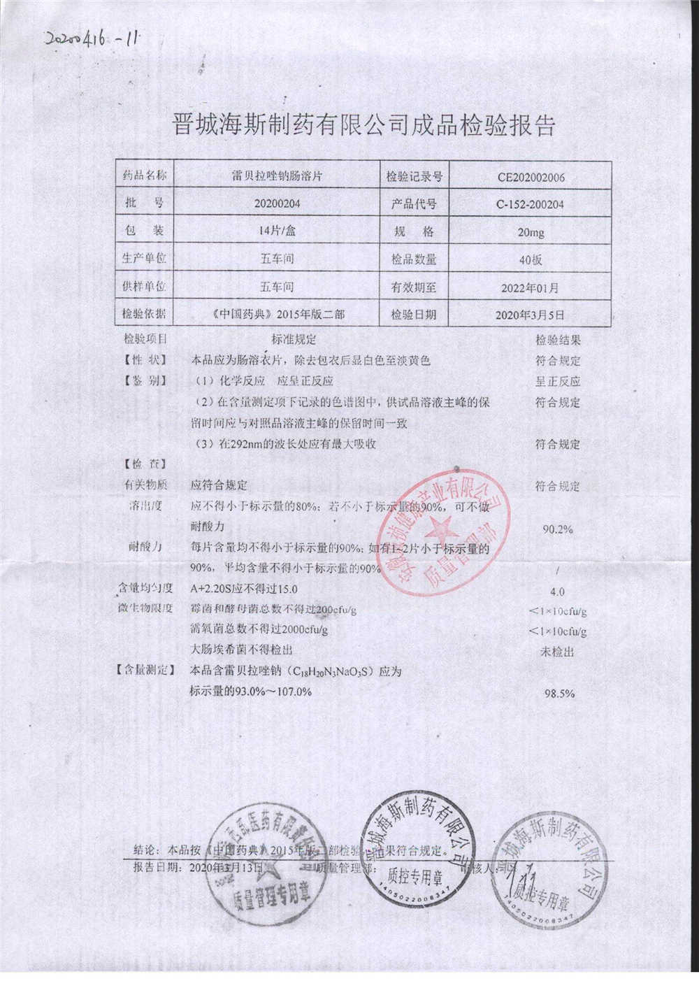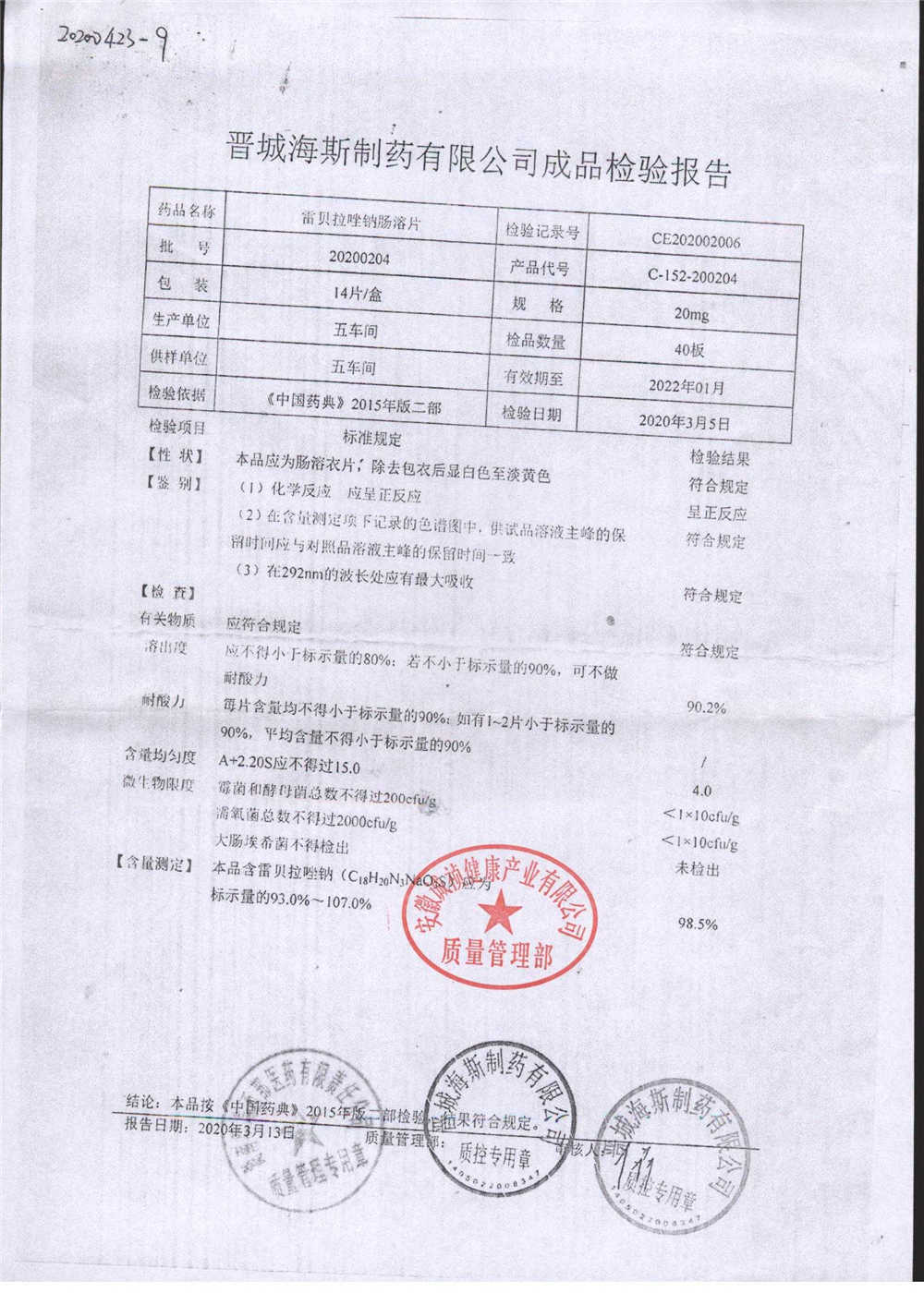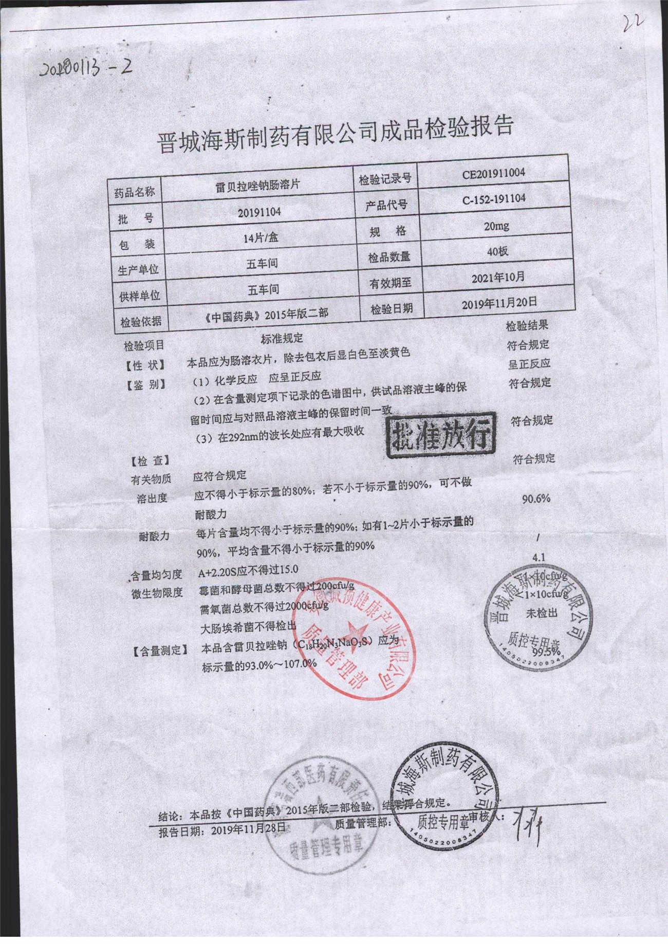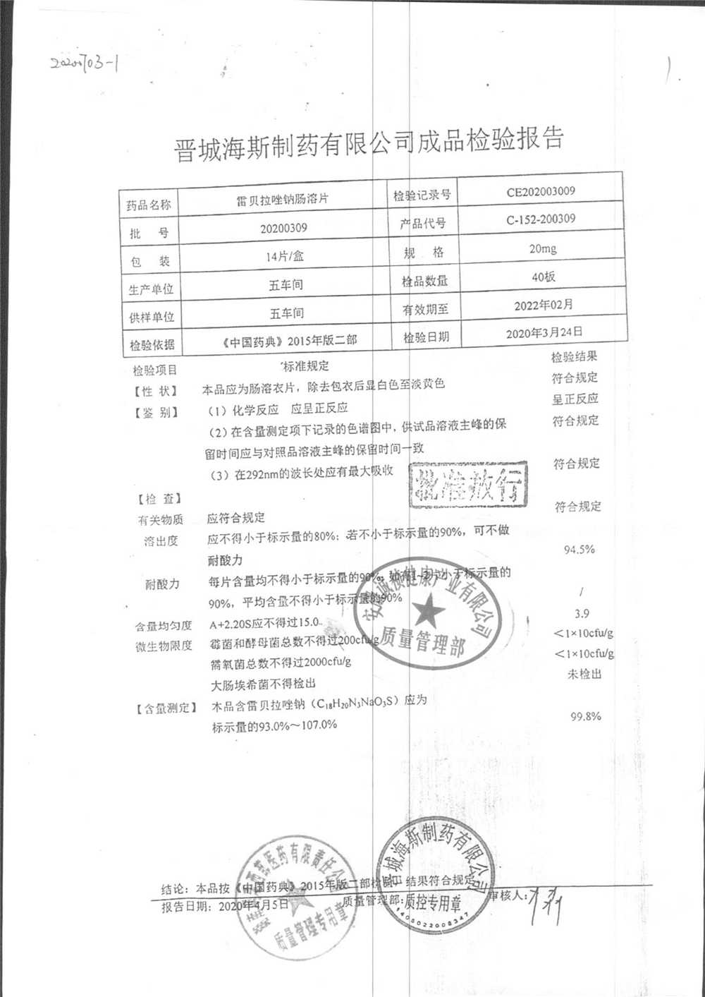 | 雷貝拉唑鈉腸溶片 | 20mg*14片 | 20200204 | 查看詳情 |