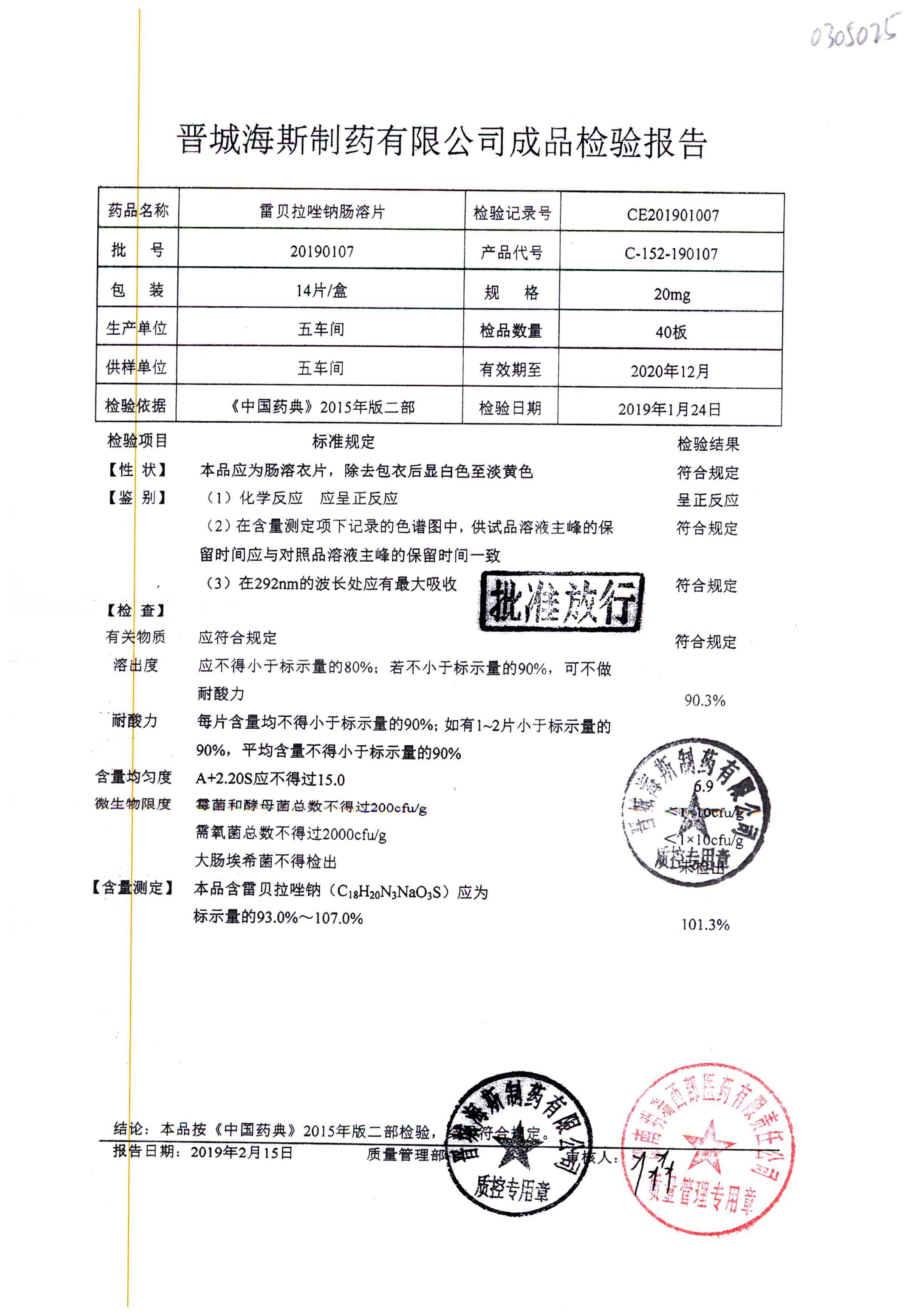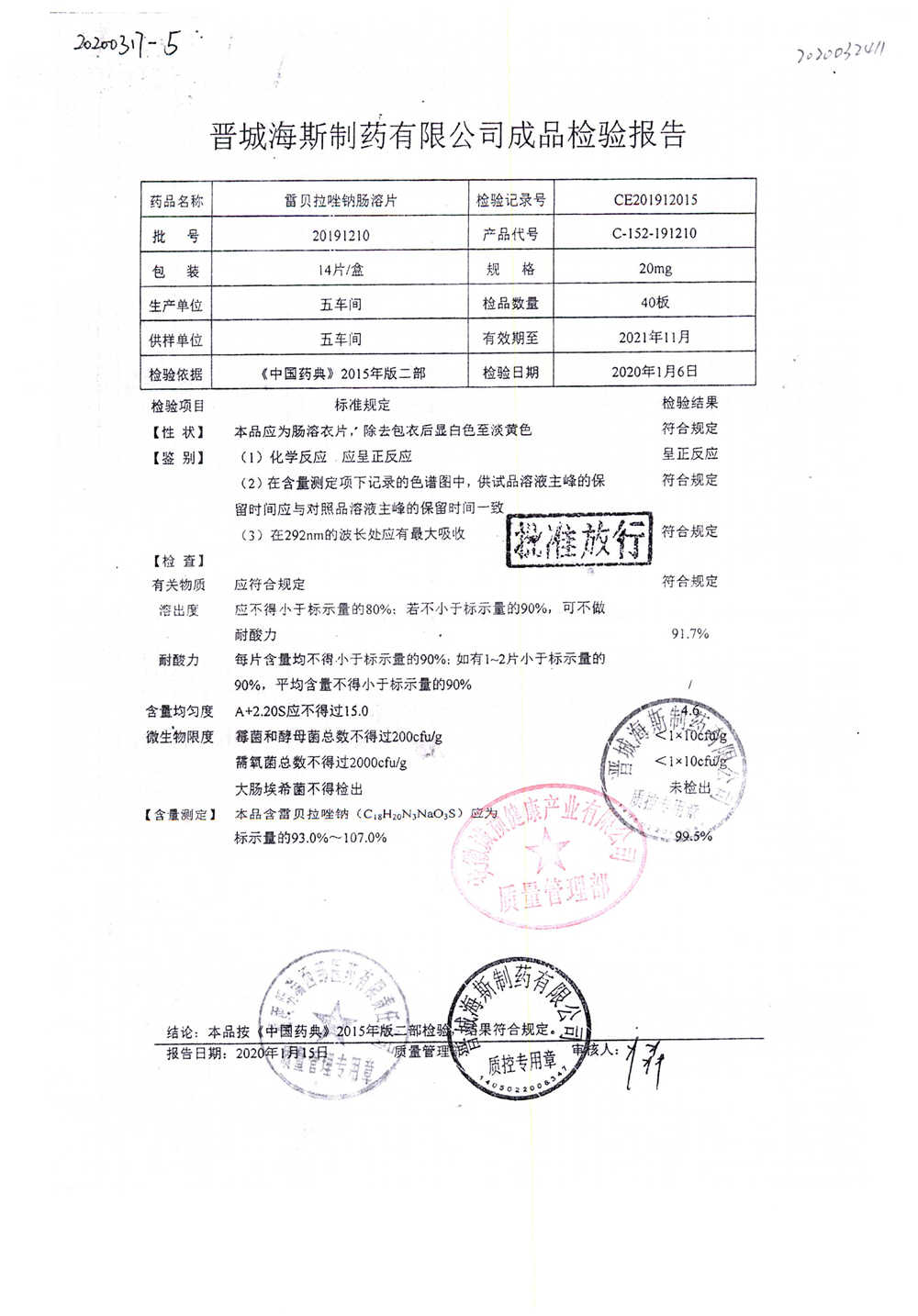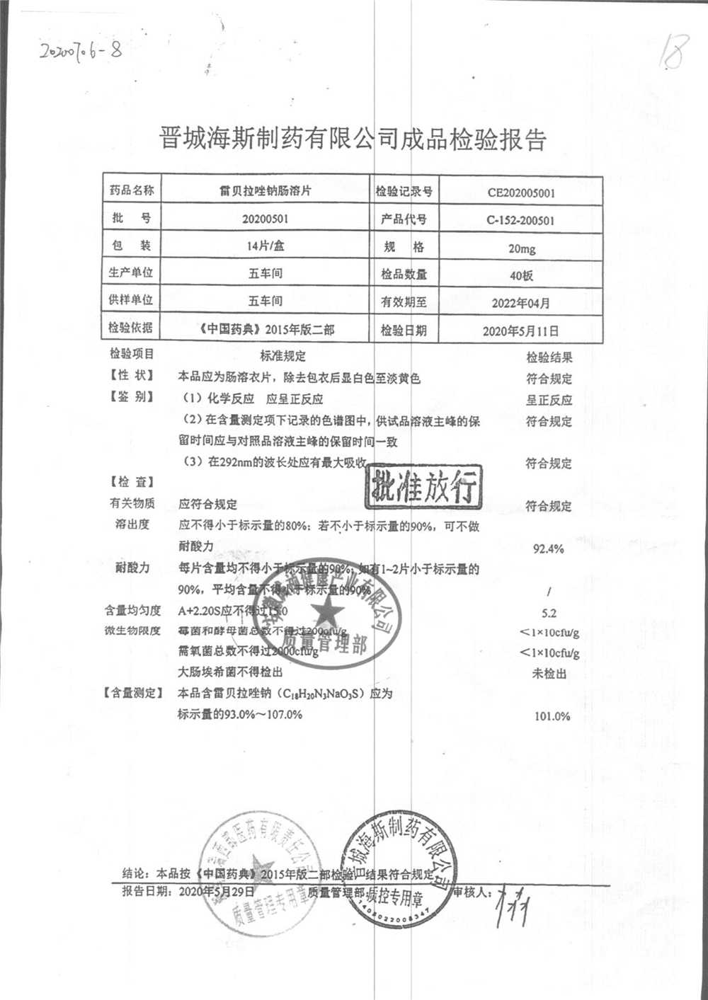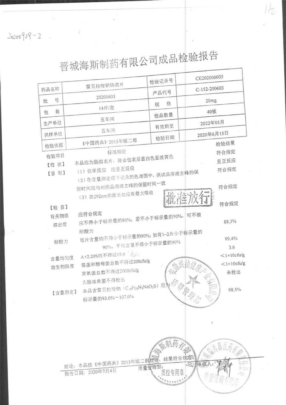 | 雷貝拉唑鈉腸溶片 | 20mg*14片 | 20200204 | 查看詳情 |