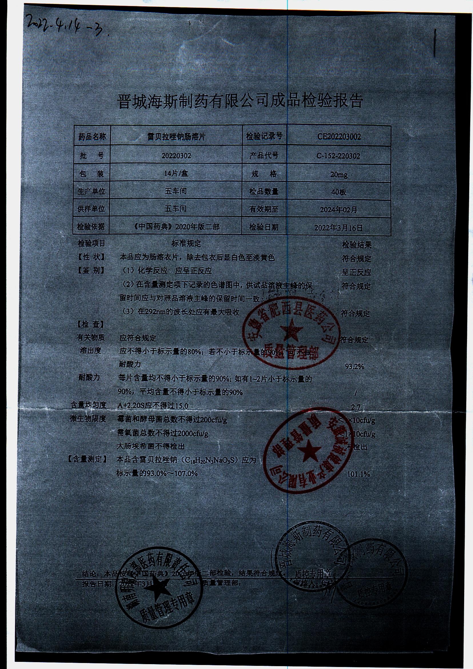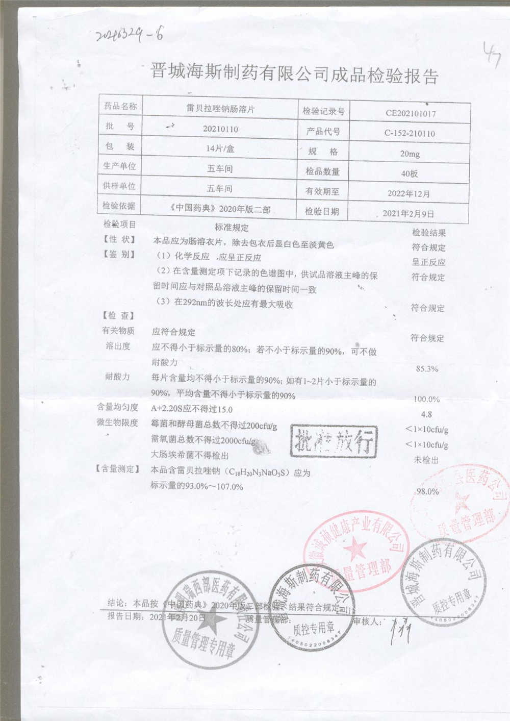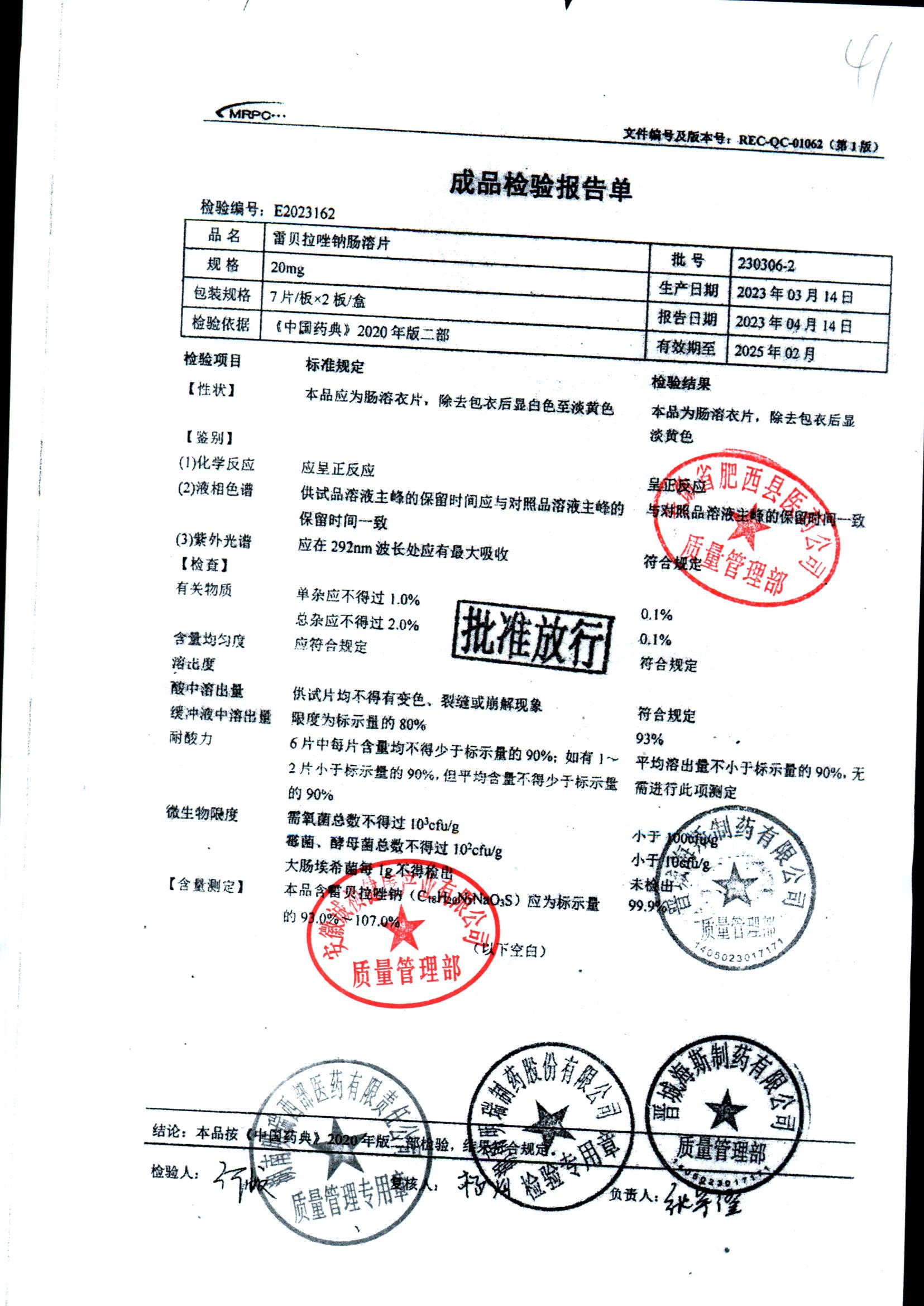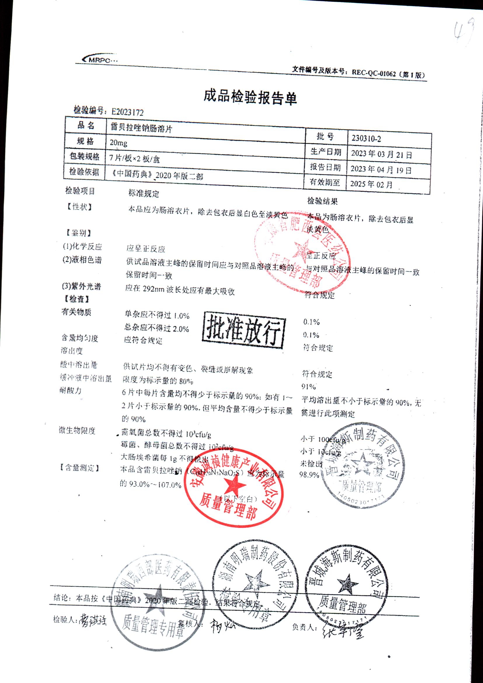 | 雷貝拉唑鈉腸溶片 | 20mg*14片 | 20210414 | 查看詳情 |
