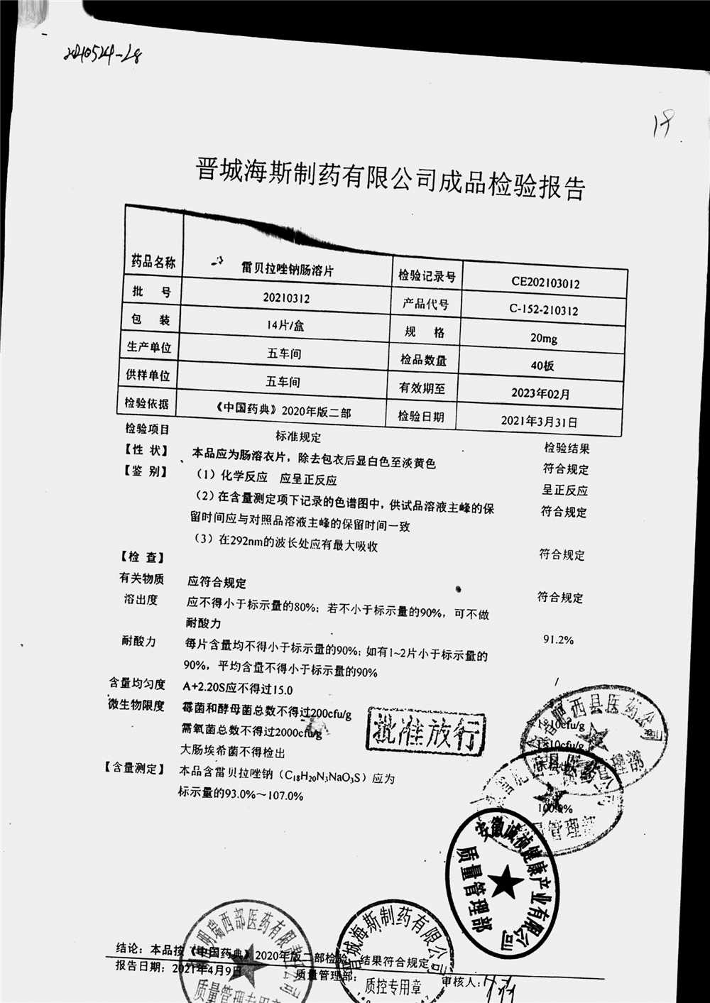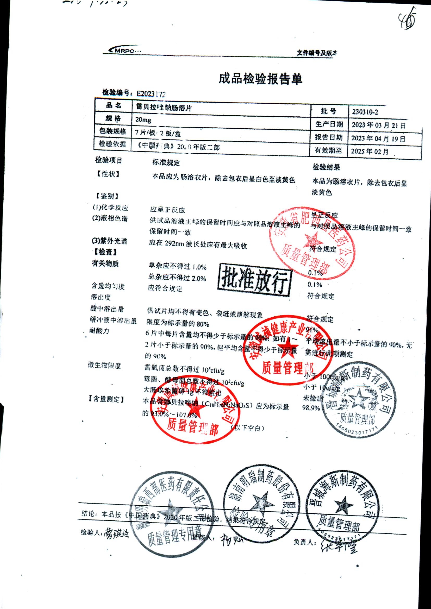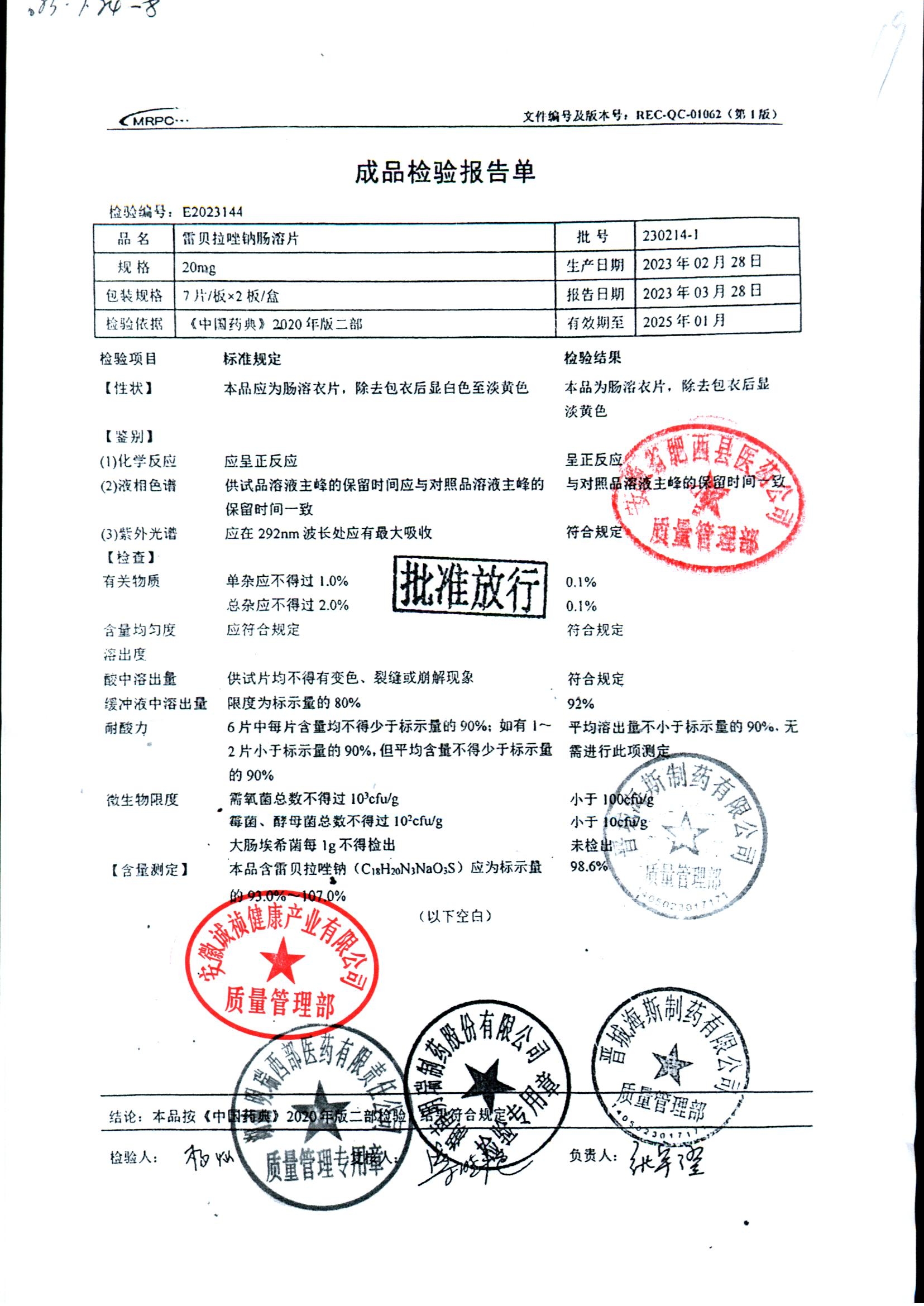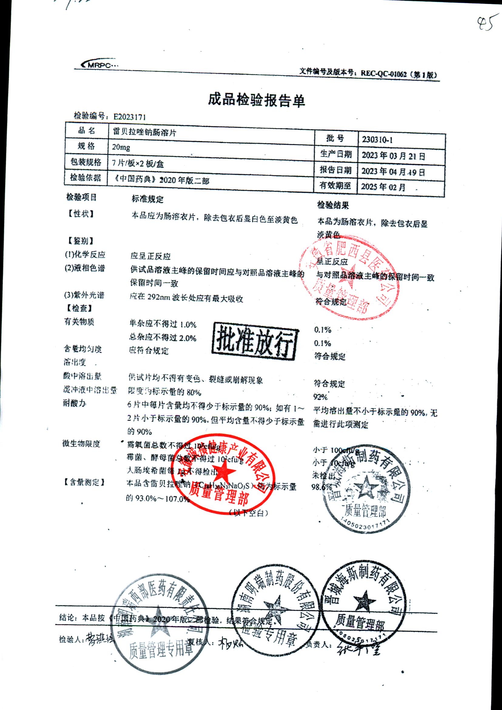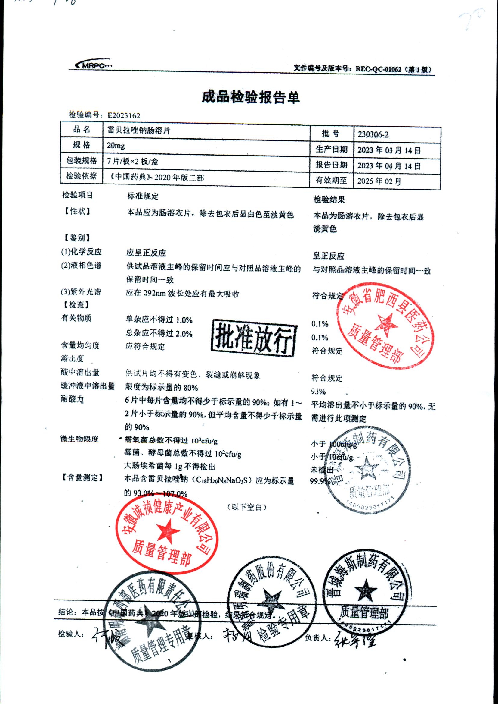| 雷貝拉唑鈉腸溶片 | 20mg*14片 | 20210414 | 查看詳情 |