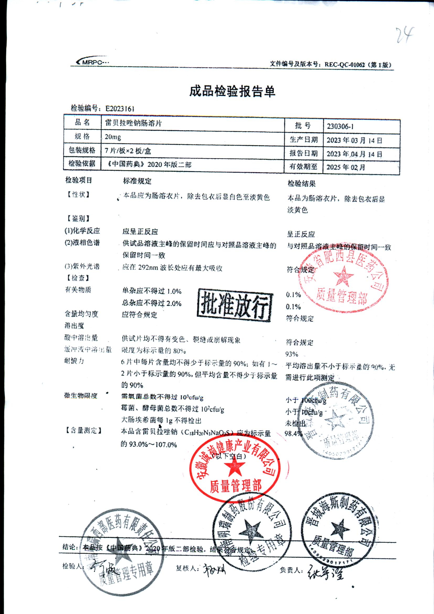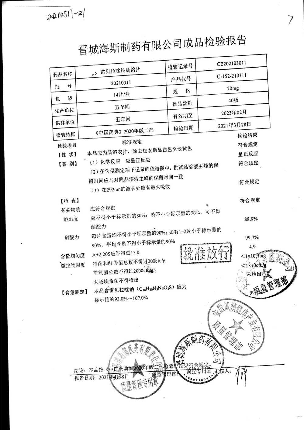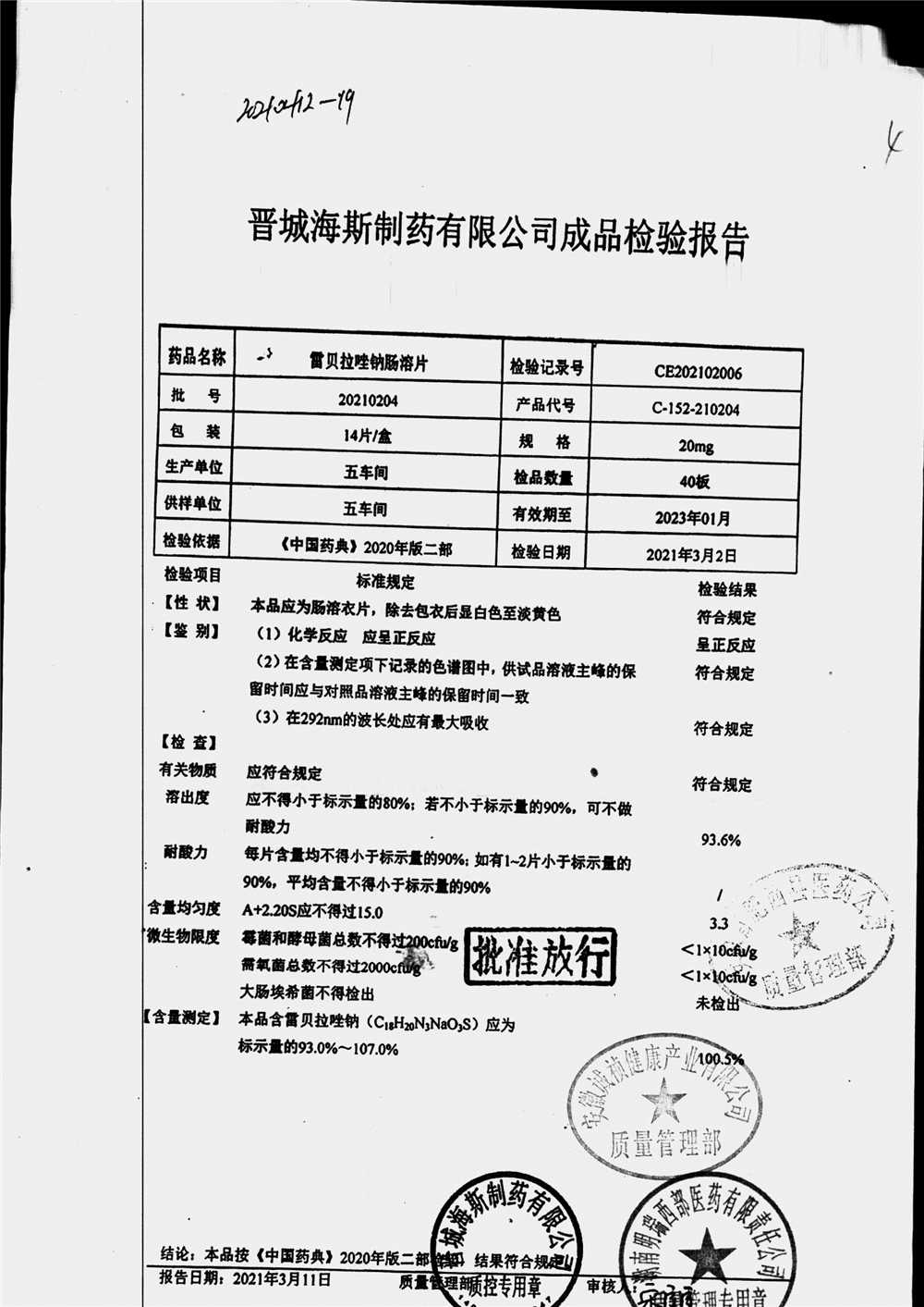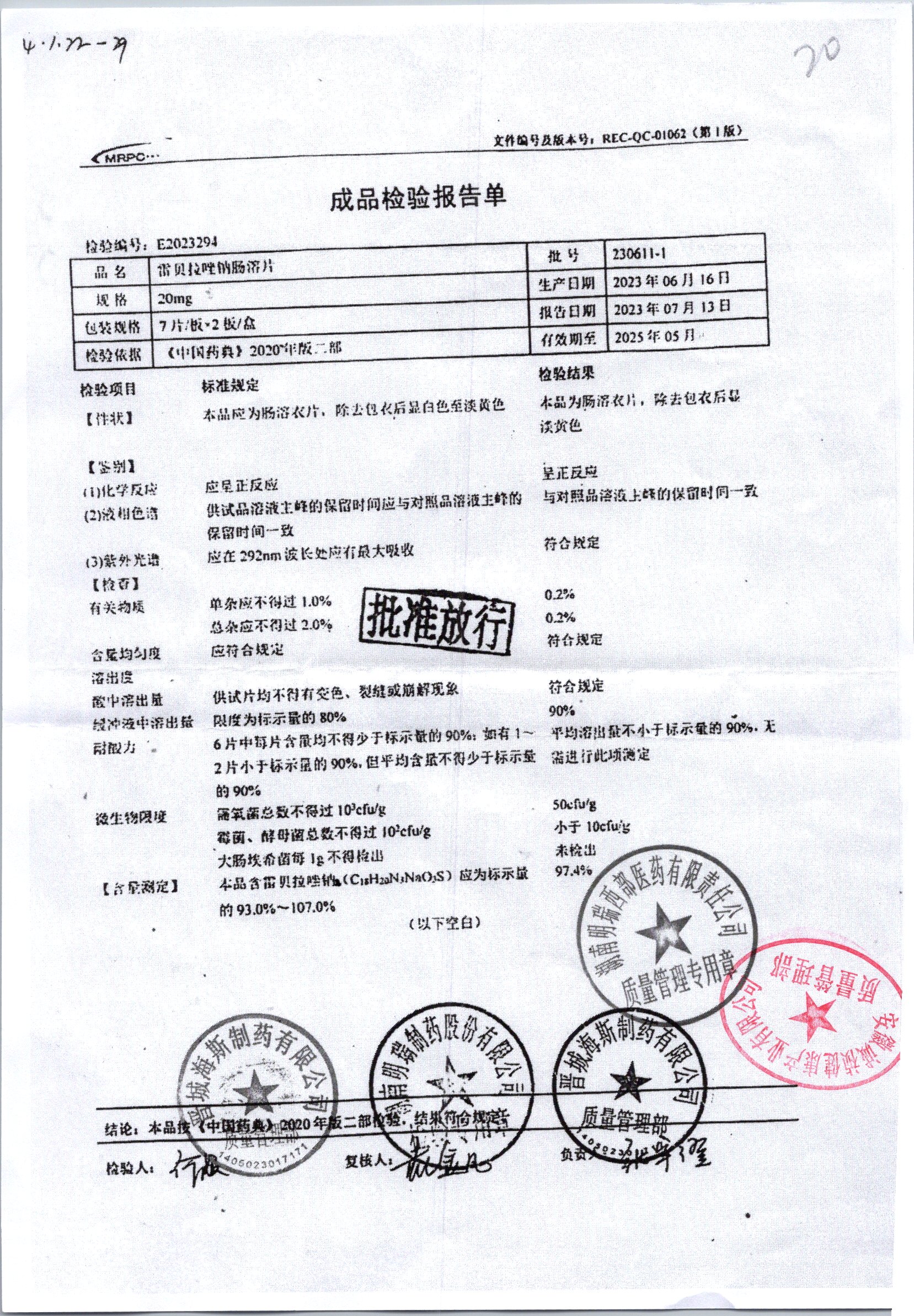 | 雷貝拉唑鈉腸溶片 | 20mg*14片 | 20210414 | 查看詳情 |
