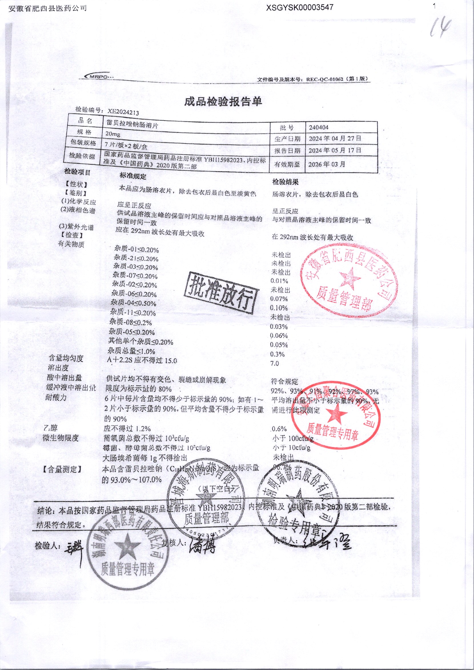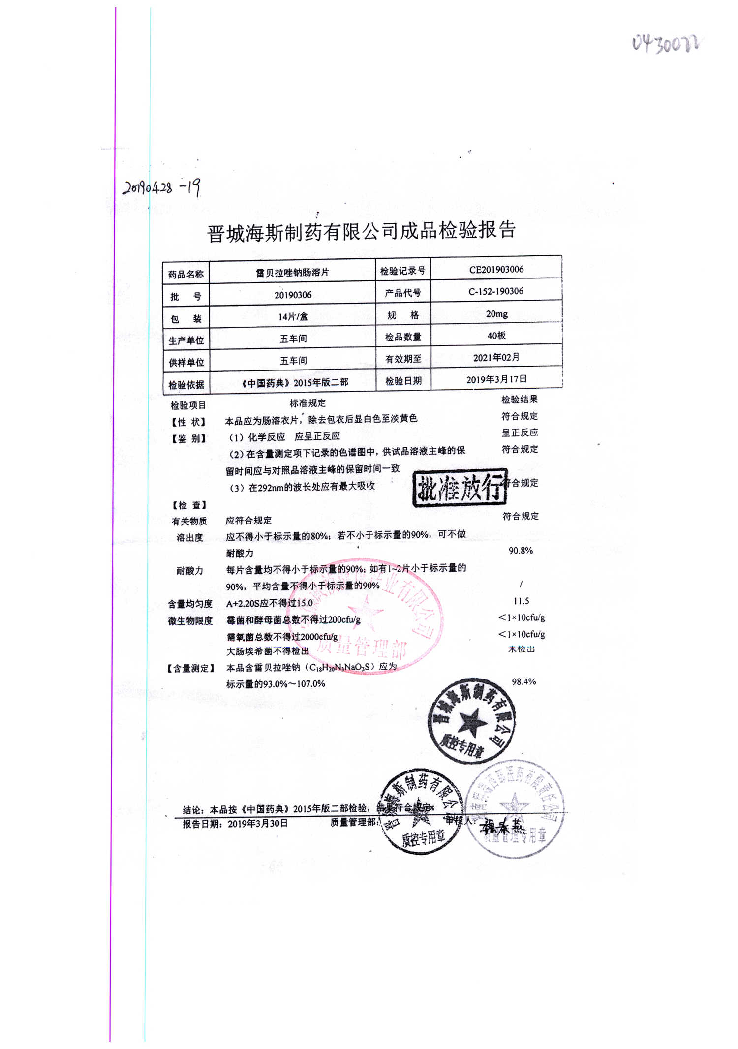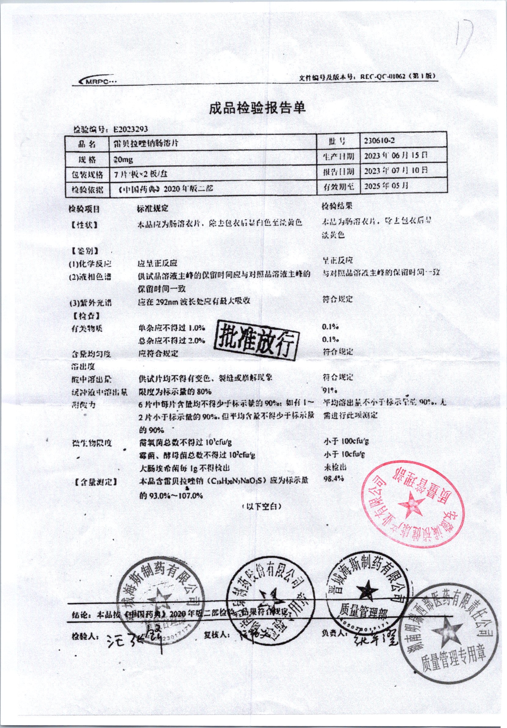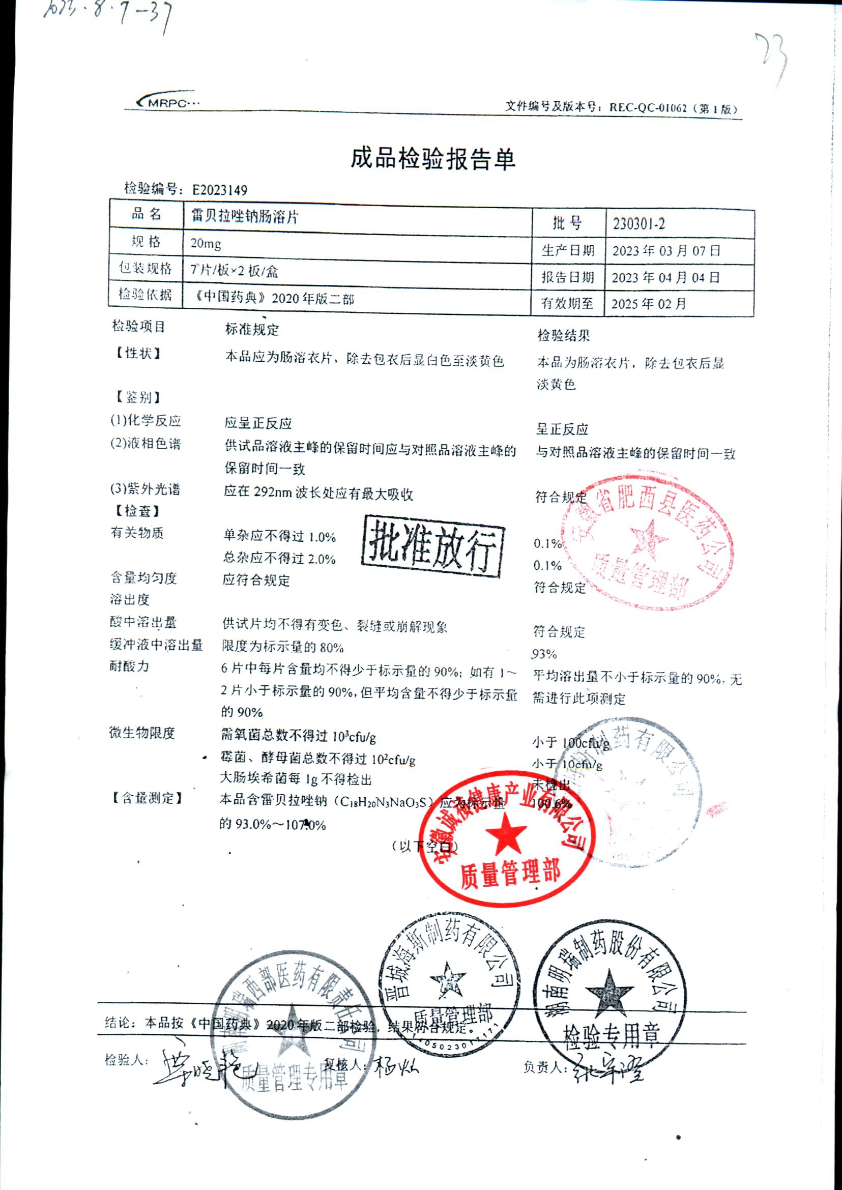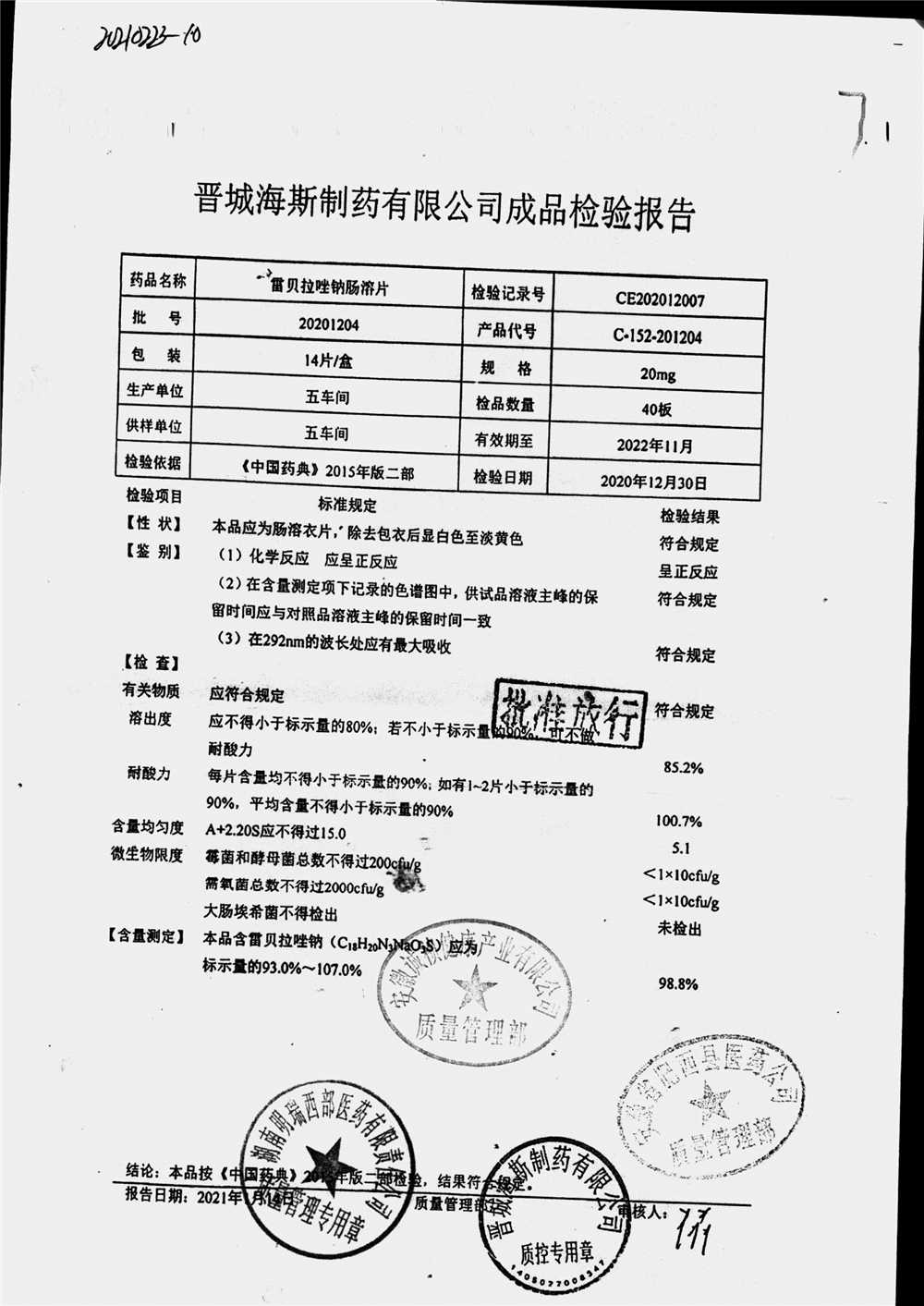 | 雷貝拉唑鈉腸溶片 | 20mg*14片 | 20210414 | 查看詳情 |