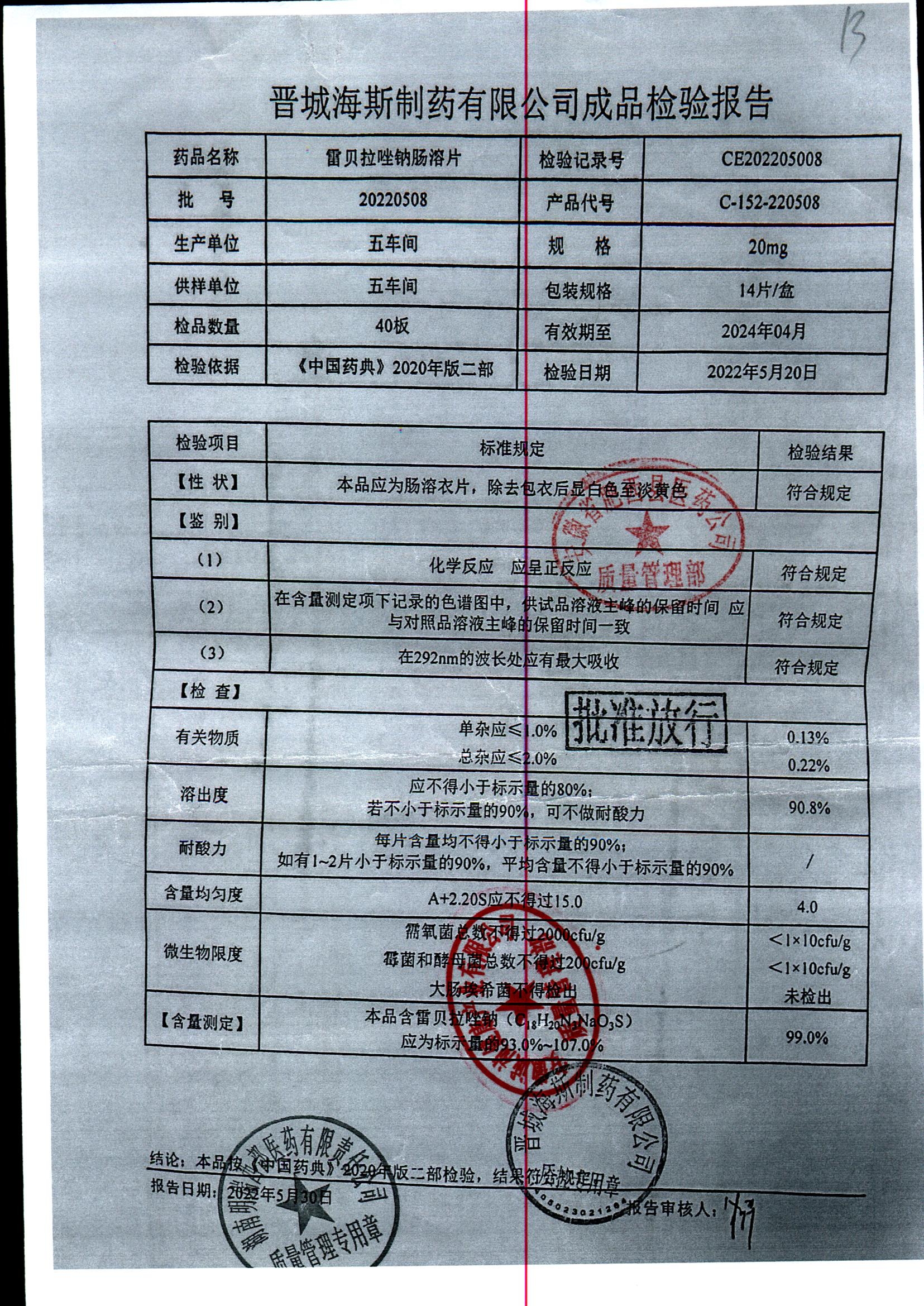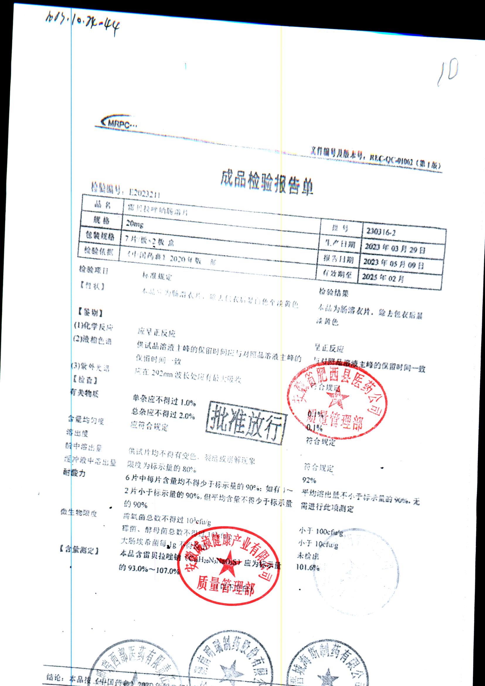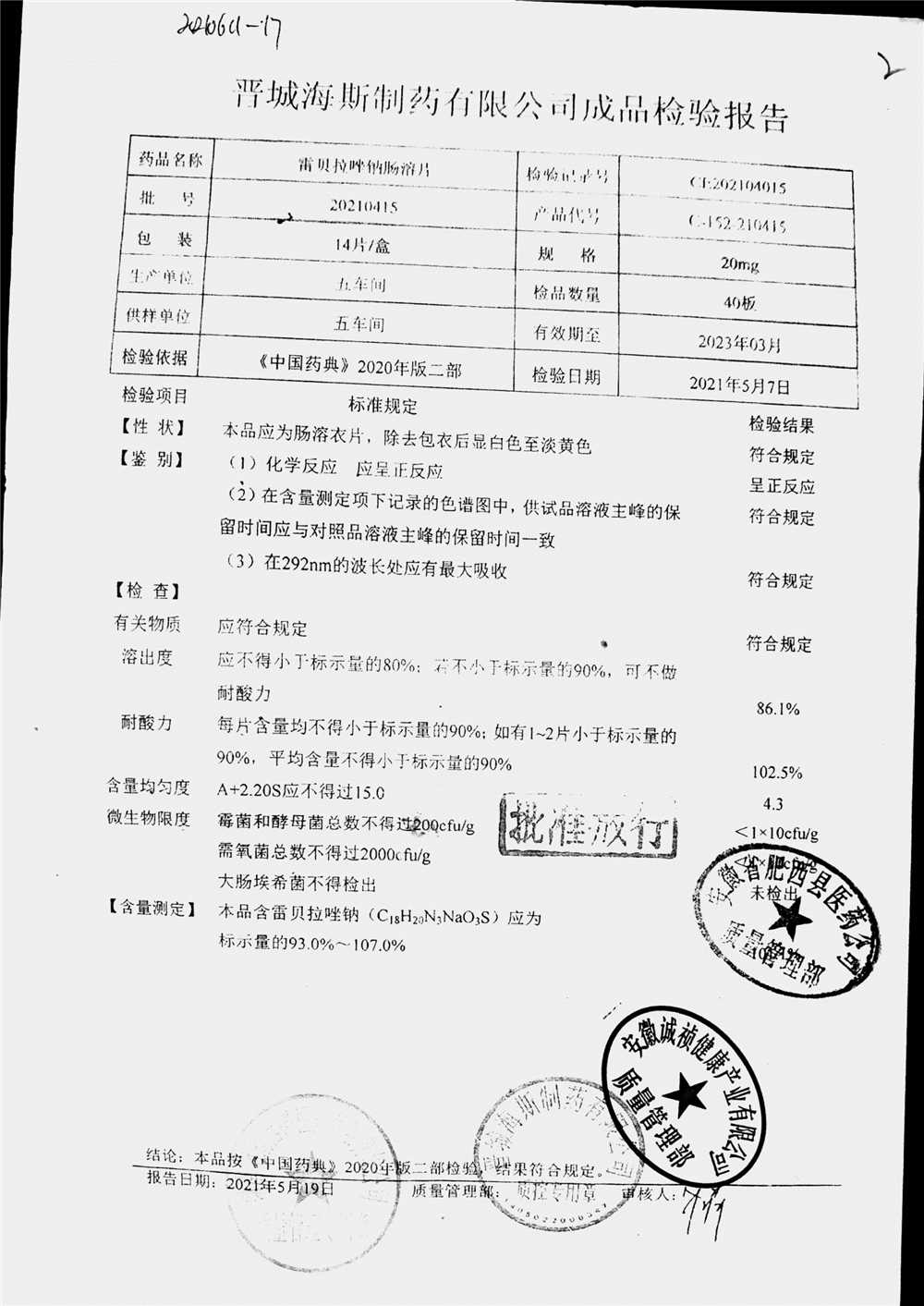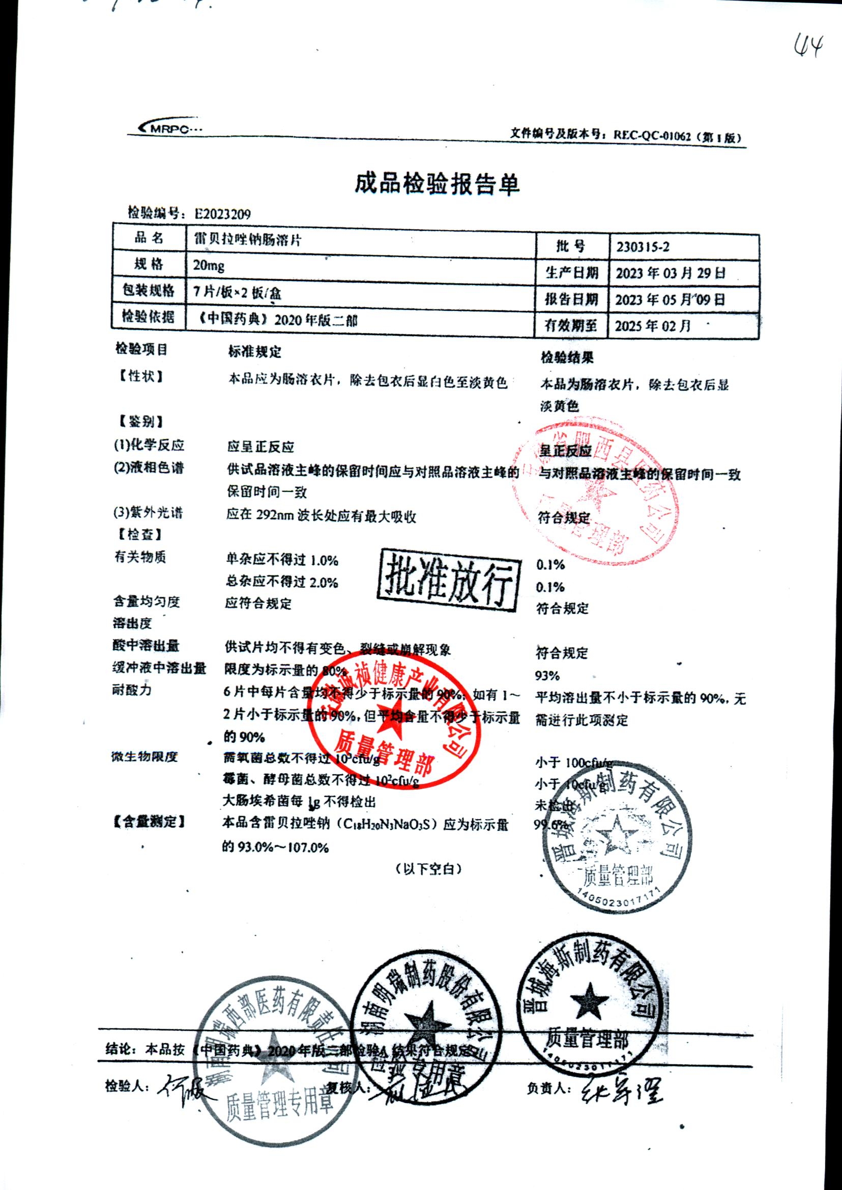 | 雷貝拉唑鈉腸溶片 | 20mg*14片 | 20210515 | 查看詳情 |