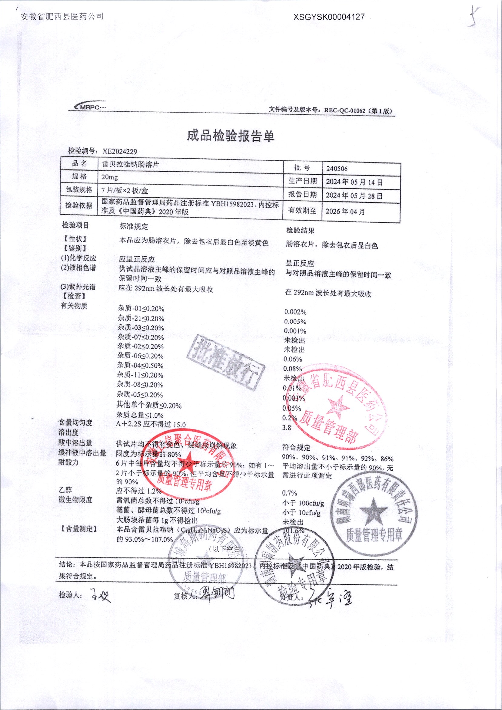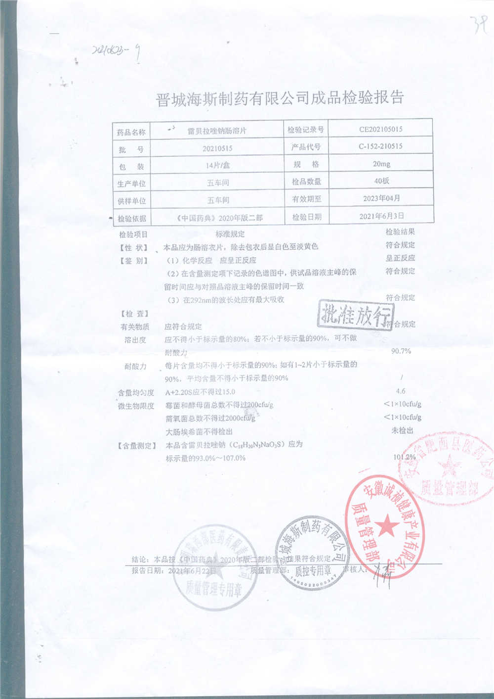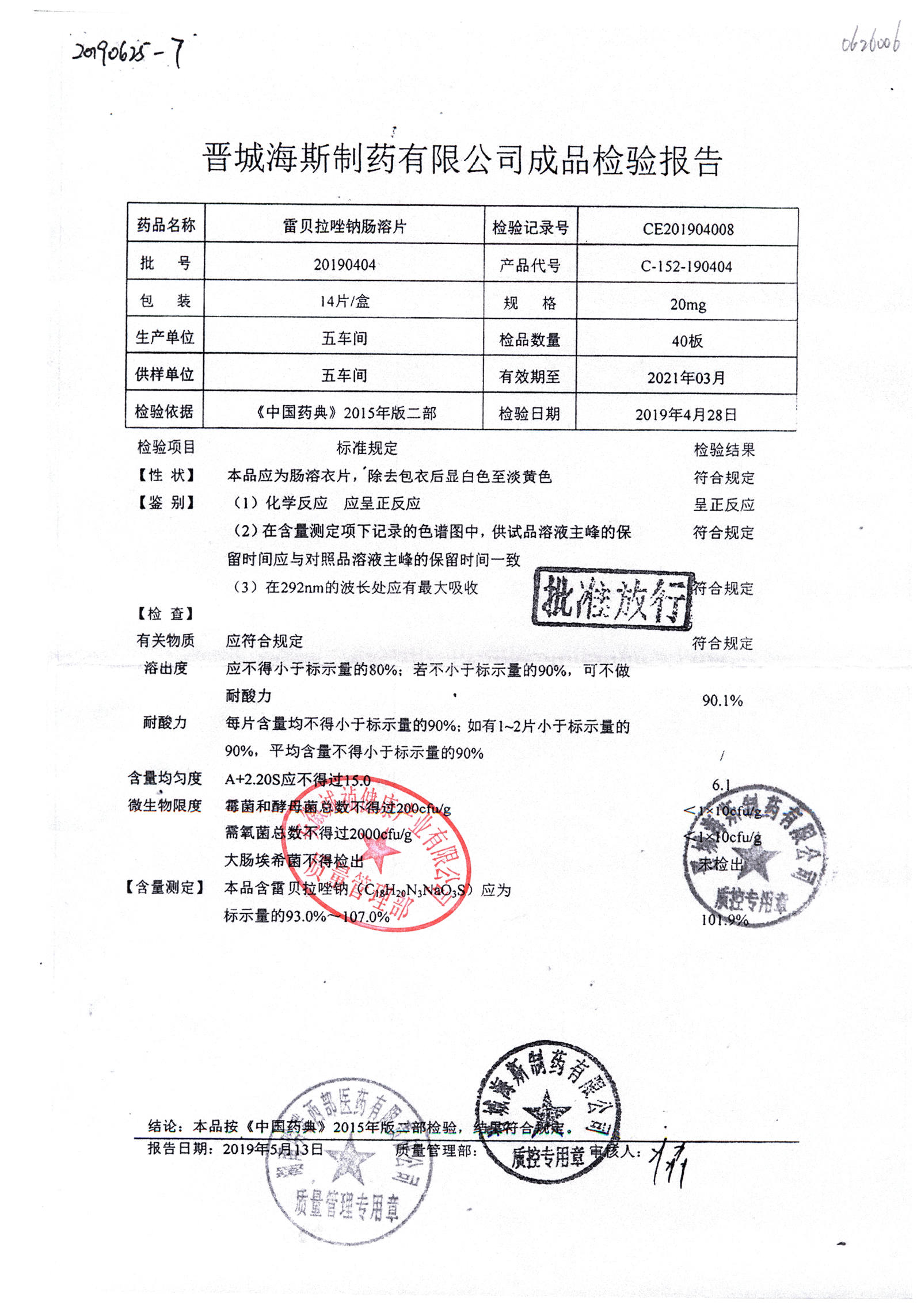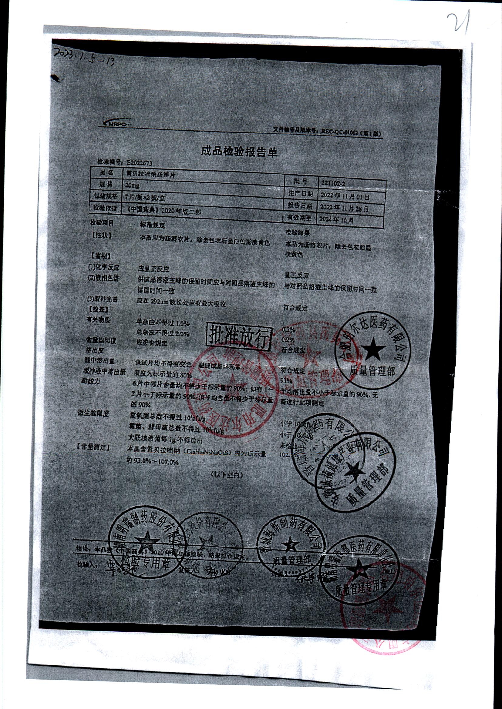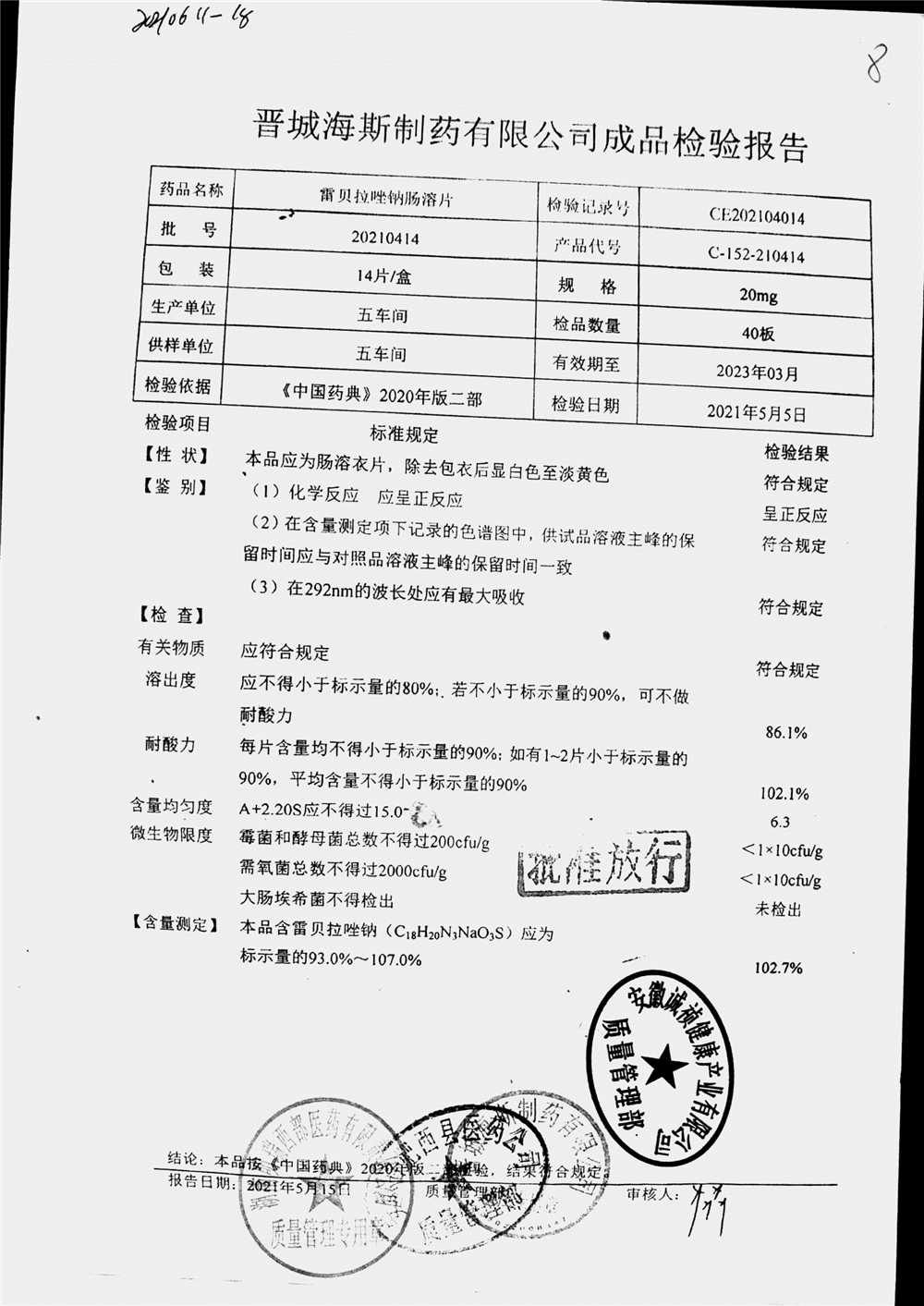 | 雷貝拉唑鈉腸溶片 | 20mg*14片 | 20210515 | 查看詳情 |