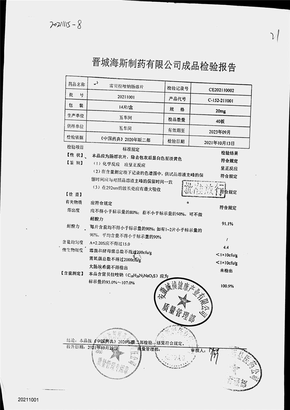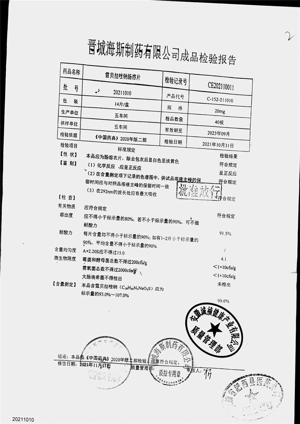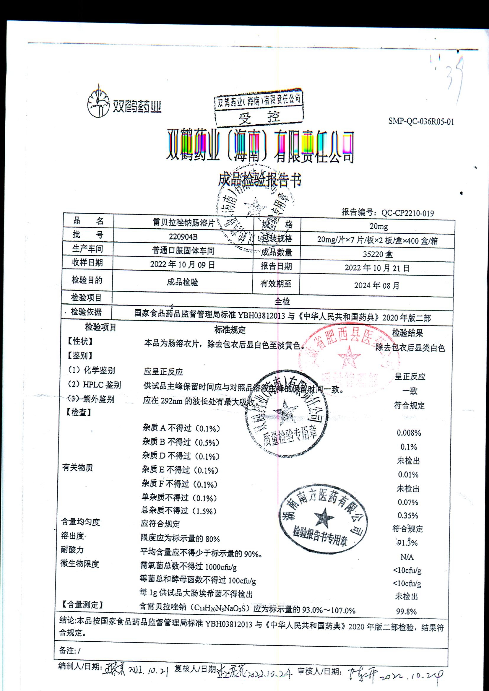 | 雷貝拉唑鈉腸溶片 | 20mg*14片 | 20211011 | 查看詳情 |
