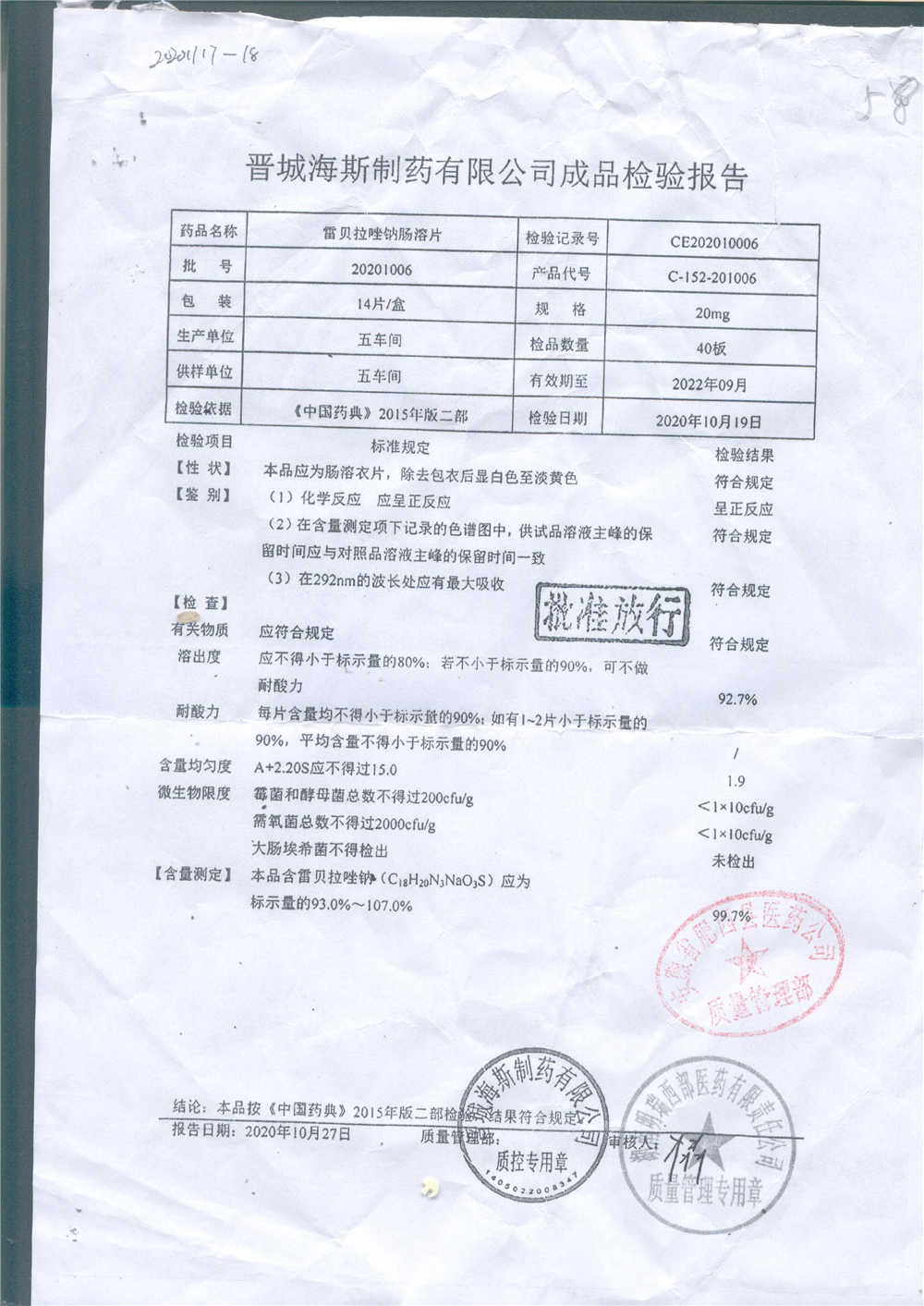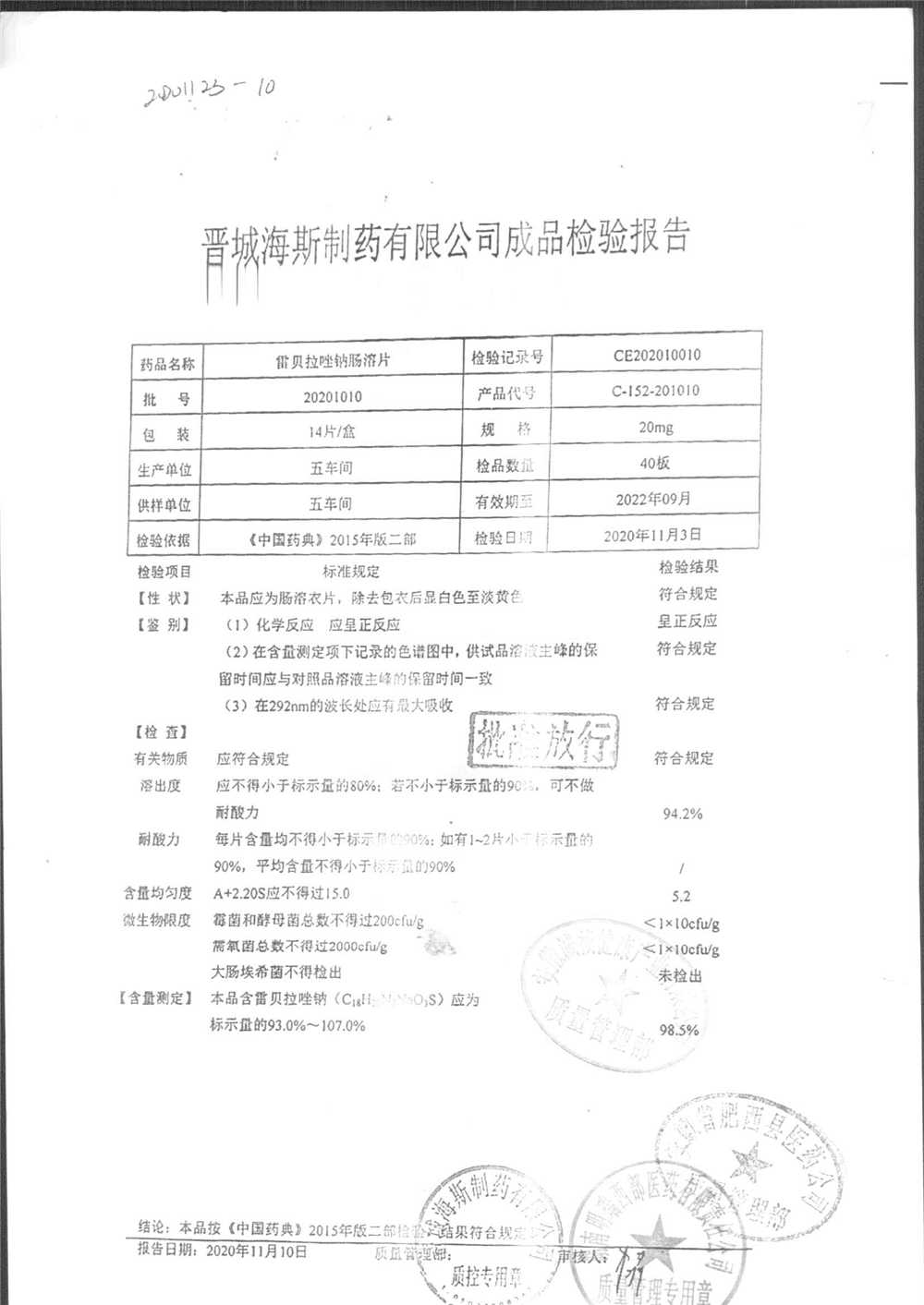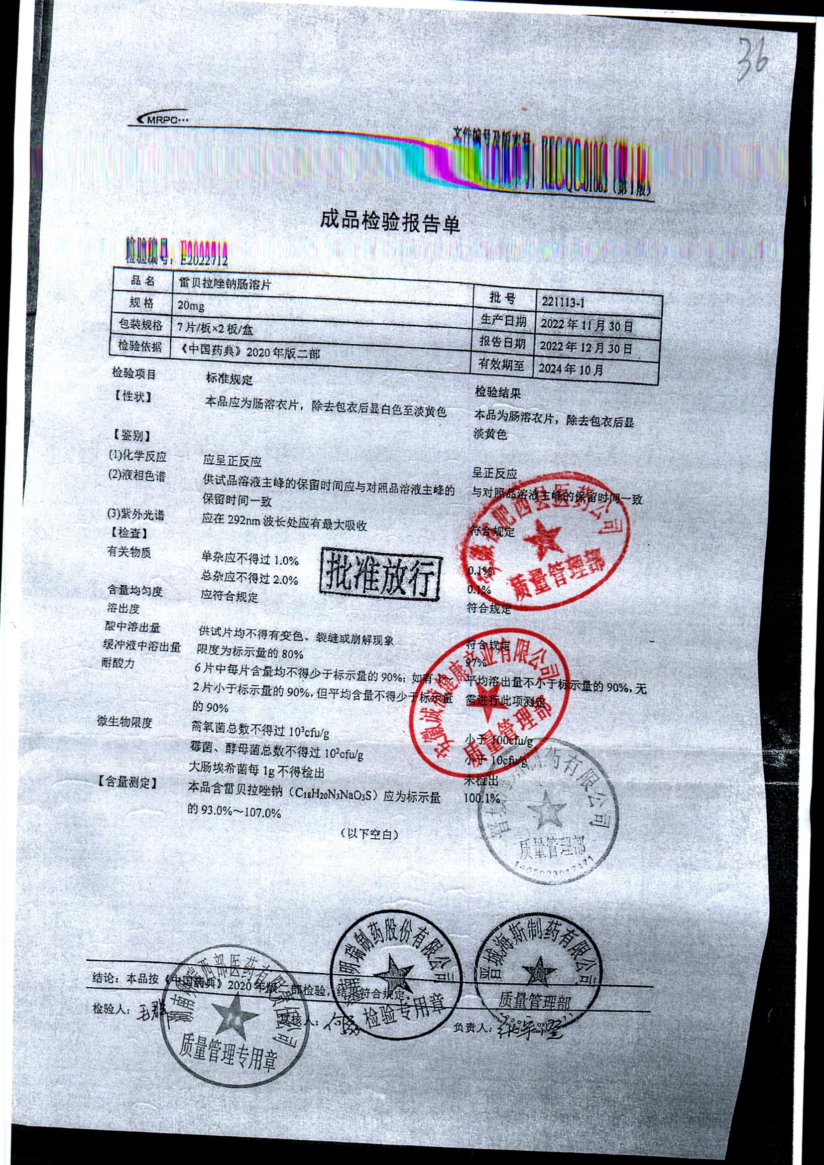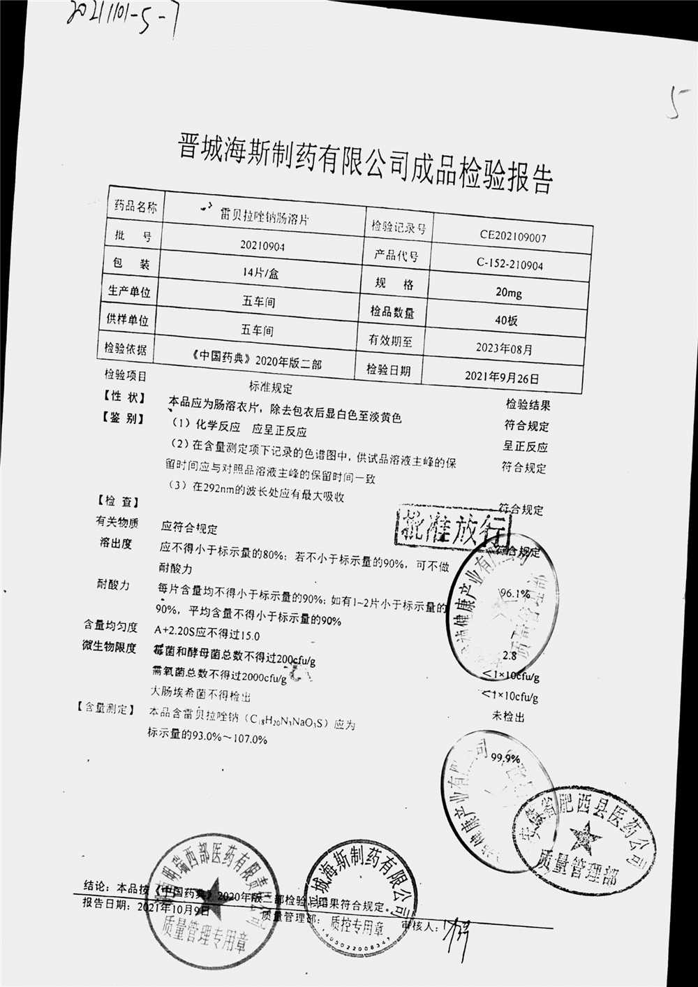 | 雷貝拉唑鈉腸溶片 | 20mg*14片 | 20211011 | 查看詳情 |