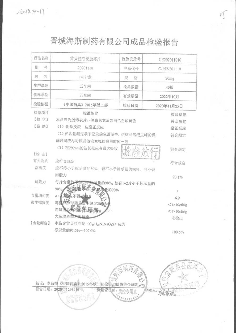| 雷貝拉唑鈉腸溶片 | 20mg*14片 | 20201204 | 查看詳情 |