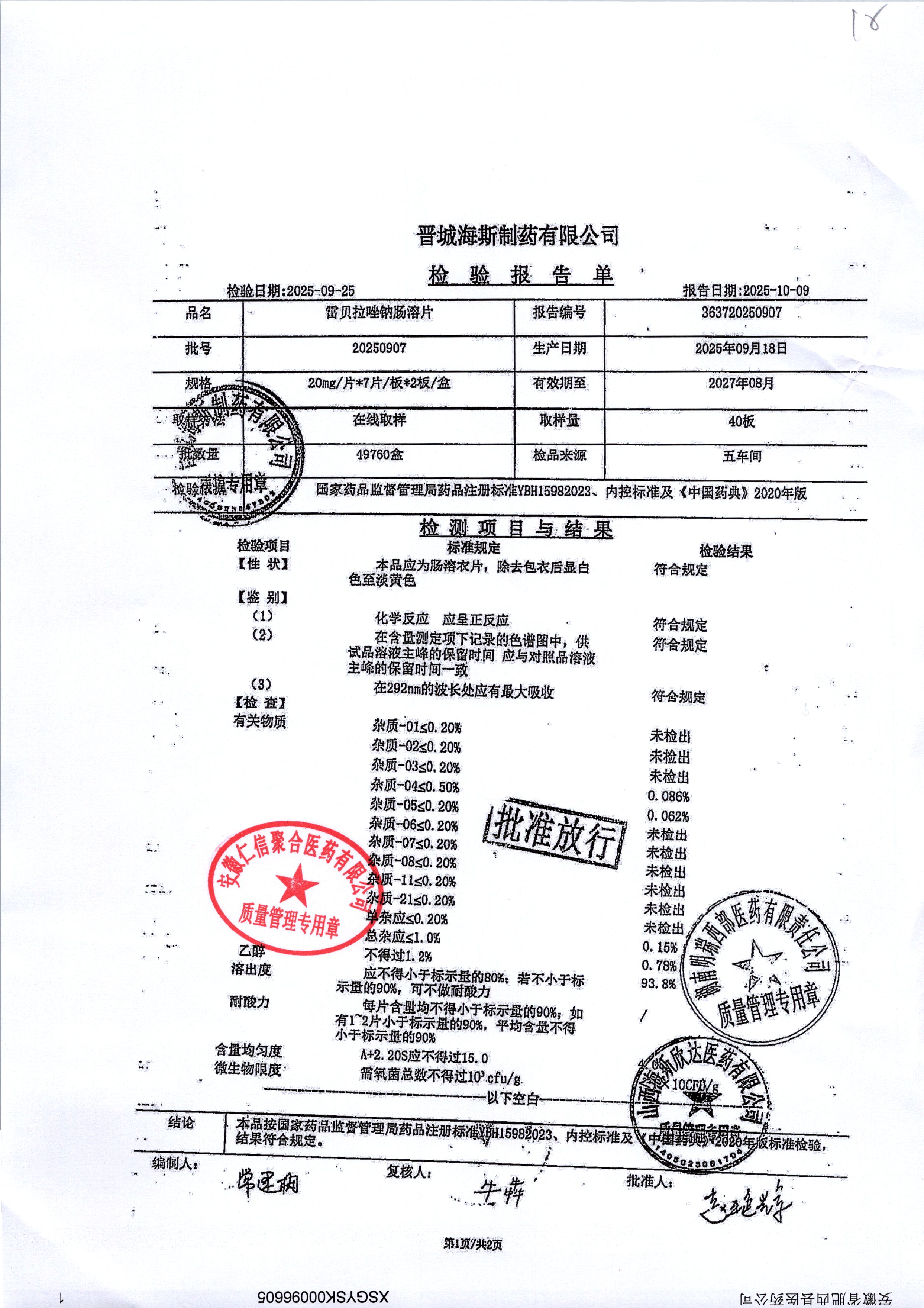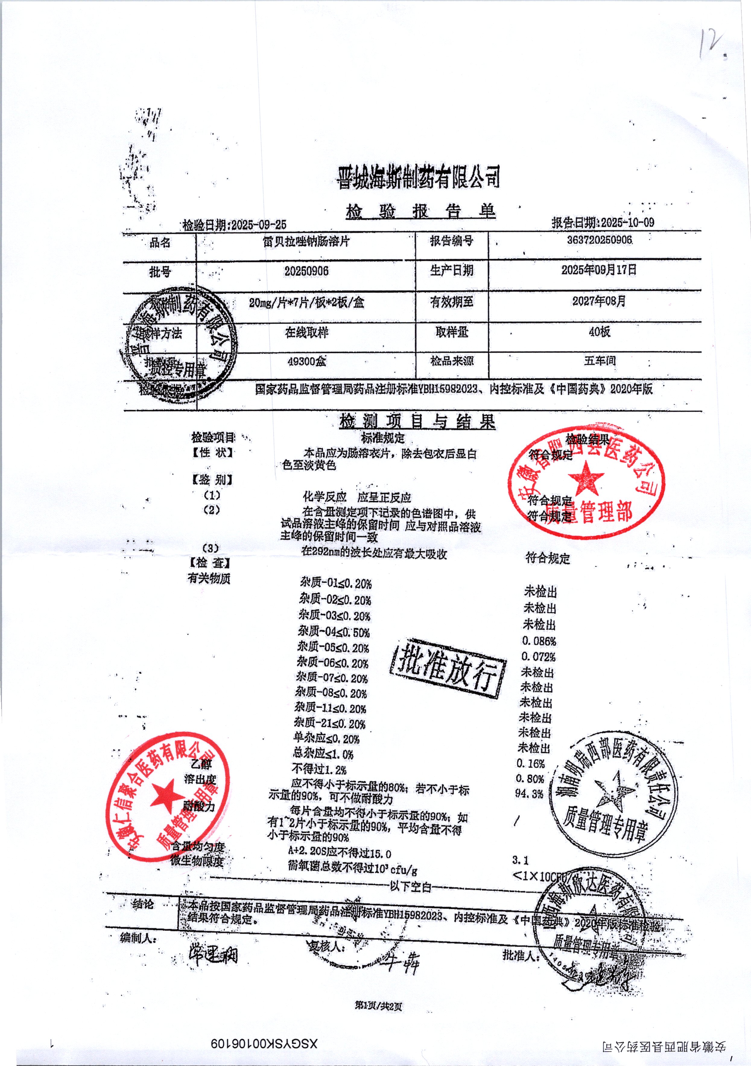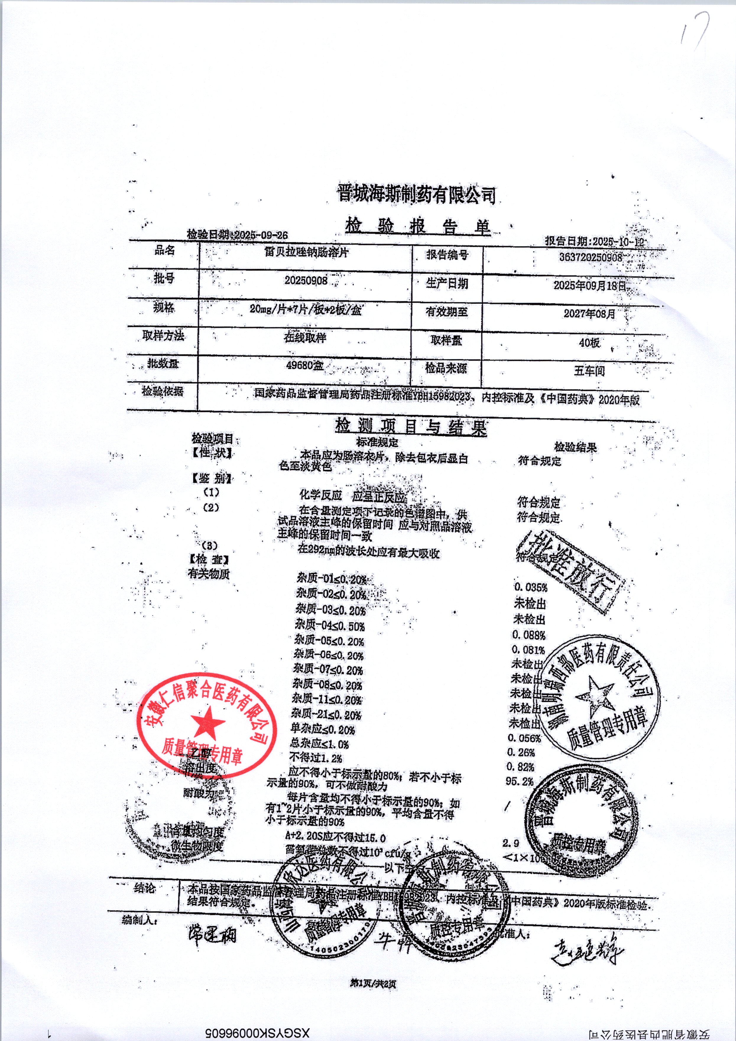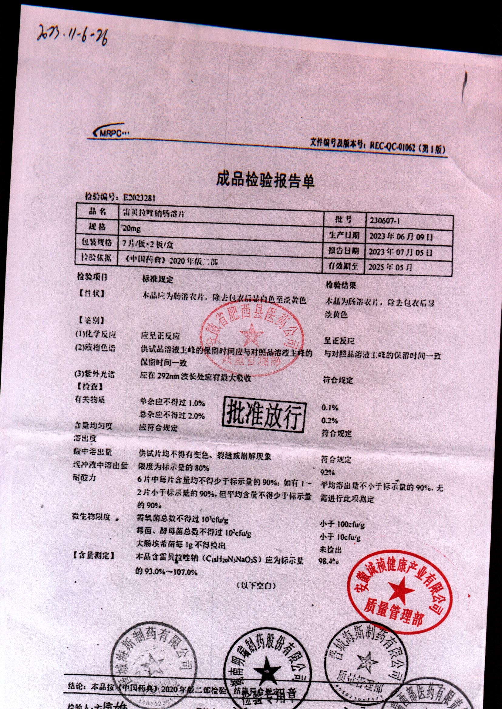 | 雷貝拉唑鈉腸溶片 | 20mg*14片 | 20250908/1 | 查看詳情 |
