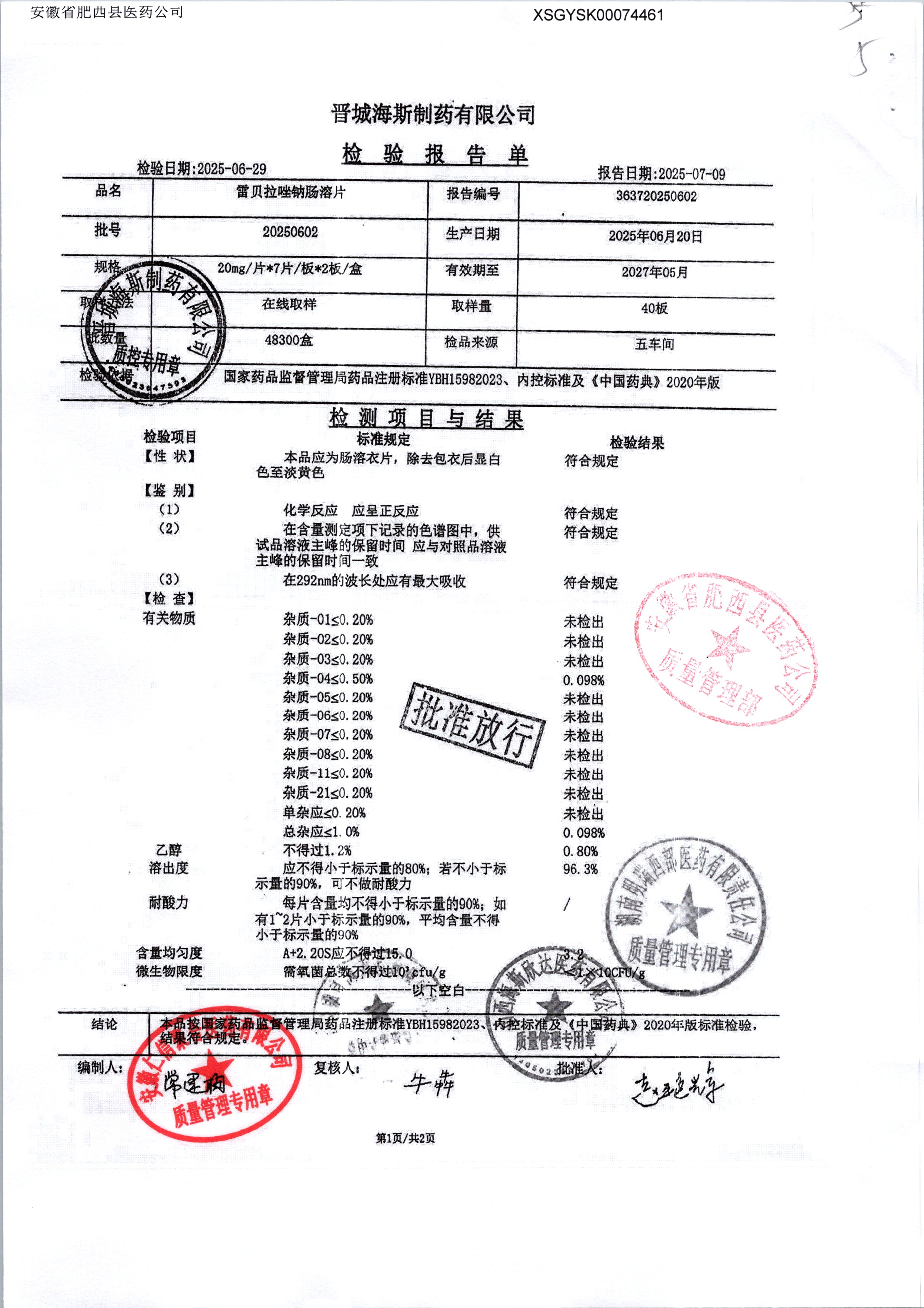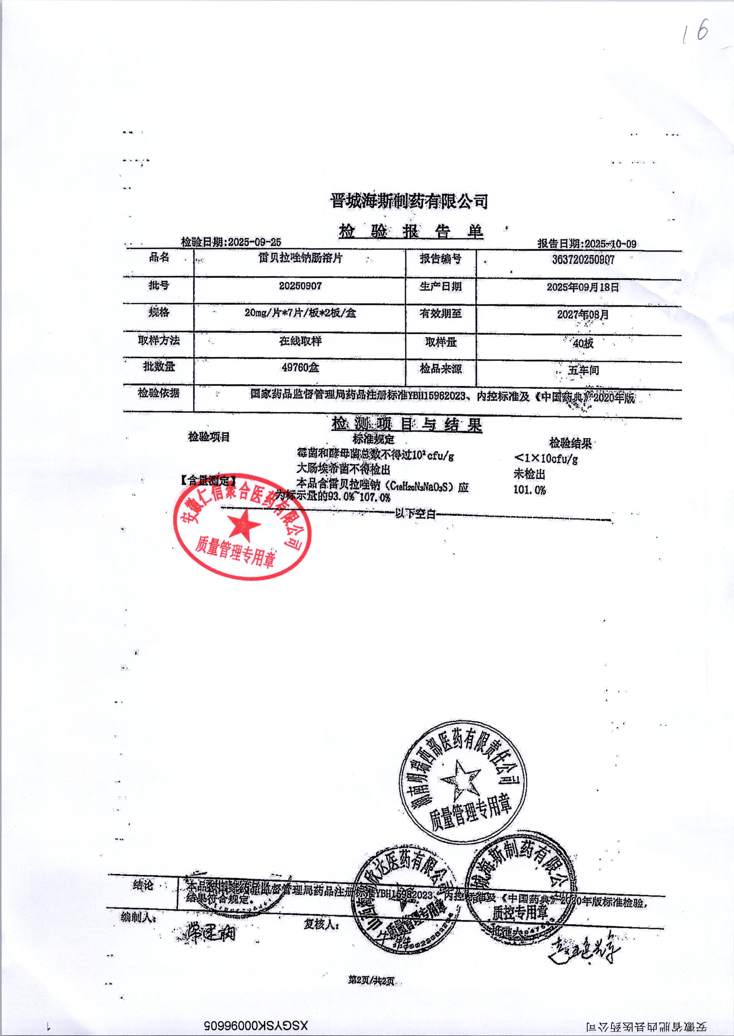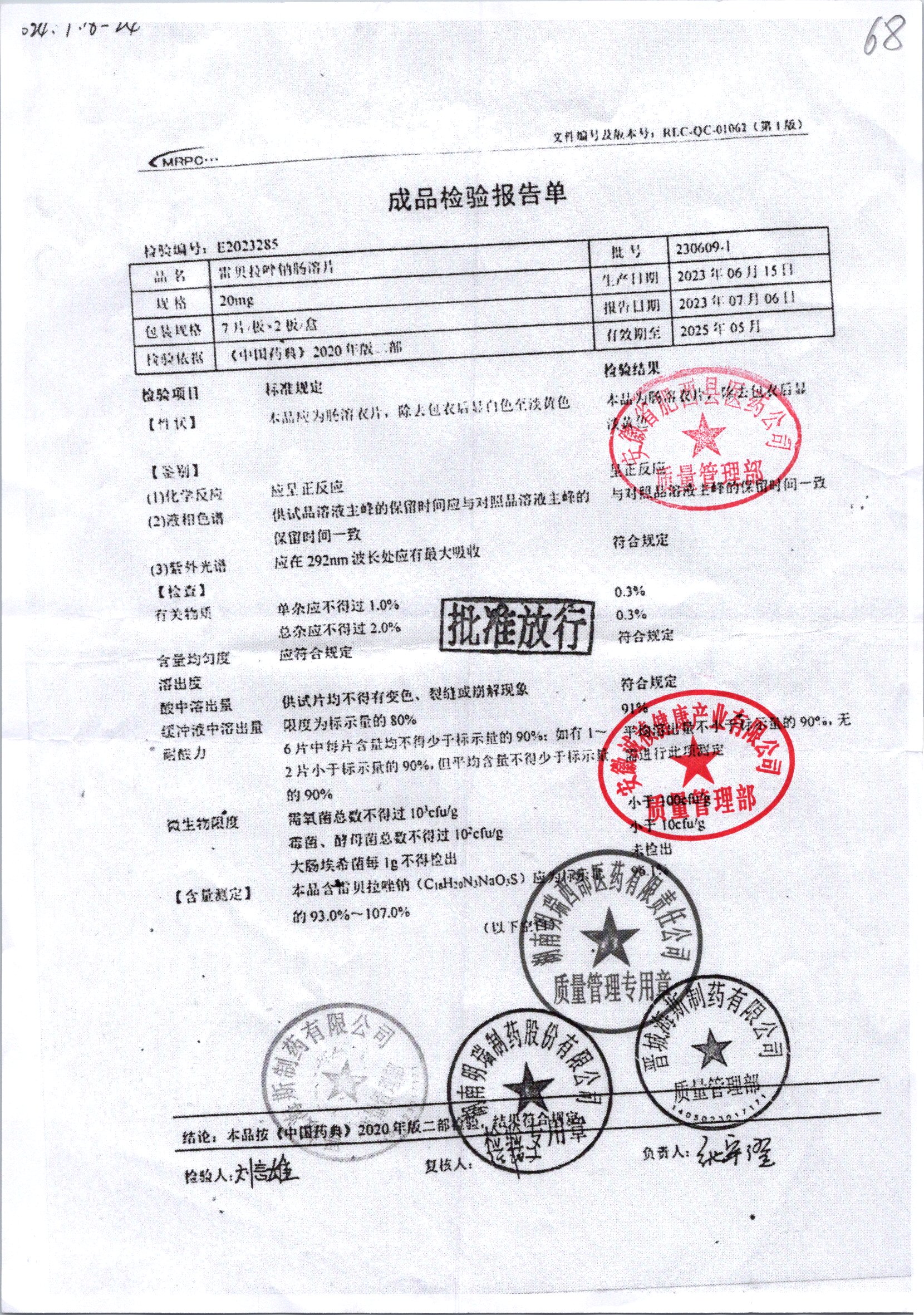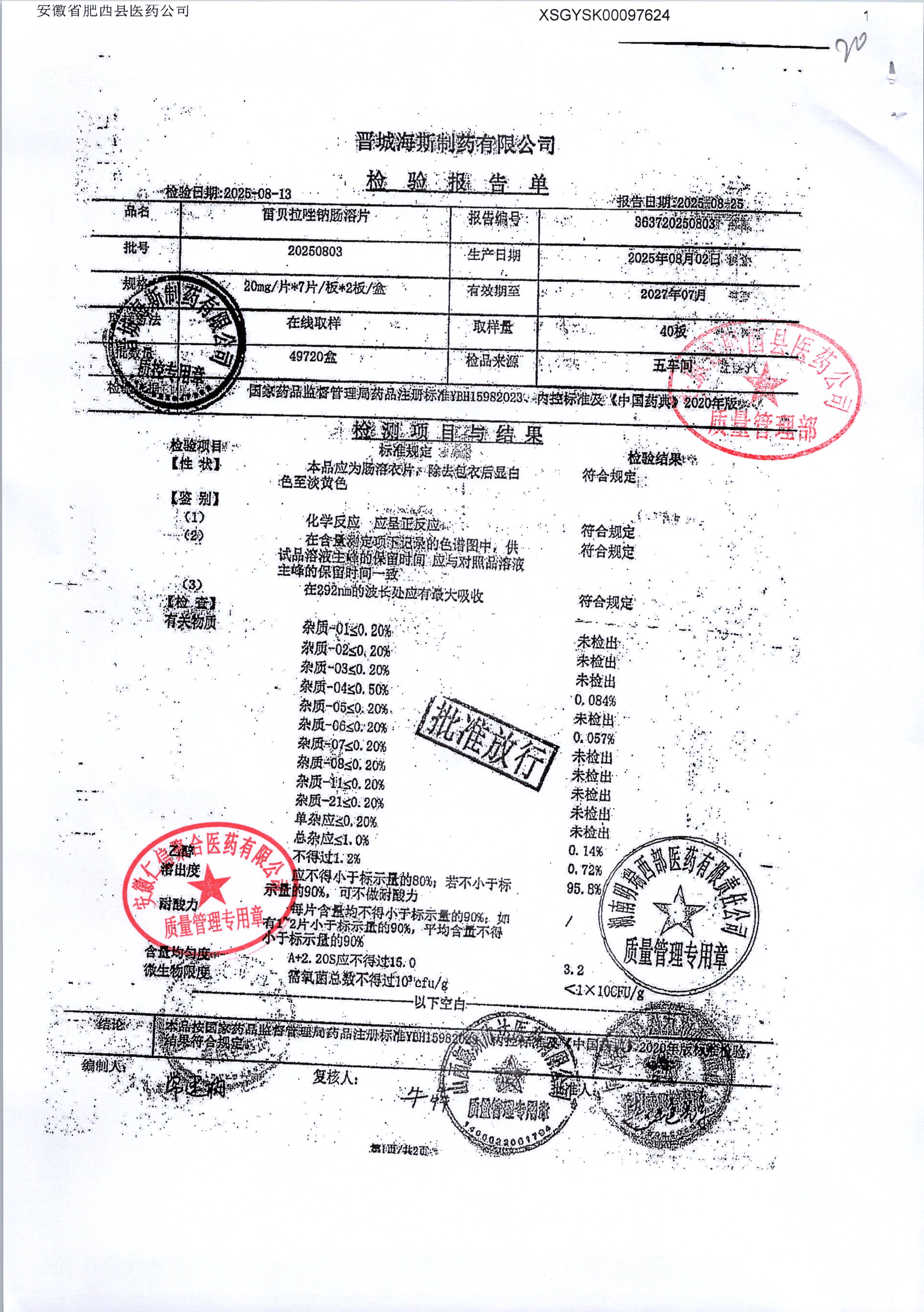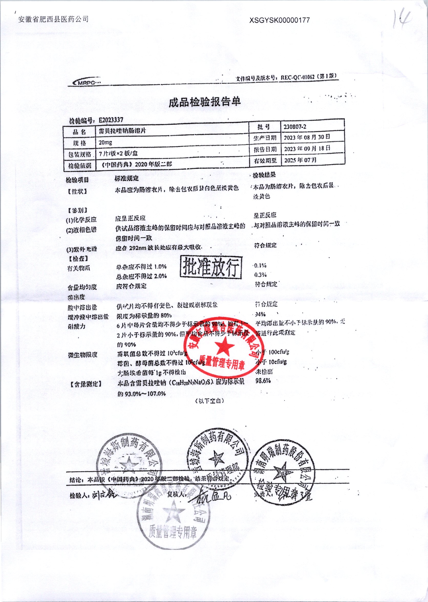 | 雷貝拉唑鈉腸溶片 | 20mg*14片 | 20250908/1 | 查看詳情 |