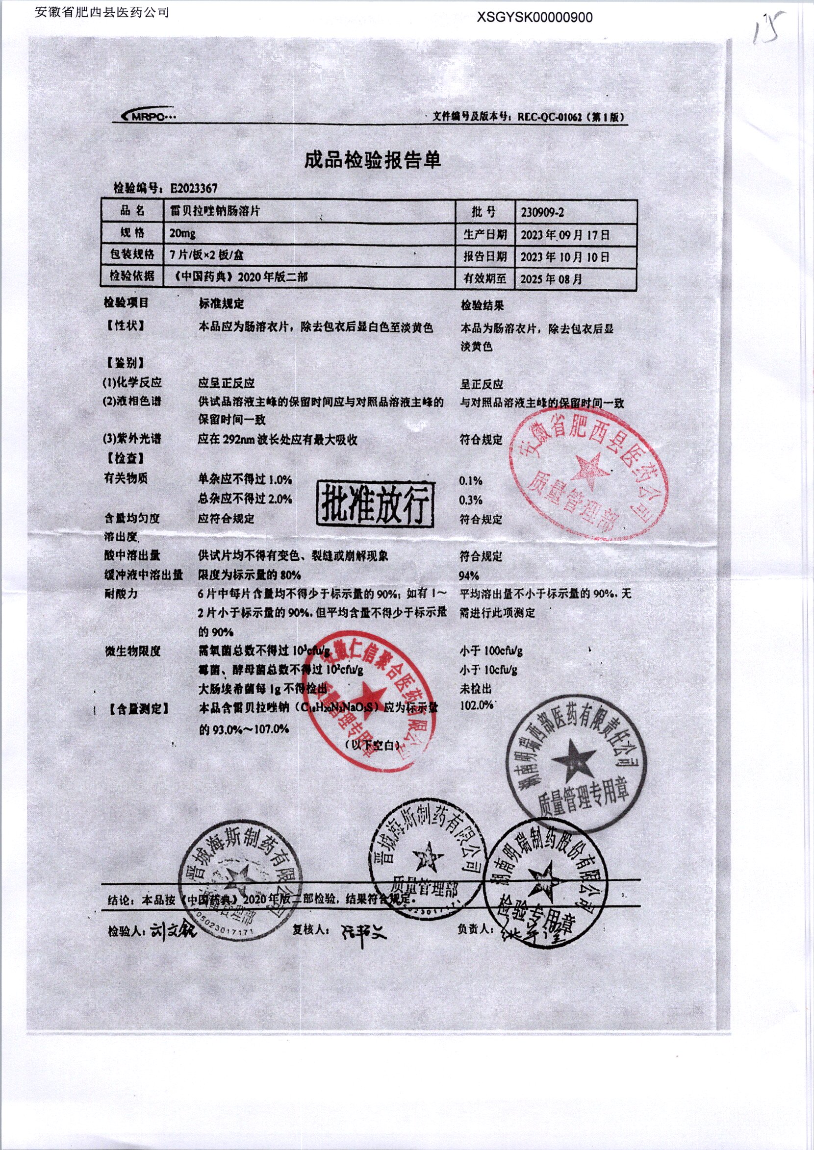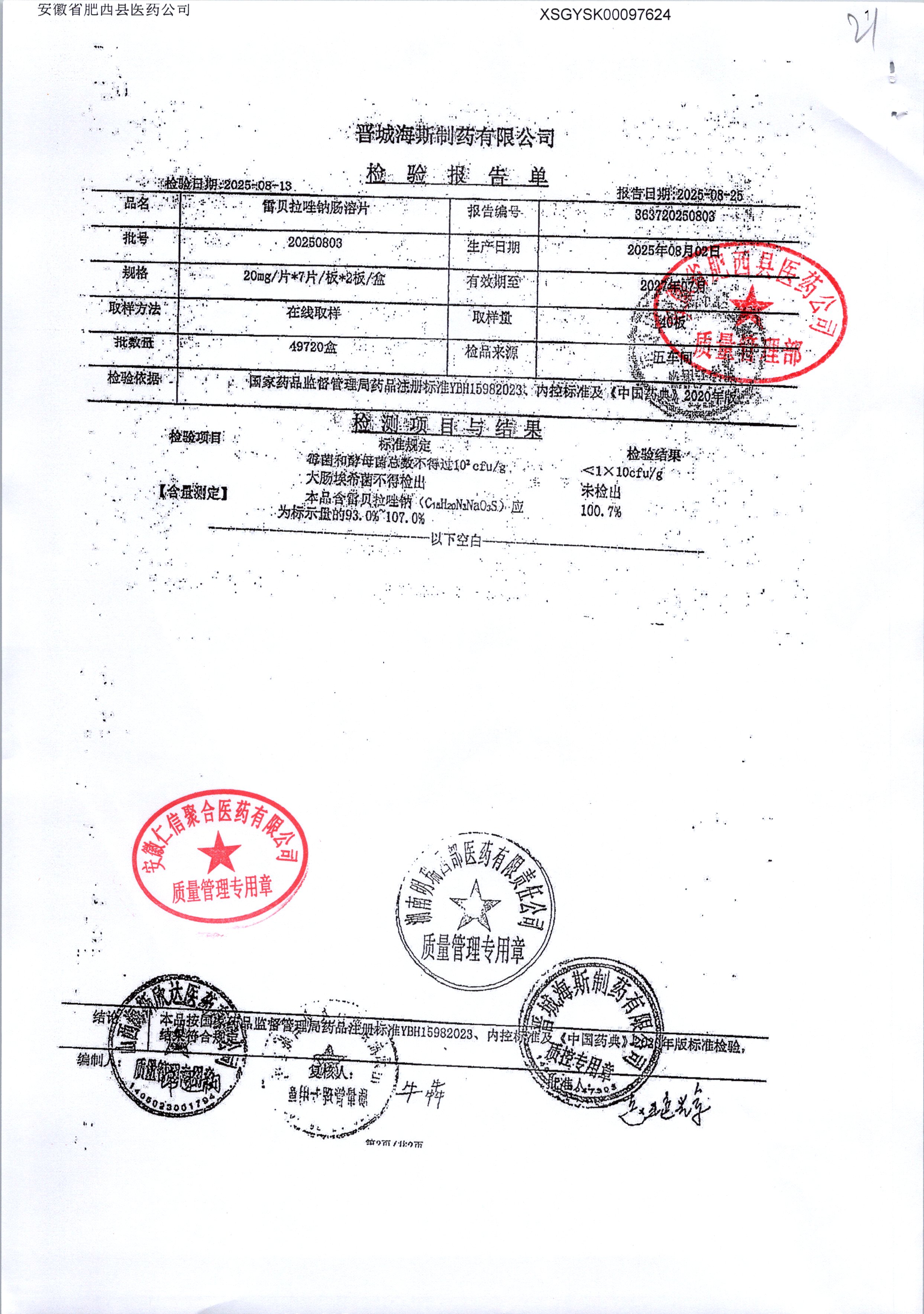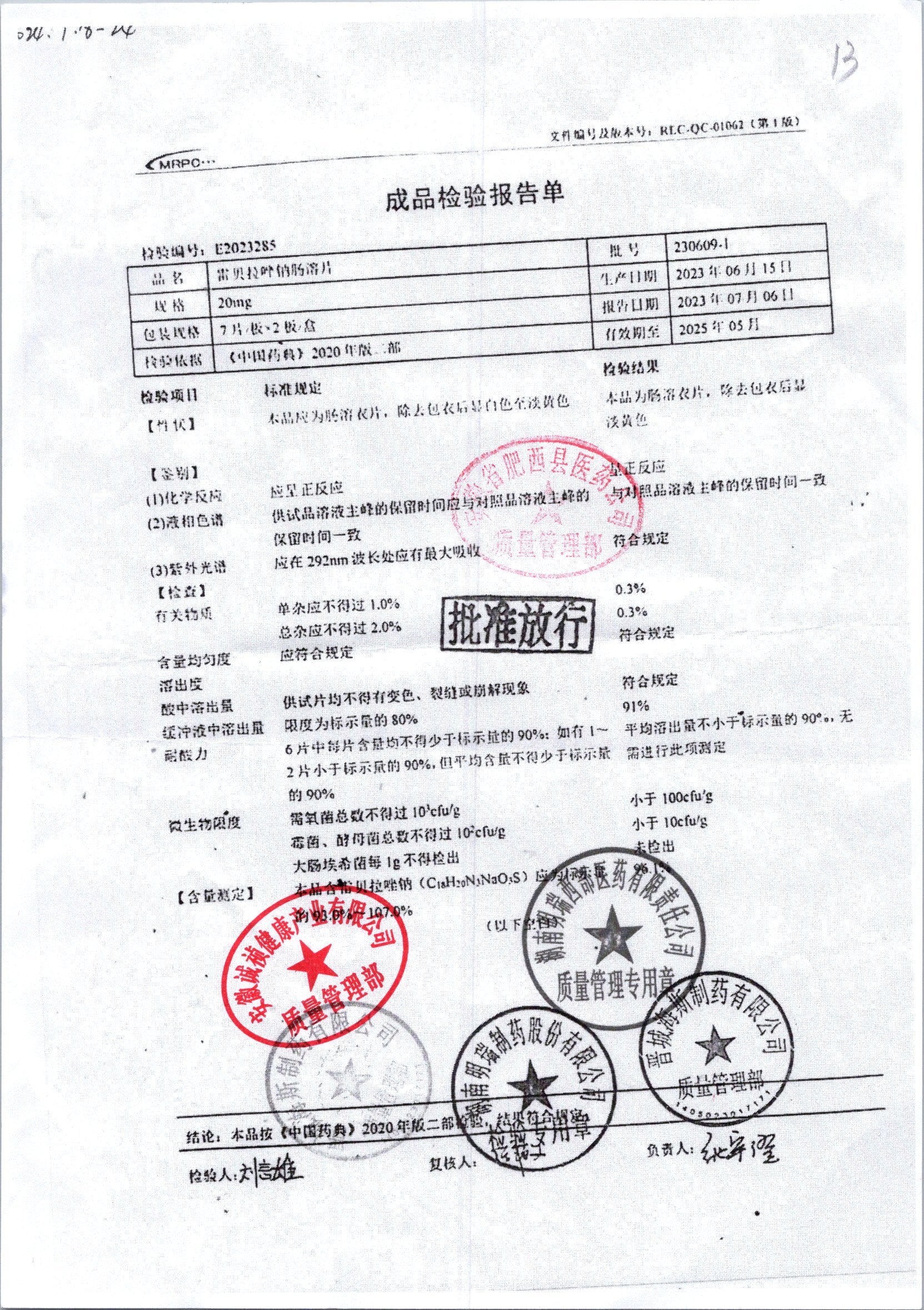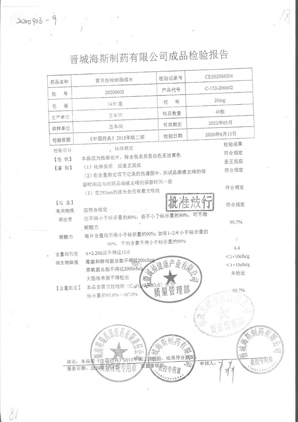 | 雷貝拉唑鈉腸溶片 | 20mg*14片 | 20250908/1 | 查看詳情 |