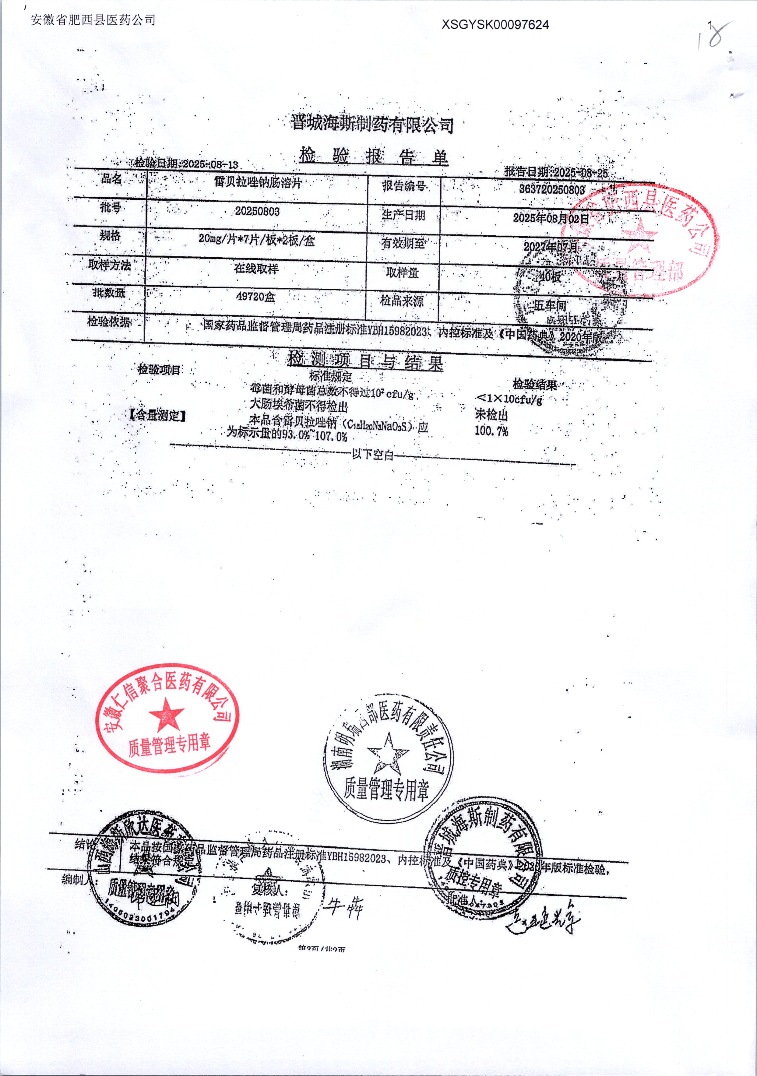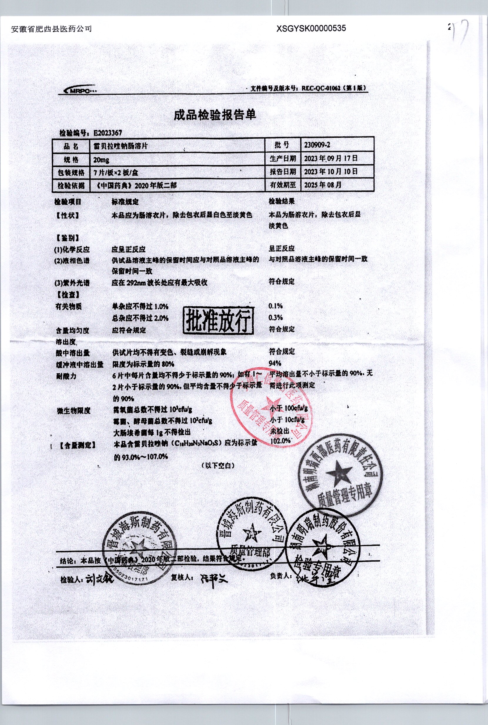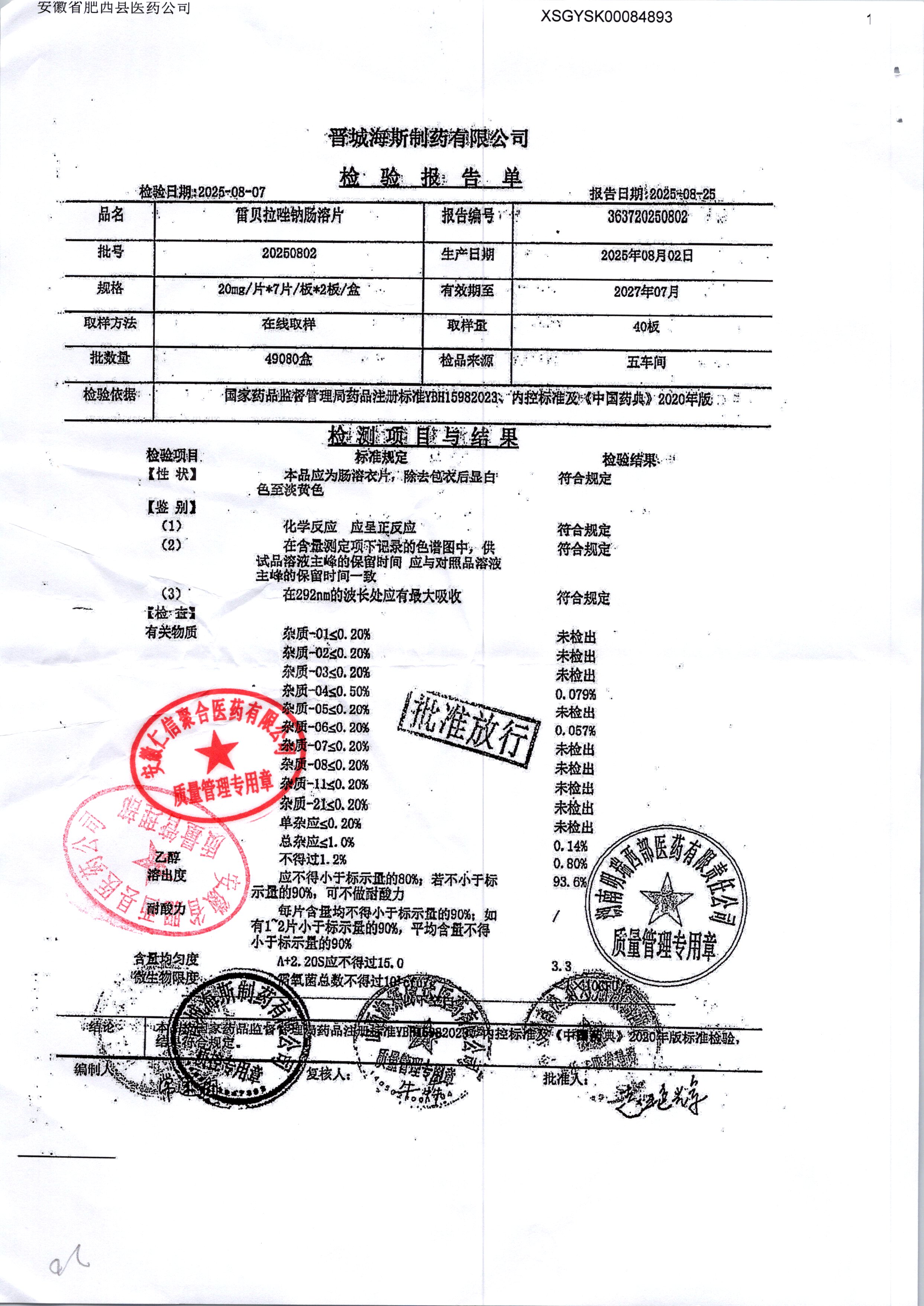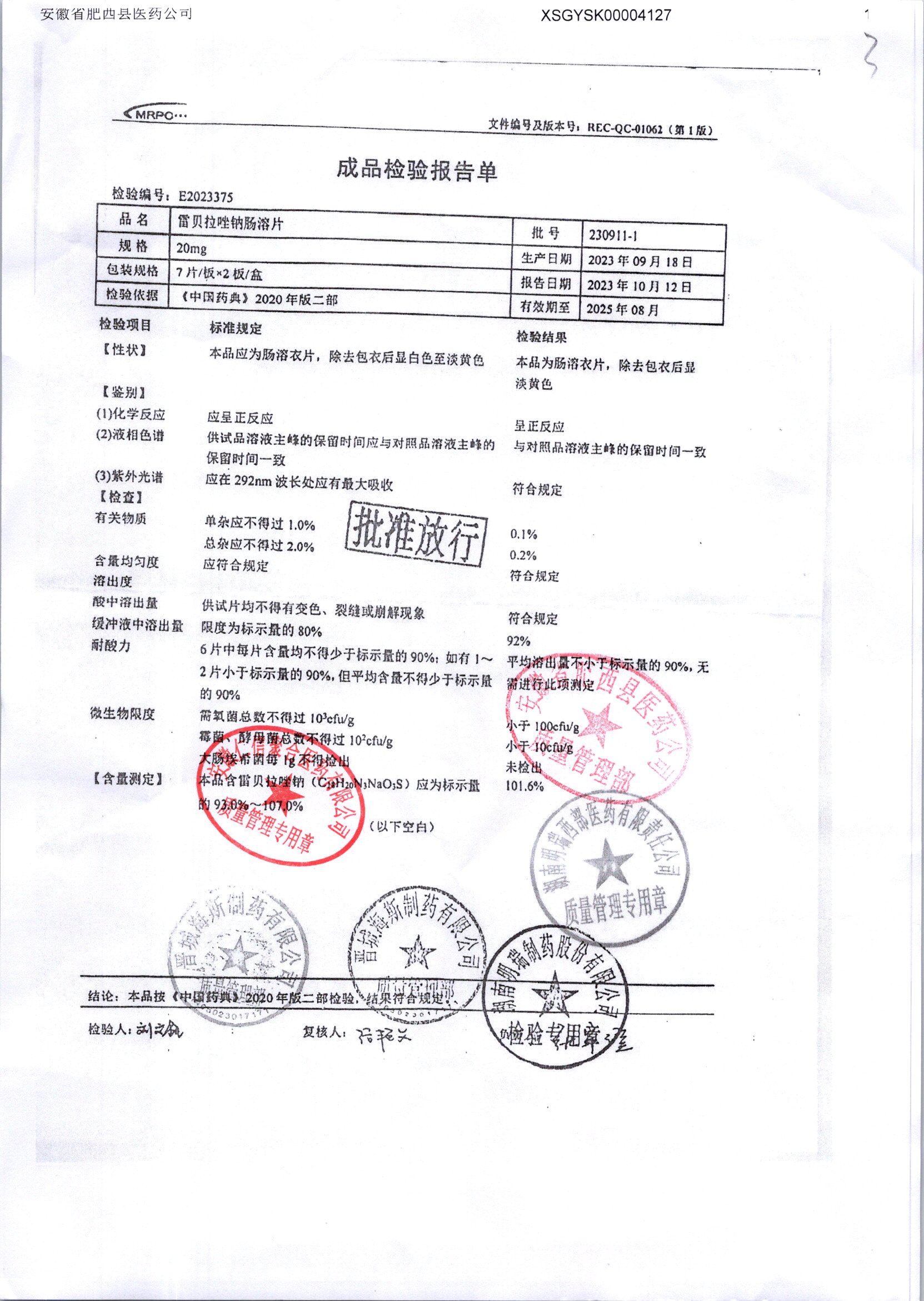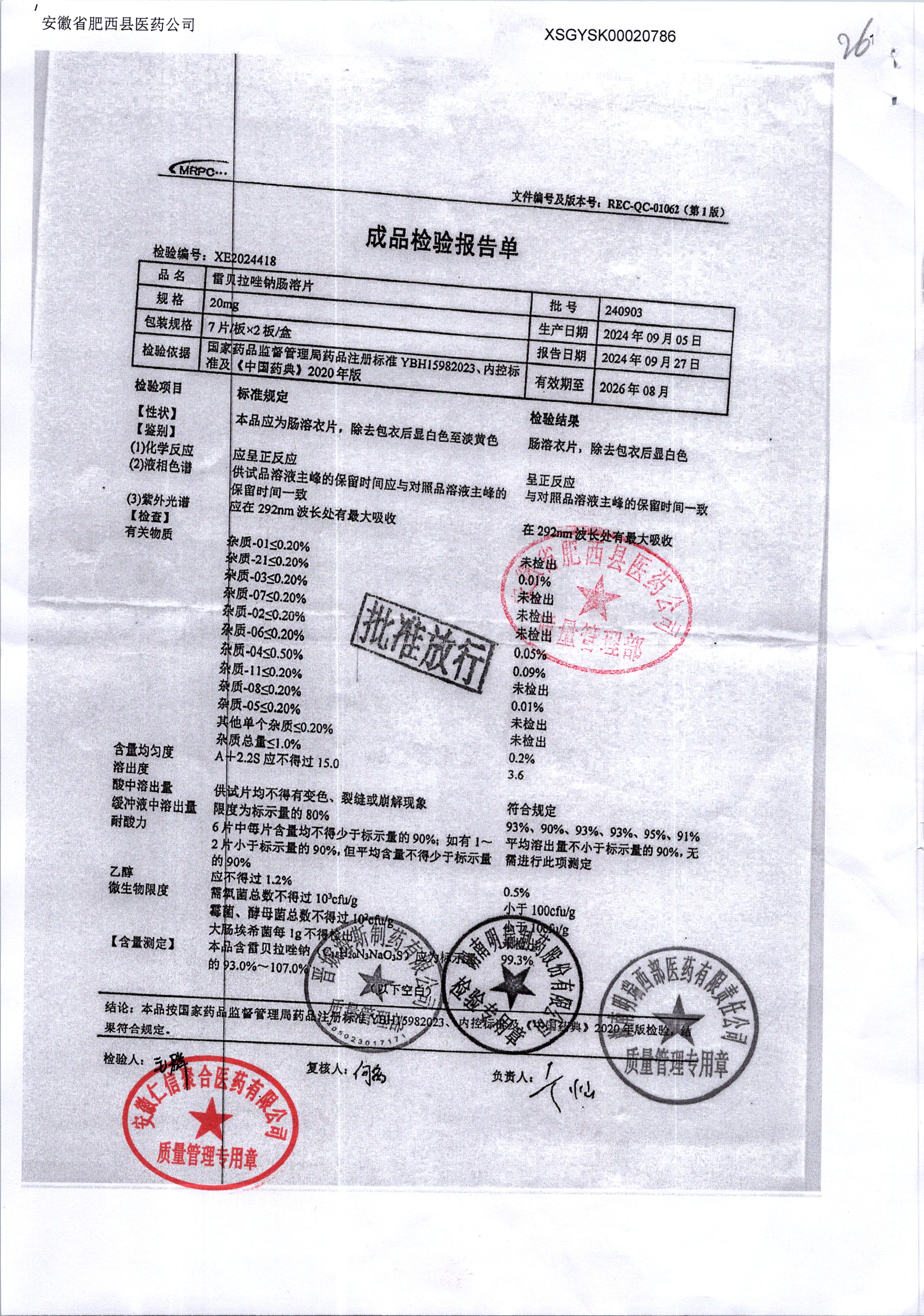 | 雷貝拉唑鈉腸溶片 | 20mg*14片 | 20250908/1 | 查看詳情 |
