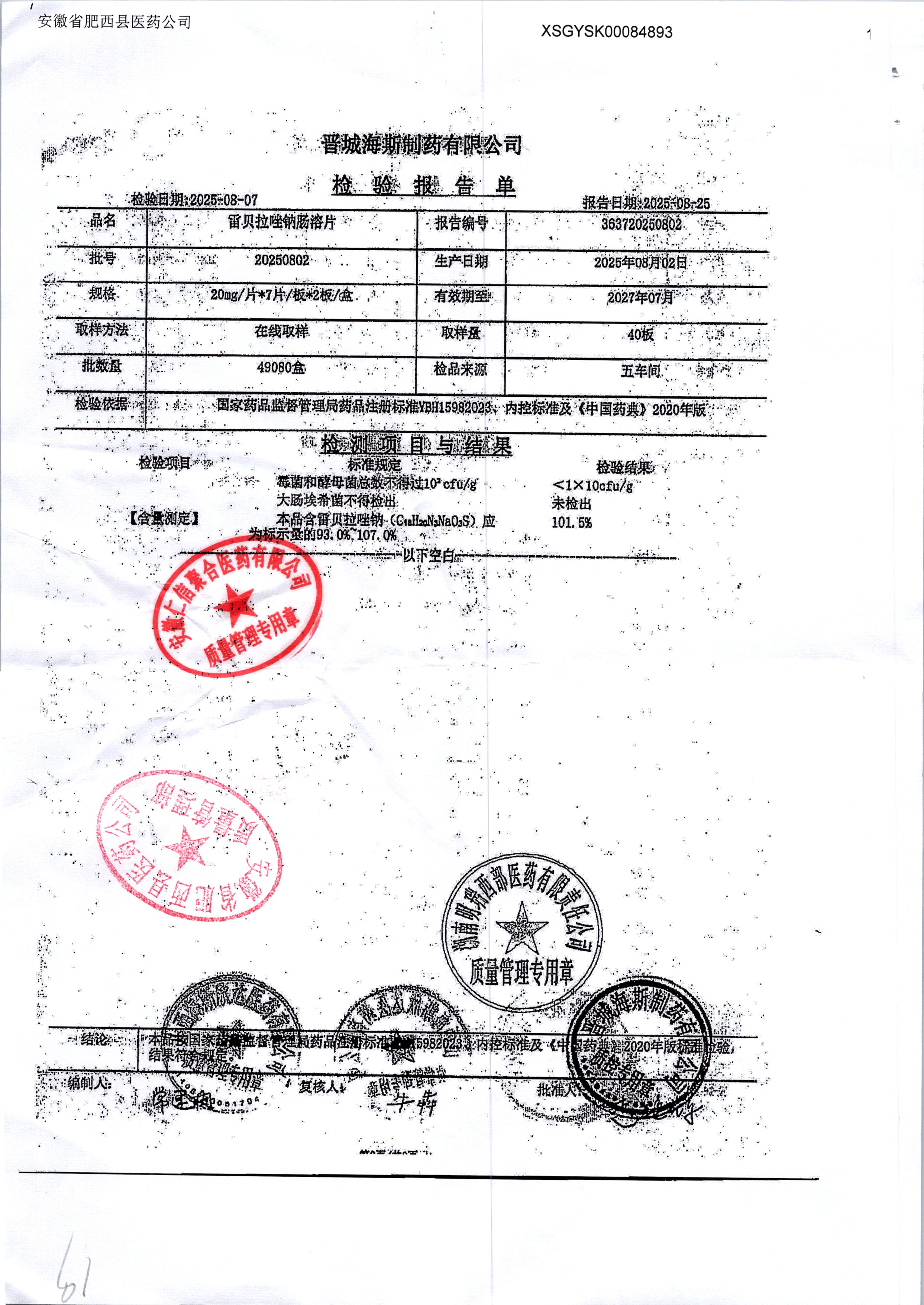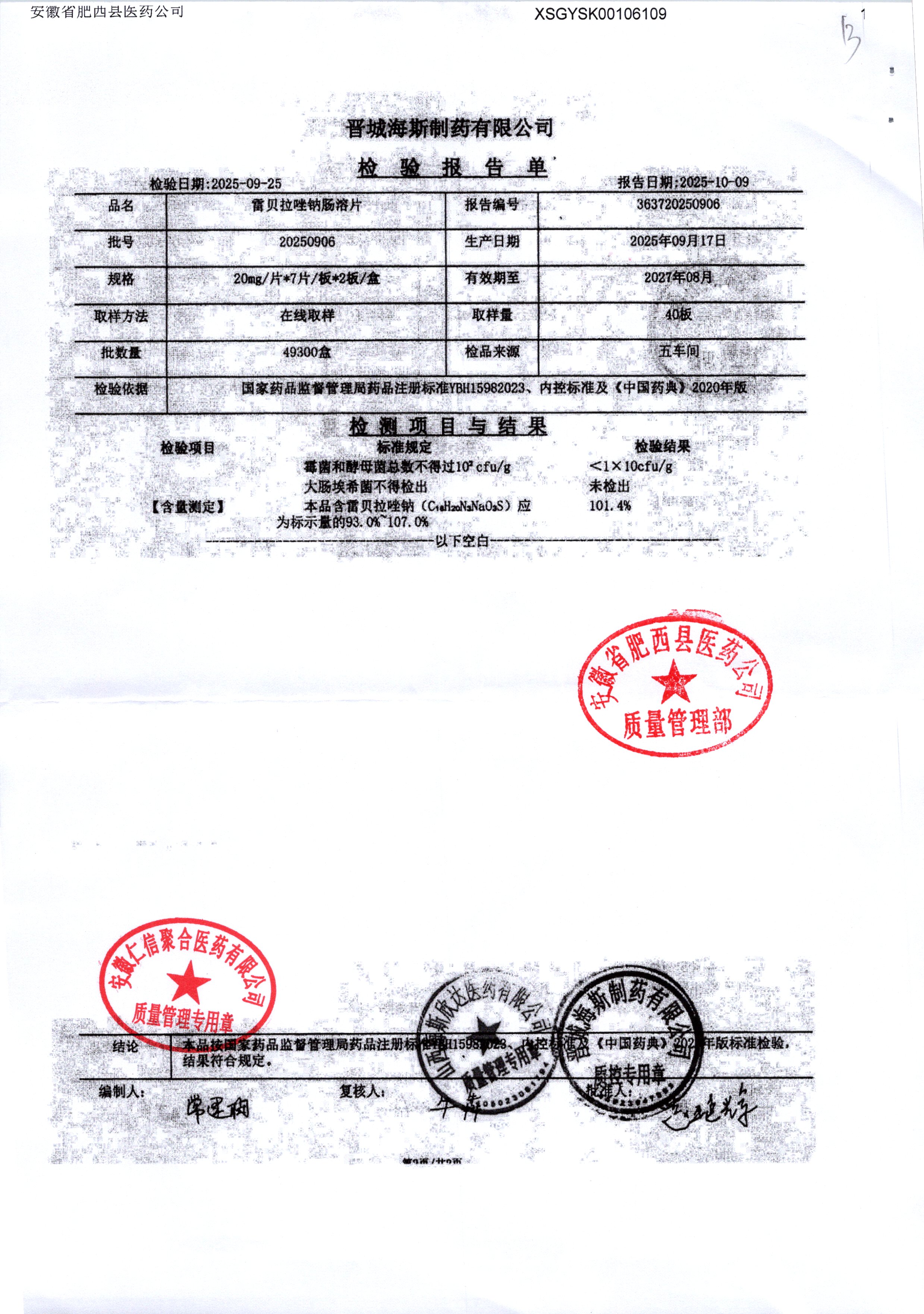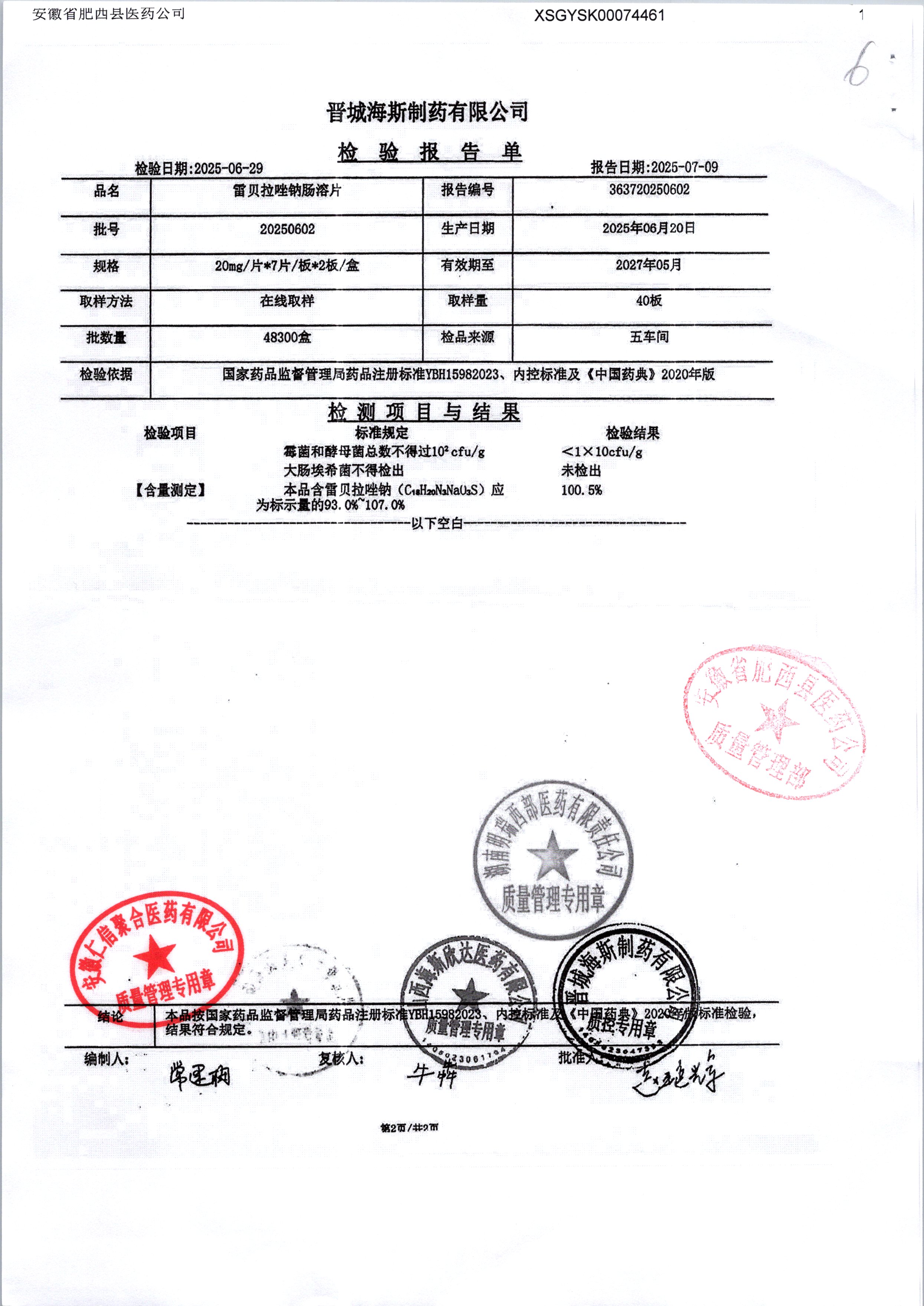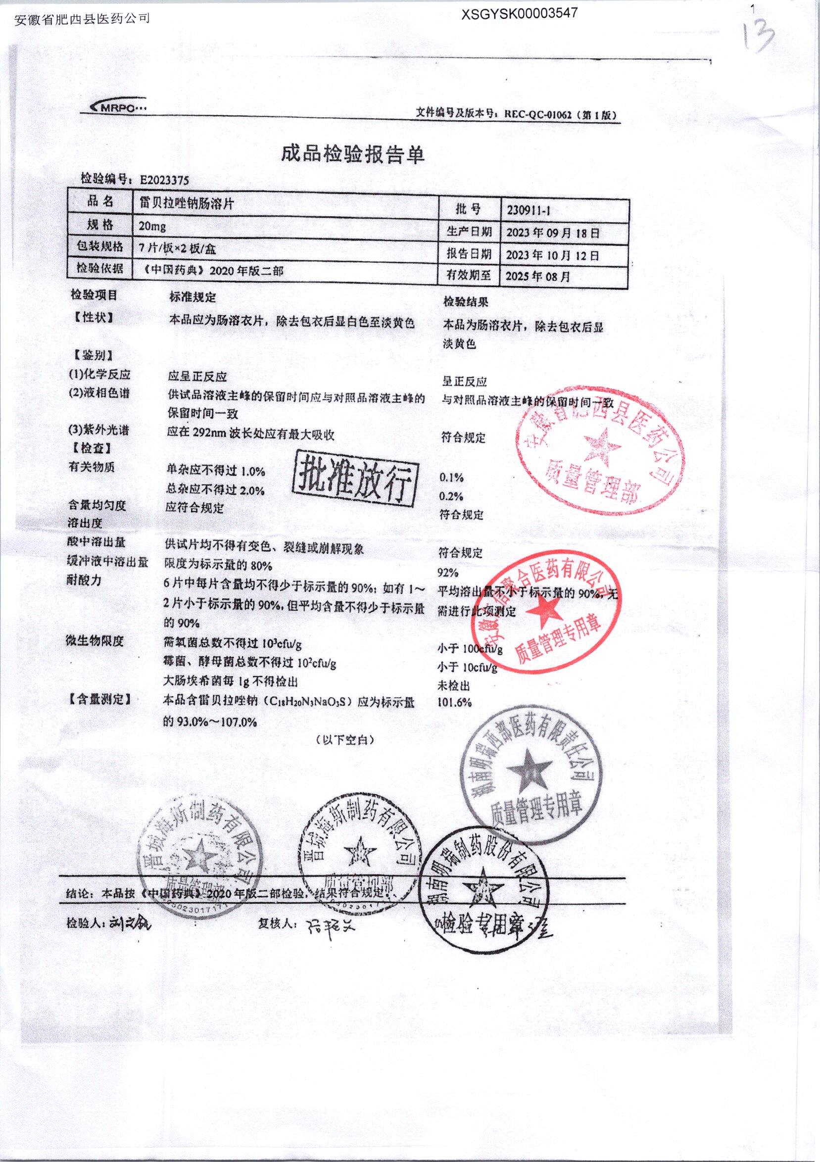 | 雷貝拉唑鈉腸溶片 | 20mg*14片 | 20250908/1 | 查看詳情 |