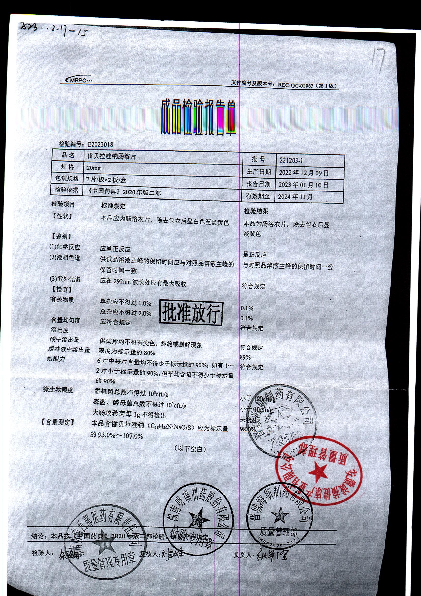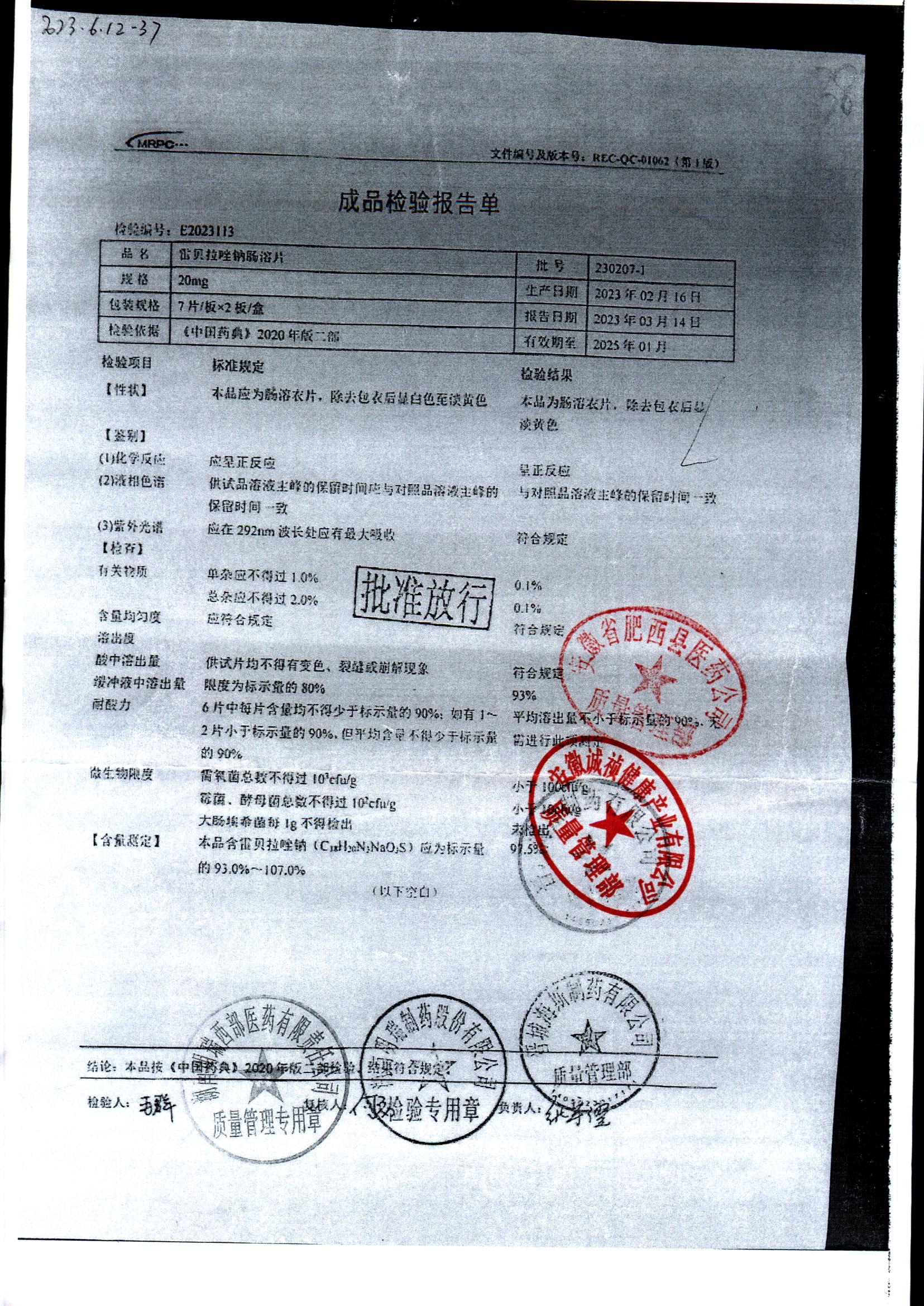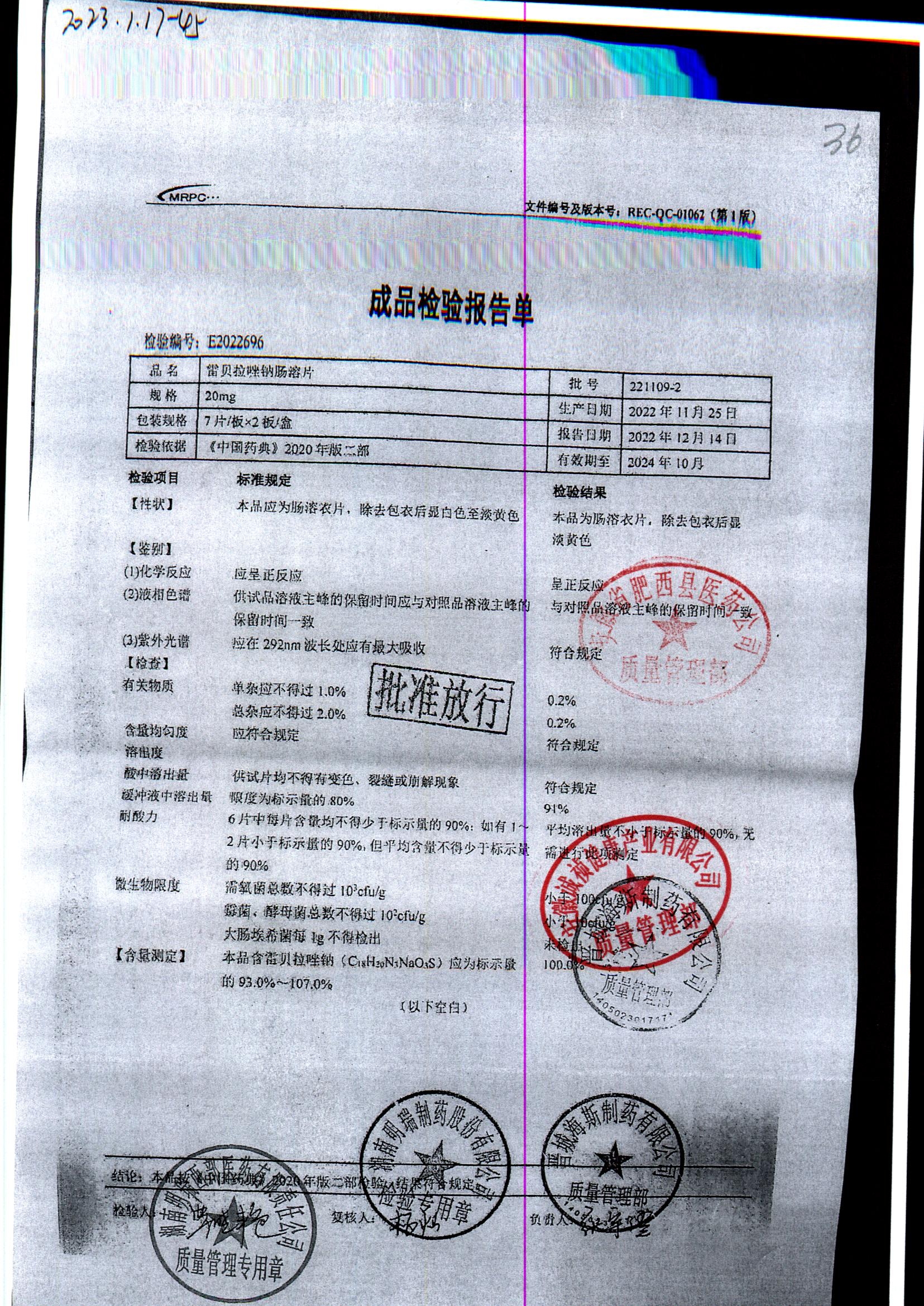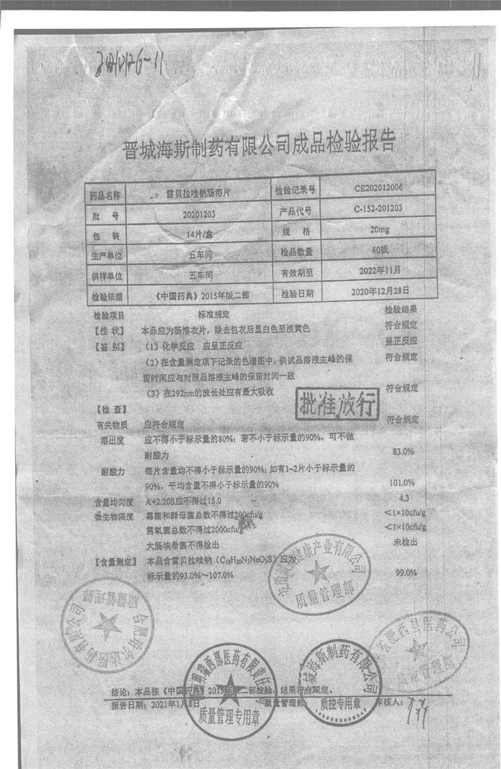 | 雷貝拉唑鈉腸溶片 | 20mg*14片 | 20210109 | 查看詳情 |