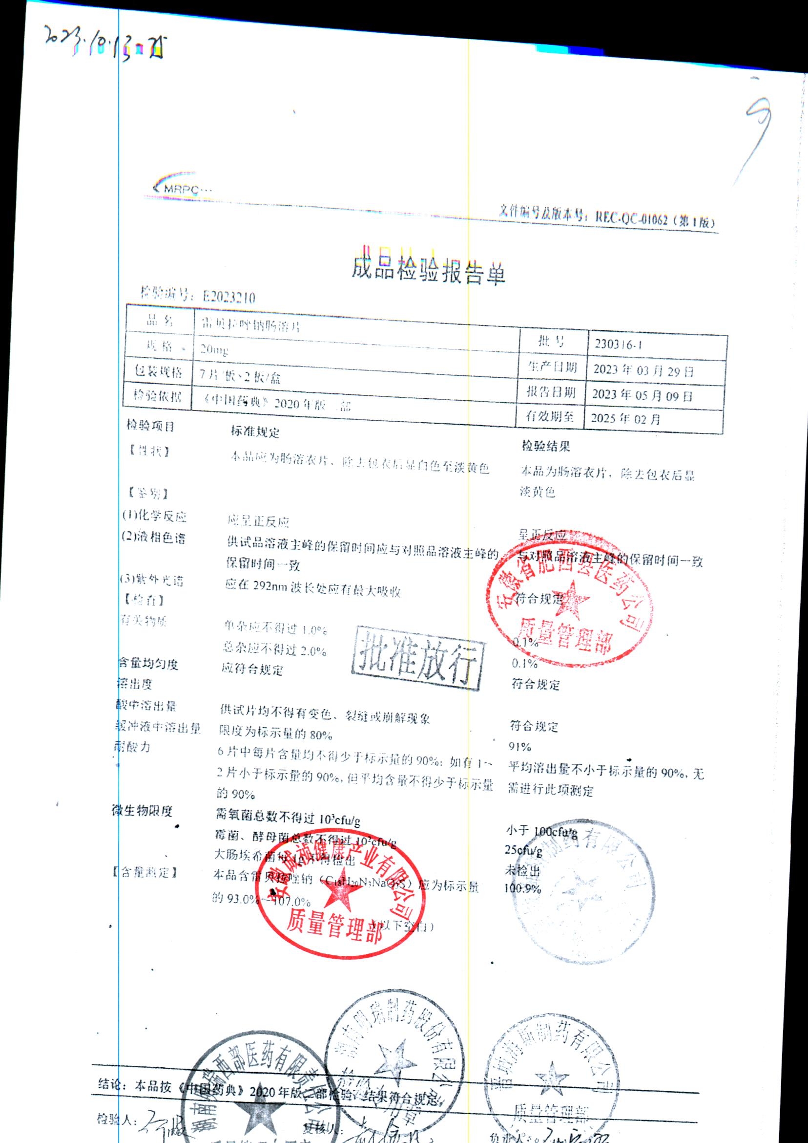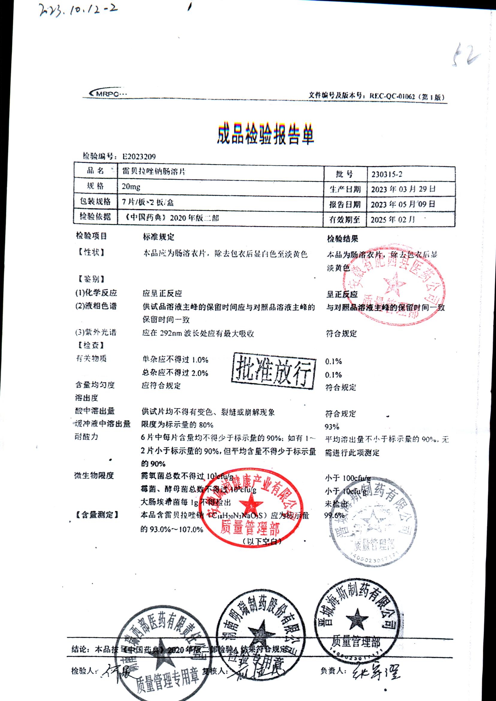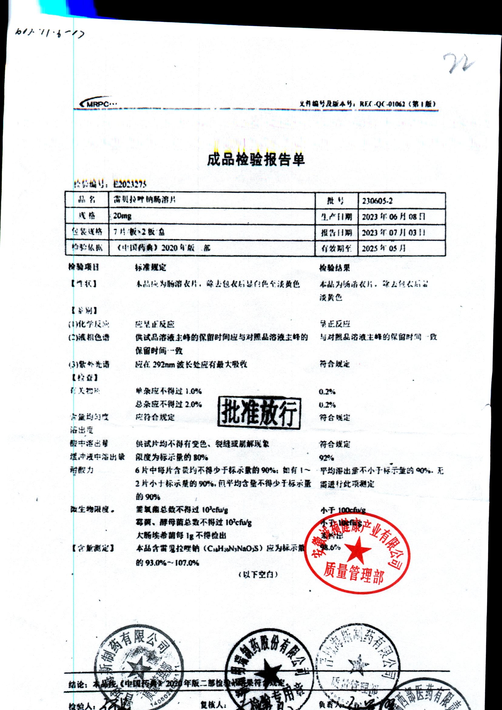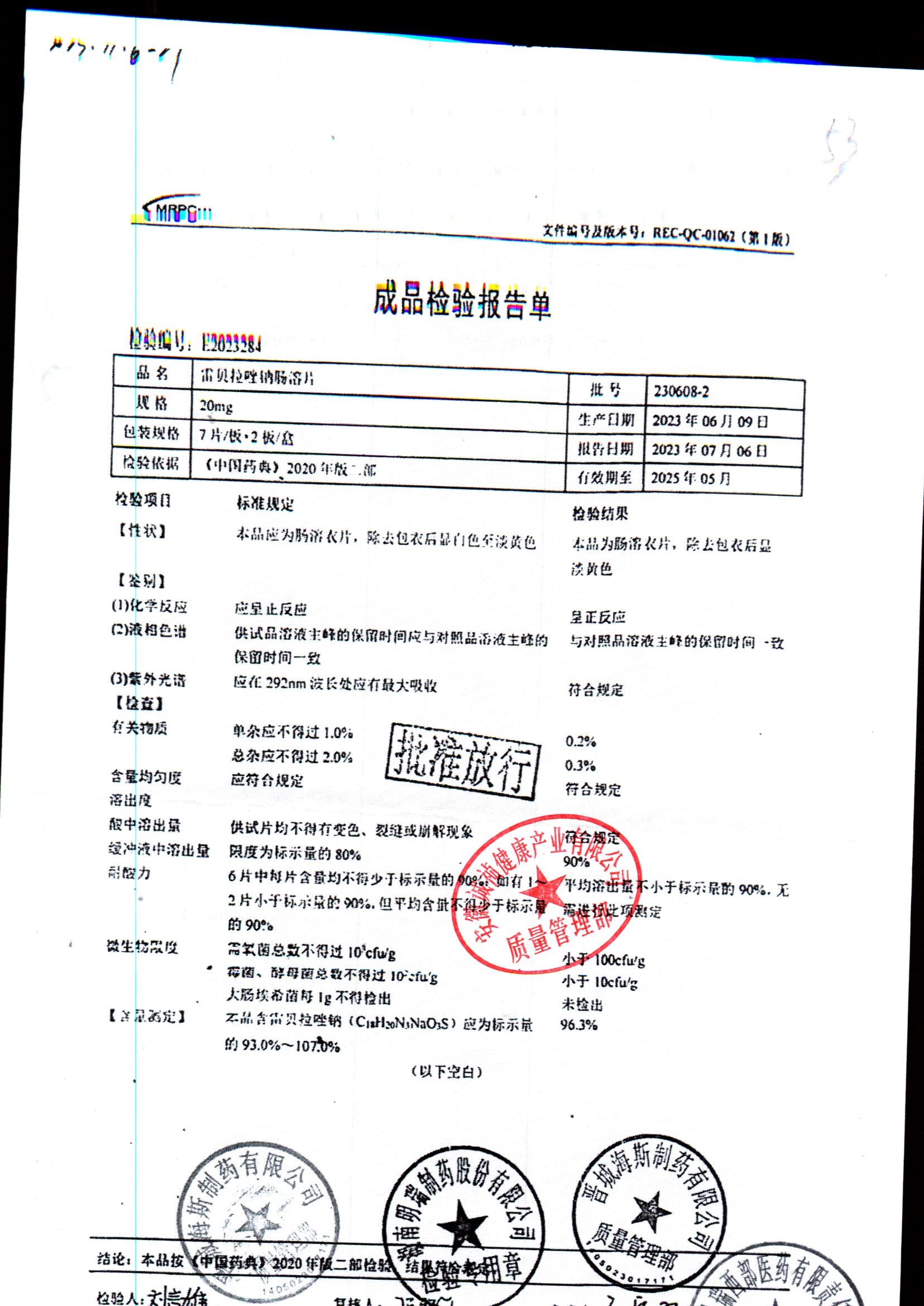 | 雷貝拉唑鈉腸溶片 | 20mg*14片 | 20210503 | 查看詳情 |