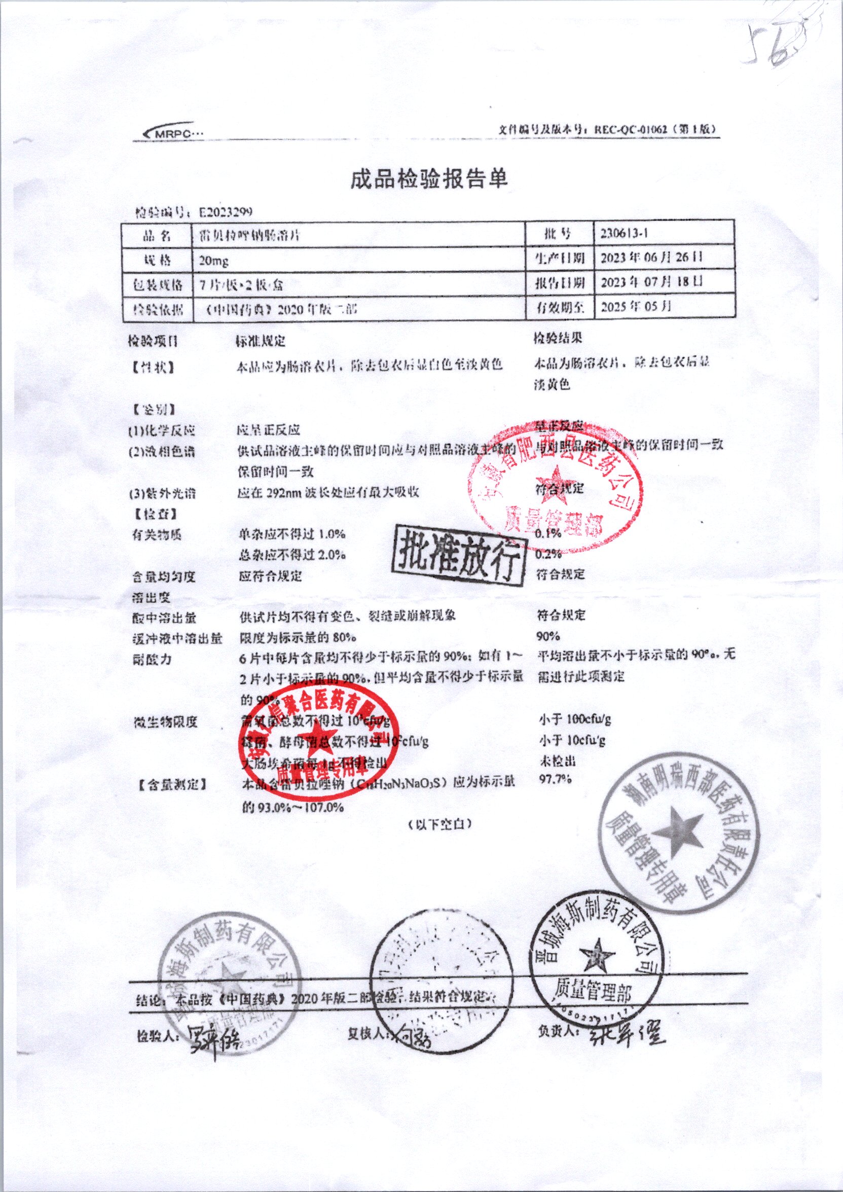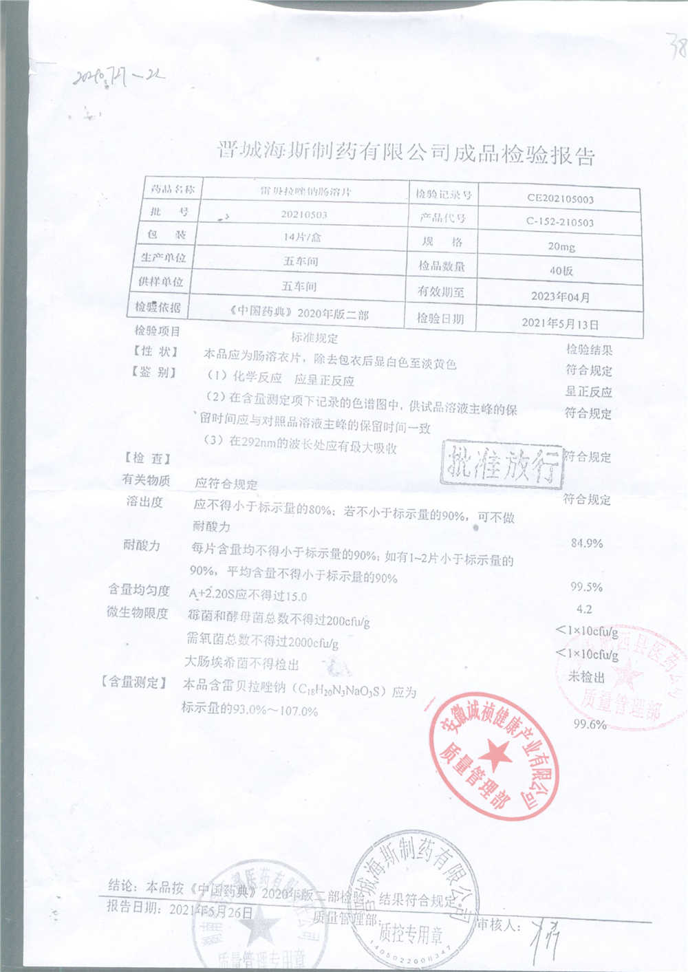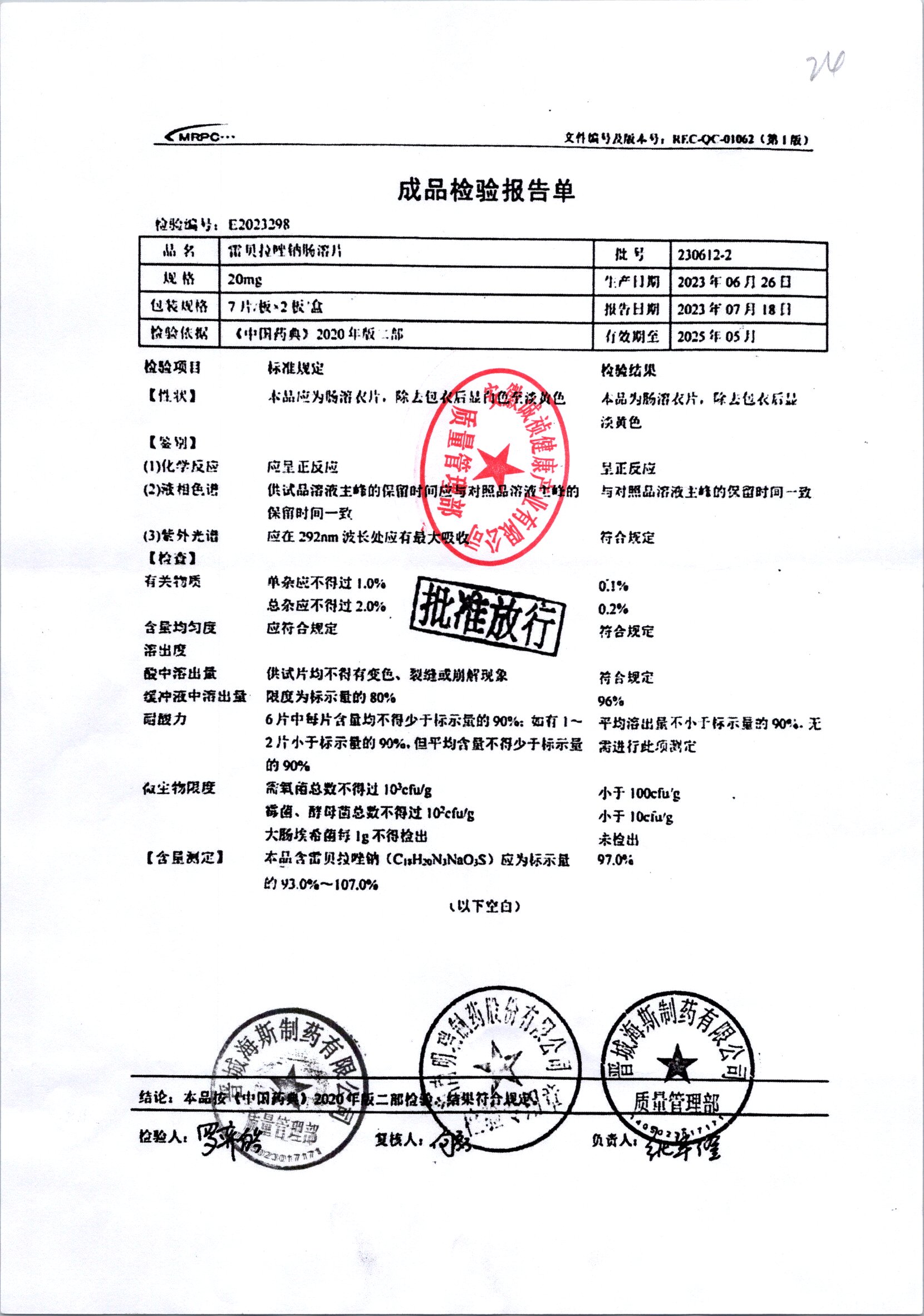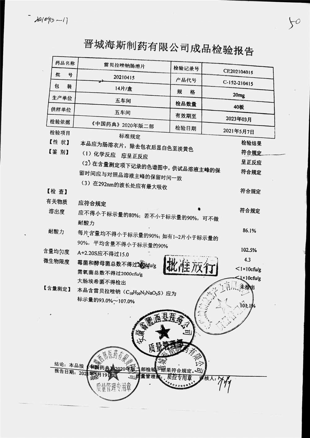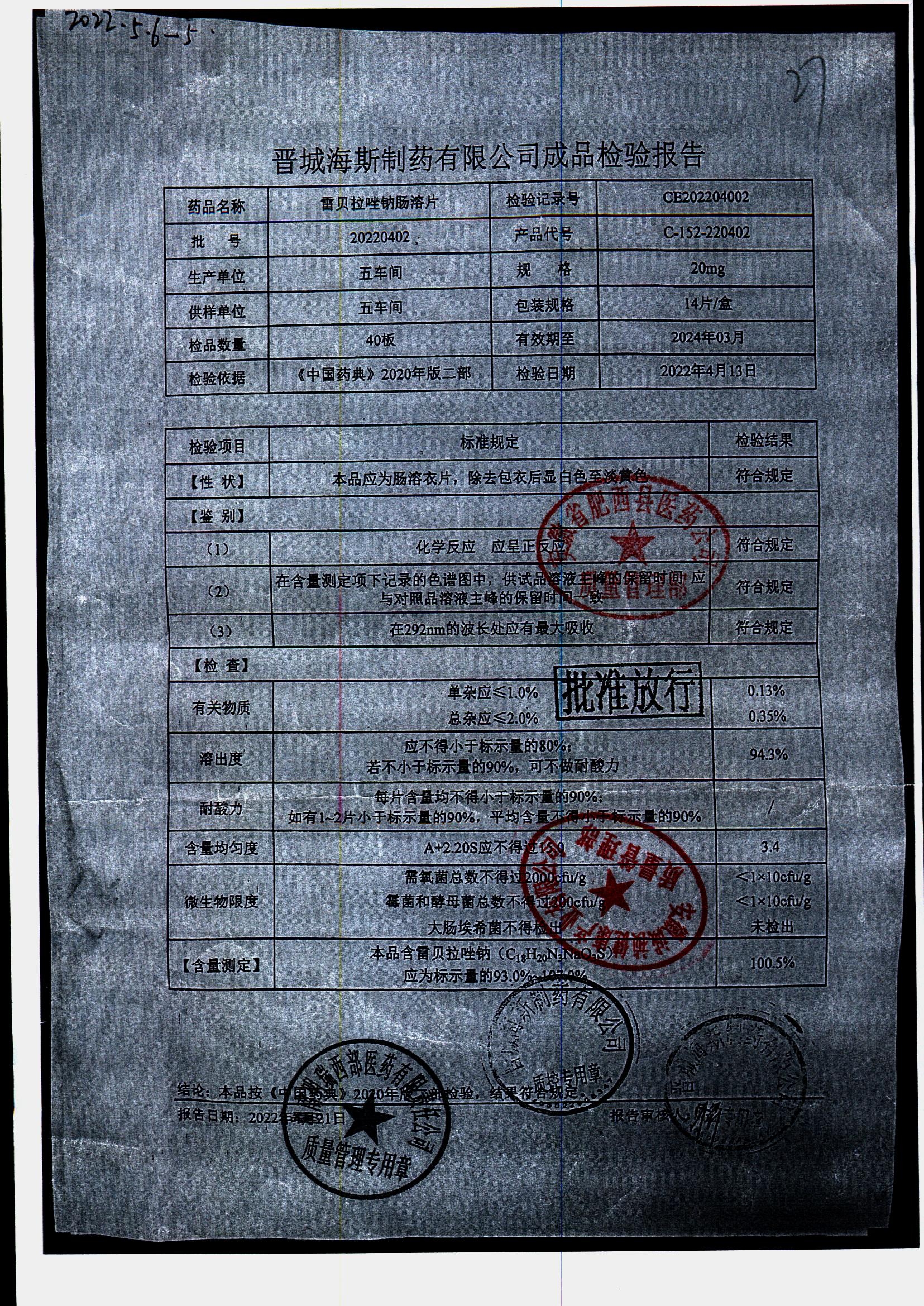 | 雷貝拉唑鈉腸溶片 | 20mg*14片 | 20210503 | 查看詳情 |